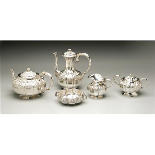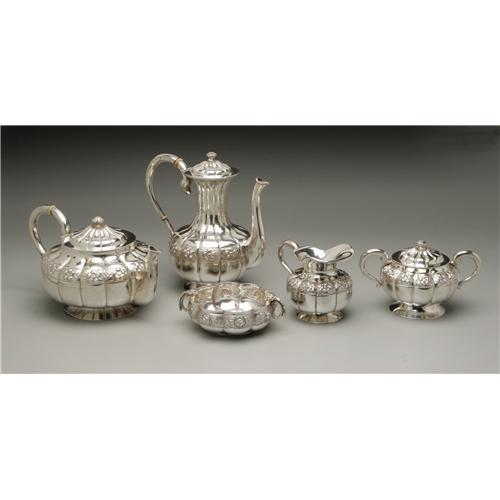 <B>A Mexican Silver Tea Service</B></I><BR><B>Sanborn Hermanos, S. A., Mexico, Early Twentieth Century</B></I><BR><BR>Comprising a tea pot, coffee pot, creamer, lidded sugar bowl and waste bowl, hallmark to the underside, total weight 102.4 Troy ounces<BR>The teapot: 5.3in. high x 10.5in. wide