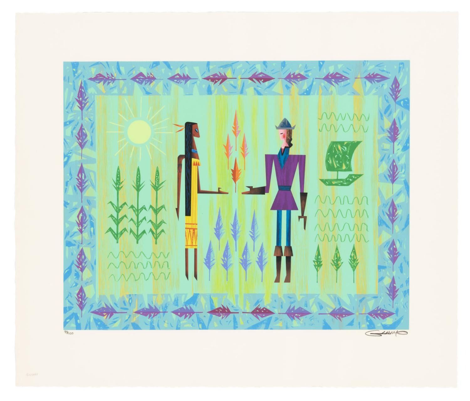 (Giaimo, 1995) A limited edition silkscreened print titled "Pocahontas Interpretation" designed by the film's Art Director Michael Giaimo. Numbered 93 of only 100, the print measuring 23.75" x 28" is in fine condition.