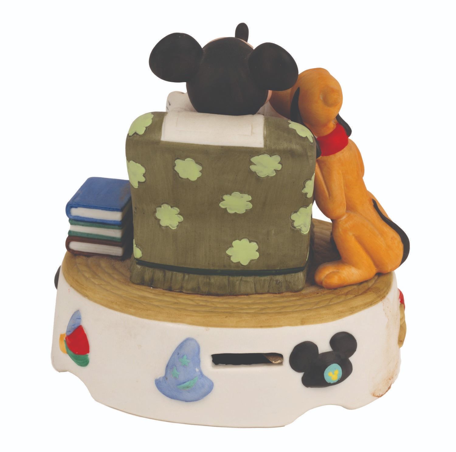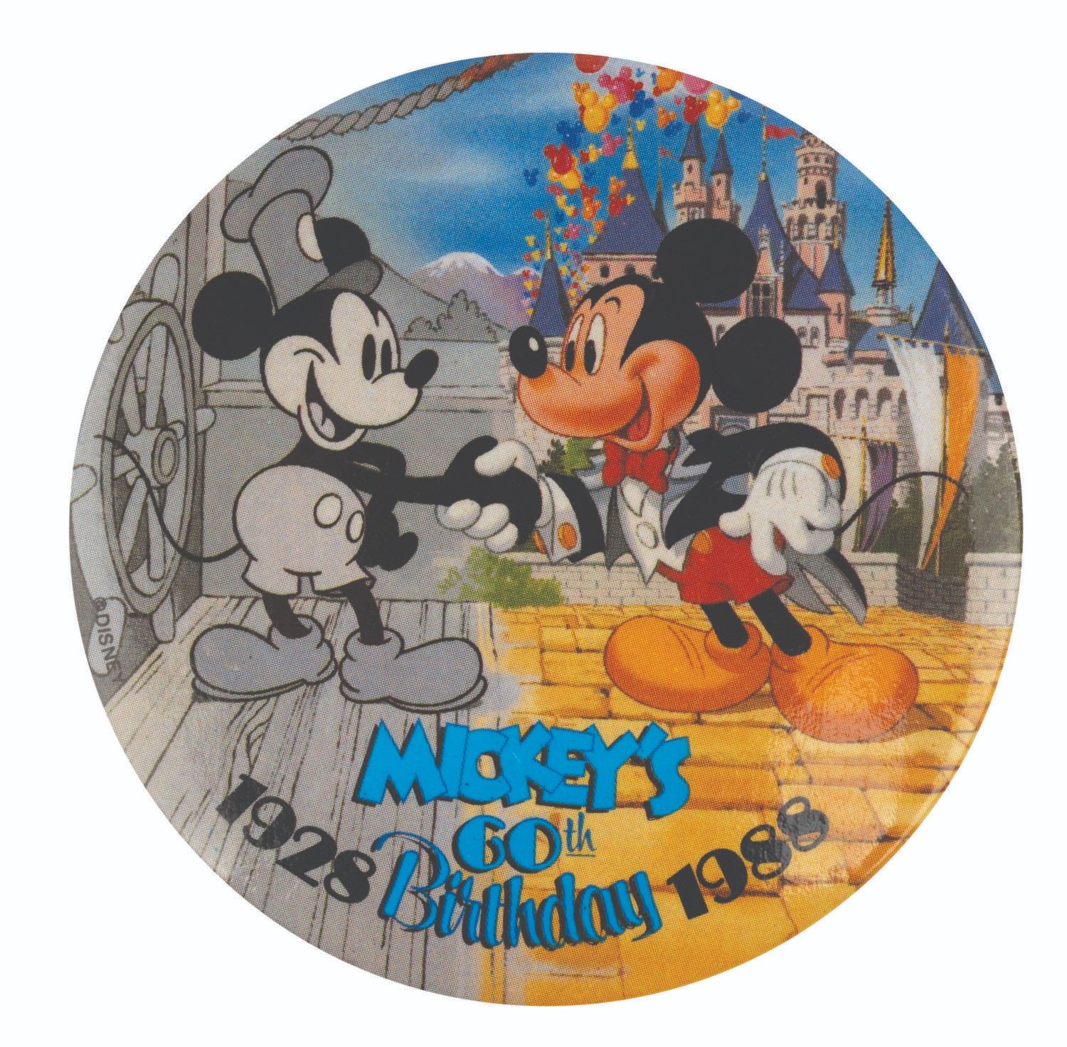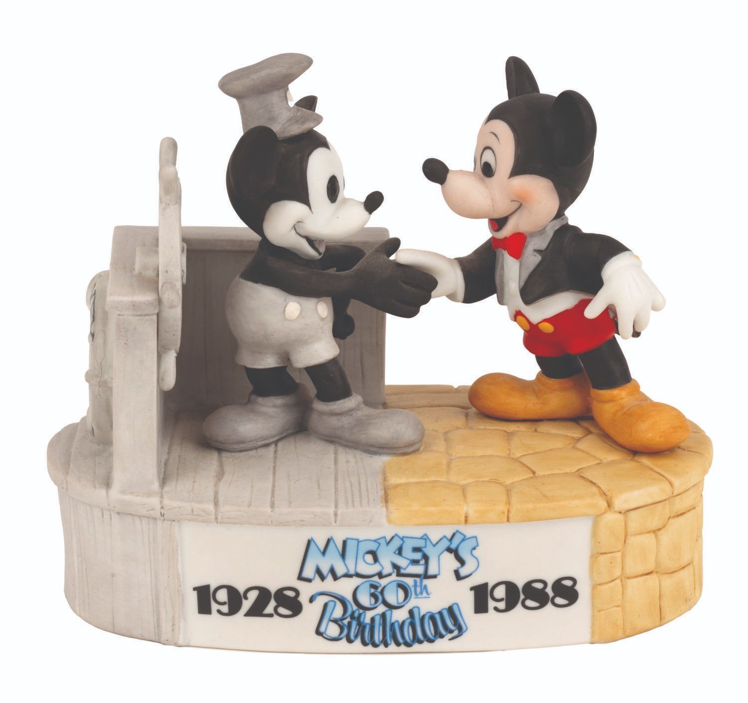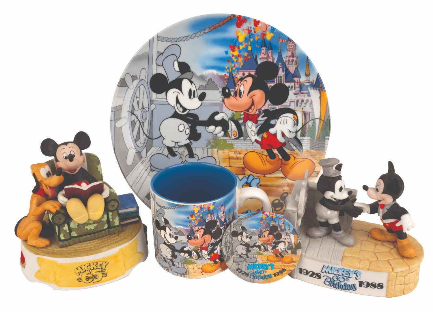 (Disney, 1988/1993) A collection of commemorative items from Mickey Mouse's 60th and 65th anniversaries. Included are a plate, mug, button, and figurine from the 60th featuring Steamboat Willie Mickey shaking hands with the modern mouse, and a 65th anniversary music box of Mickey and Pluto that plays the Mickey Mouse Club March. Measuring from 3" in diameter up to 5.5" x 4.25" x 5.5" tall, the pieces are in very good to fine condition.