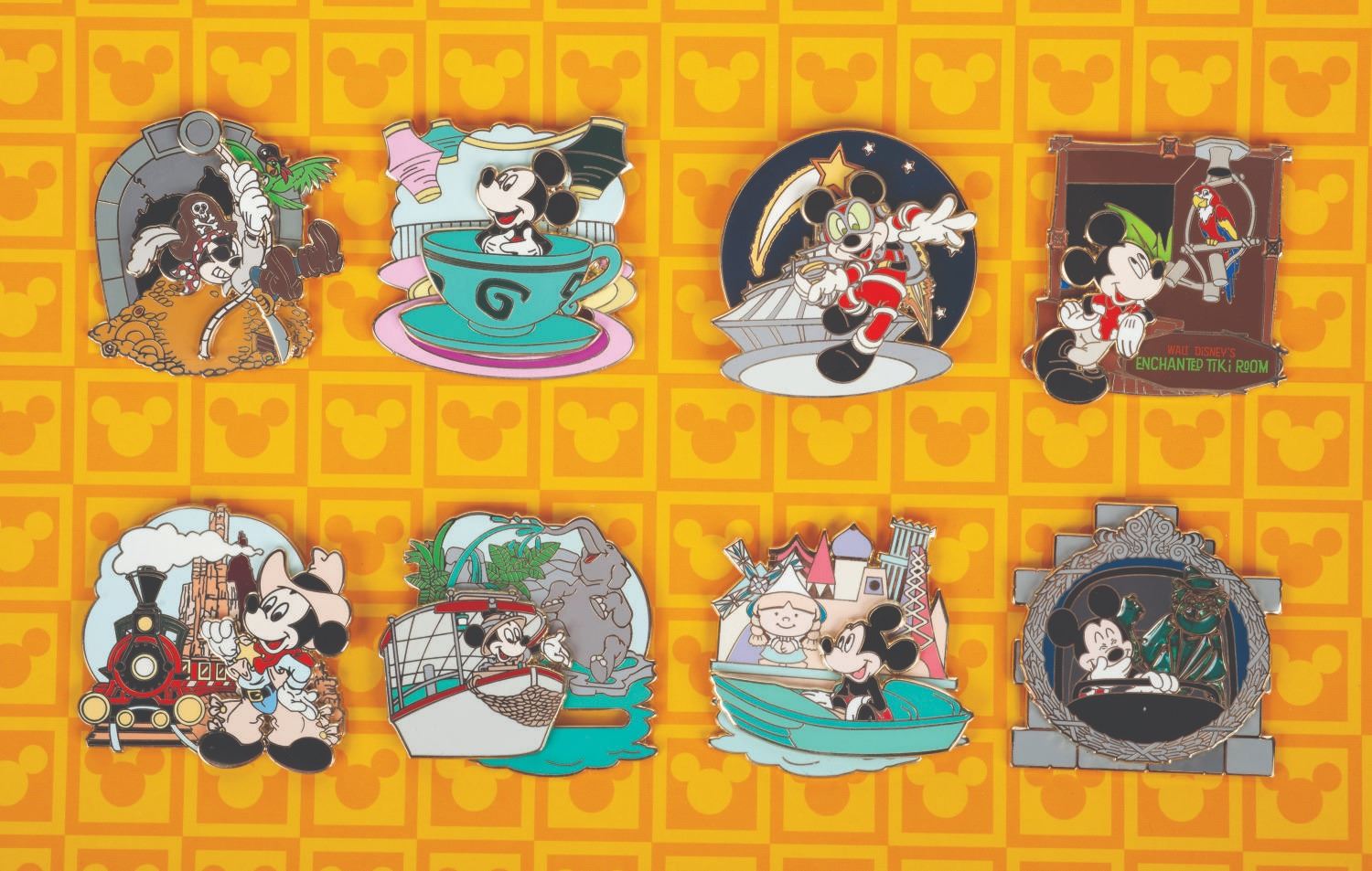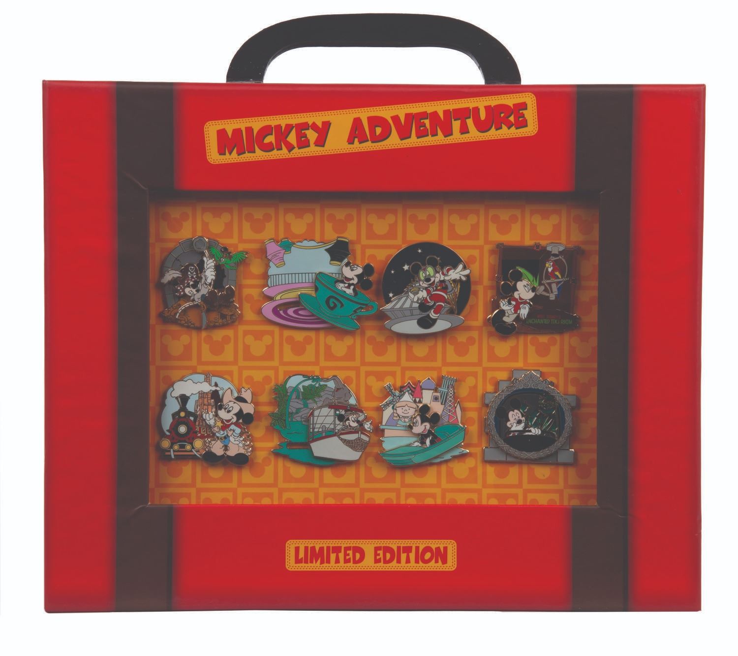(Disney Parks, 2010) A Mickey Adventure eight pin set featuring Mickey enjoying classic Disney Theme Park attractions. Released in an edition of 1800, each pin is in fine, as-new condition. The original 9.75” x 12” x 1.75” deep box is in very good condition with light creases along the edges.