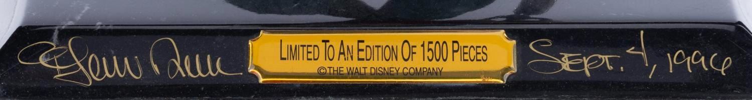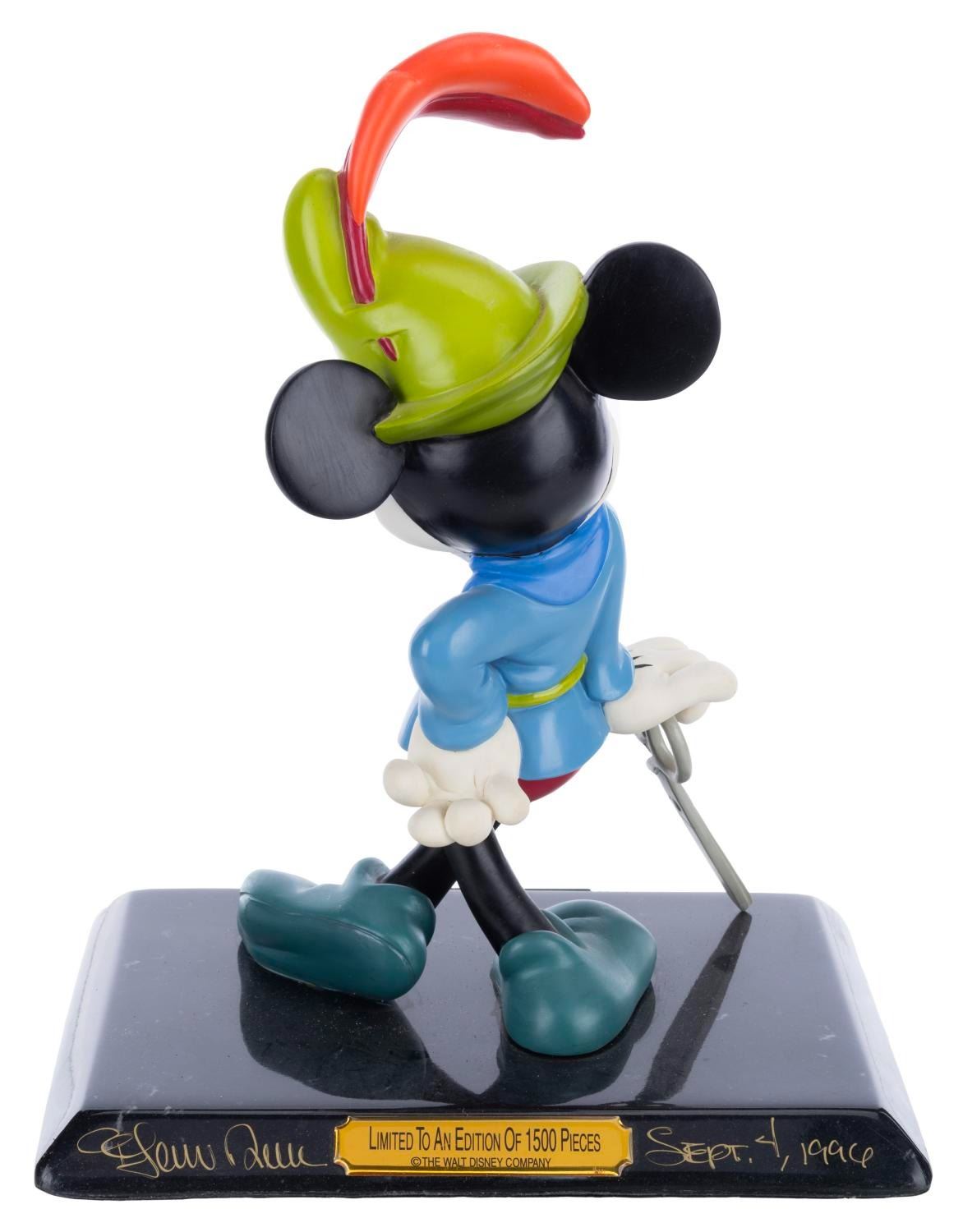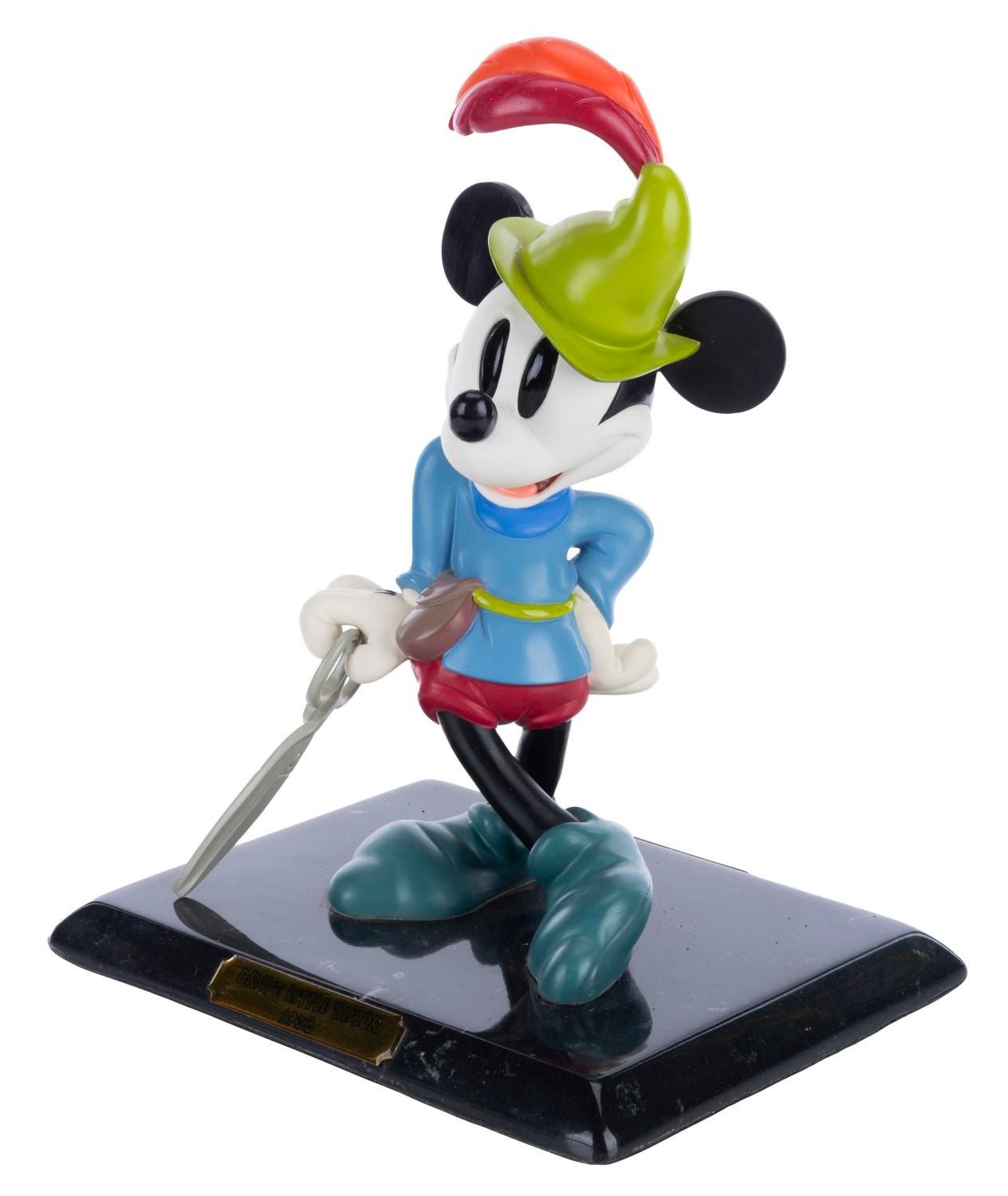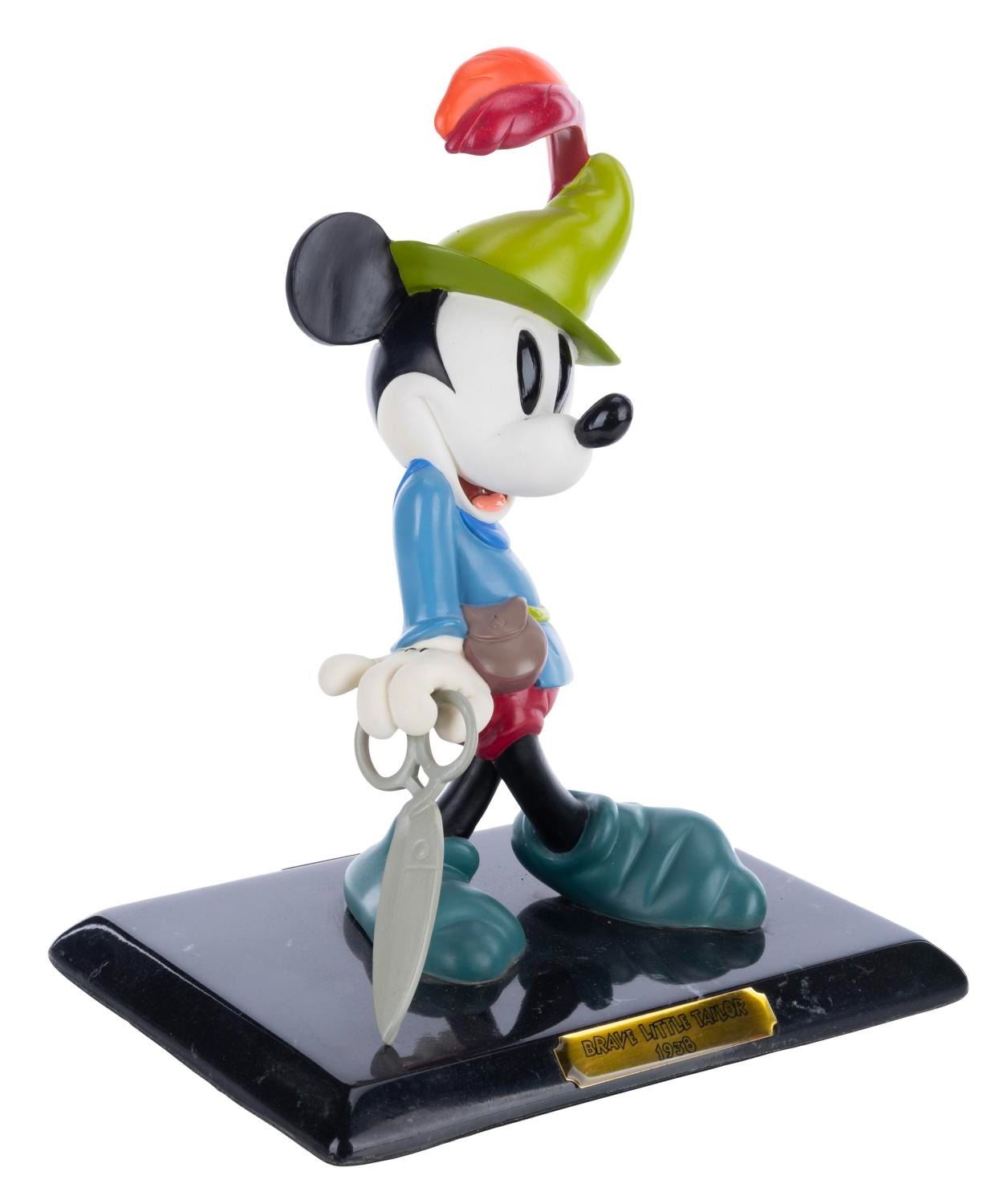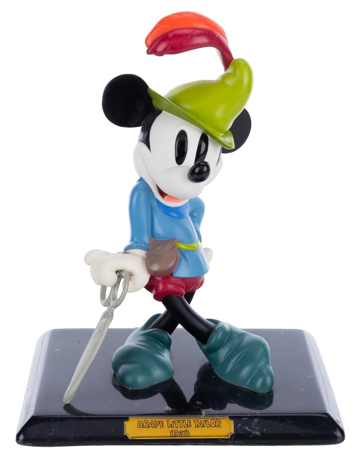 (Disneyana, 1996) A statue of Mickey Mouse as he appeared in "The Brave Little Tailor," produced for the 1996 Disneyana Convention in an edition of 1500 pieces and hand-signed by designer Marc Delle. Measuring 9"x7" and 11.5" tall, the resin statue is in very good condition with light wear to the plaques.