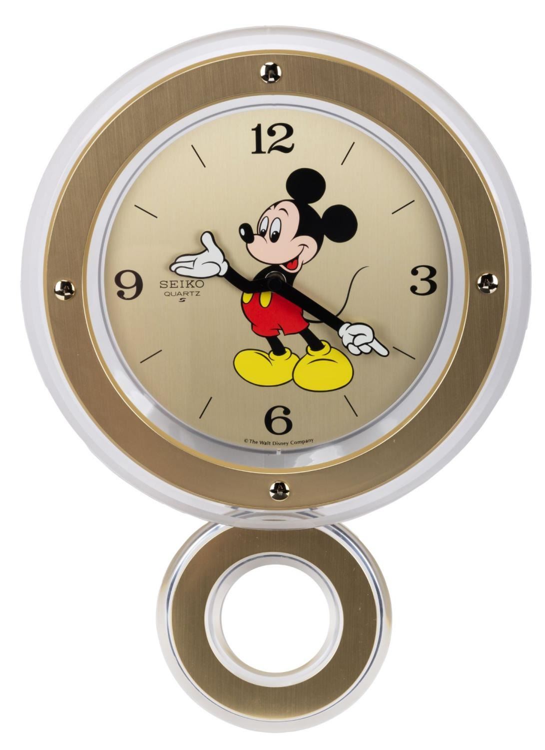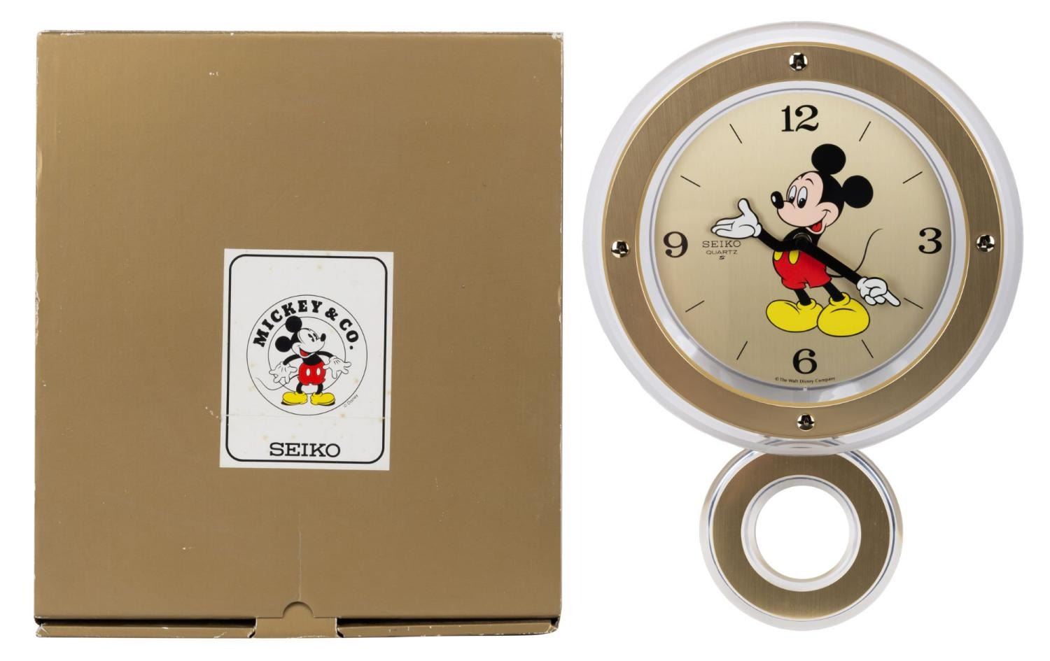 (Seiko, 1980s) A Mickey & Co. quartz wall clock manufactured by Seiko. When tested, the clock functioned properly, requiring one AA battery (not included). Measuring 16” tall and 11” in diameter with its original 13.25” x 15.25” box, the clock is in very good condition with light scratches and wear.