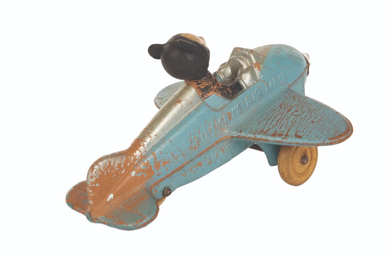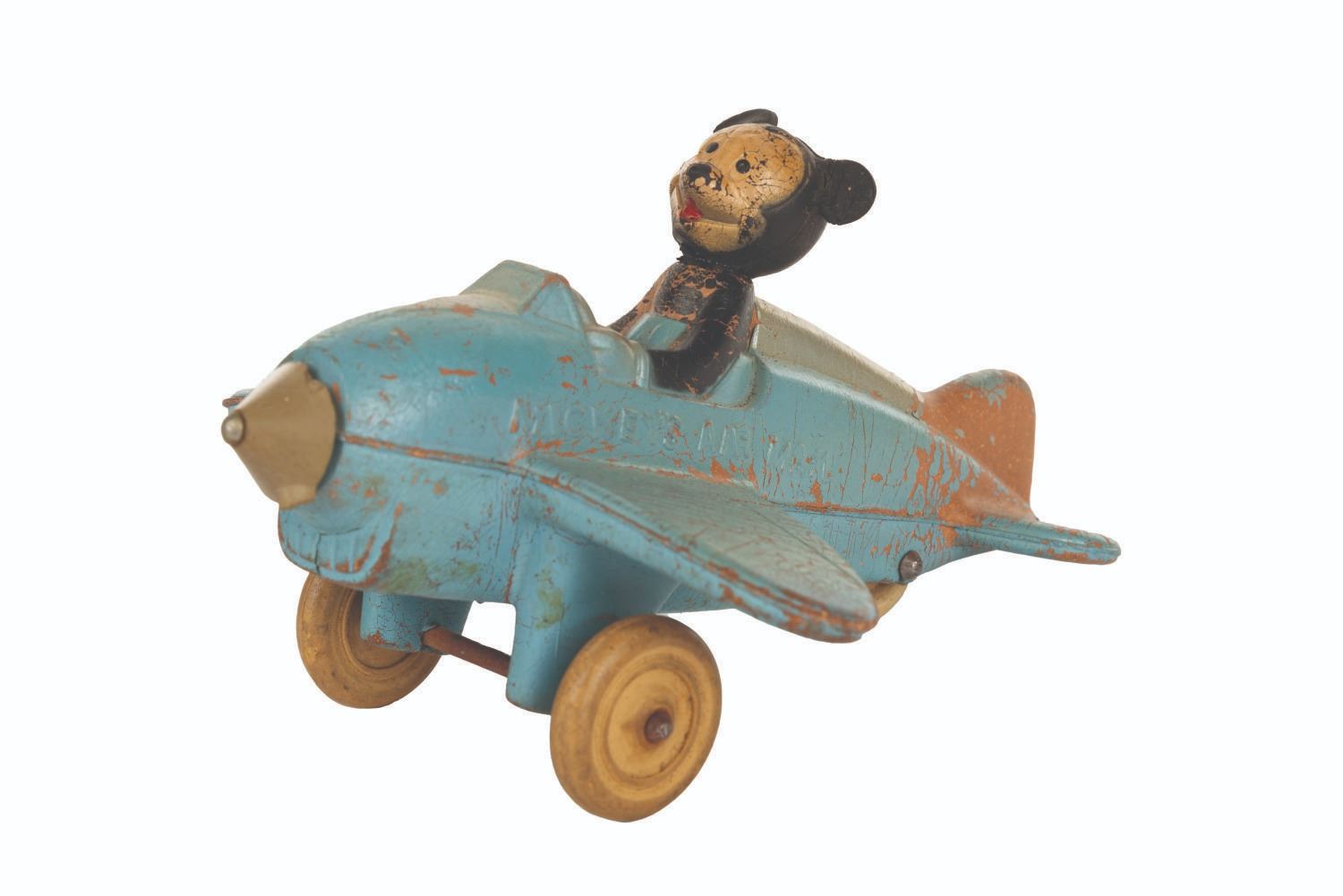 (Viceroy/Sunroco, 1950s) A rubber Mickey Mouse Aeroplane Disney Wheel Toy produced by Viceroy & Sunroco. The right wing bears the number S-12019, and Mickey's Air Mail is written on both sides of the plane's body. Mickey's head has been reattached with hot glue. The wheels are in good condition. Measuring 7”x5”, this toy is in fair condition with wear overall and missing its propellor blades.