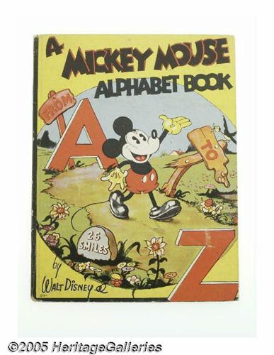 <B>A Mickey Mouse Alphabet Book From A to Z (Whitman, 1936).</B></I> Mickey walks between signs reading "From A to Z," on the cover to this Whitman Publishing Company book #936. The cover art is repeated front and back. Measuring 7" x 9," this beautiful copy has 32 stiff interior pages, printed in black and red. This book tells a story using the letters of the alphabet to tie things together and characters featured are Mickey, Minnie, Pluto, Horace, Clarabelle, and a Pegleg Pete-like villain, "The Robber." The pages feature full page art to go along with each letter of the alphabet, plus text describing the scene. The inside front cover has a designated area for the owner's name and address, which was filled in in pencil and pen and ink. The cover and contents are lightly aged (they're nearly 70 years old!), but quite clean. This is a very solid copy of this scarce book, in Very Fine condition. <I>From the Larry Jacobs Collection.</B></I>