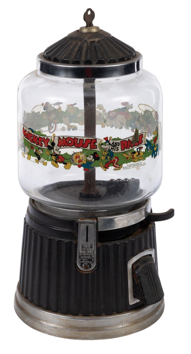 (Hamilton Enterprises, 1938) A rare 1930s "Mickey Mouse And His Pals" gumball machine. The 14" tall and 7" diameter gumball machine features a black porcelain finish and stainless steel fittings with an Owen's crystal bowl and a theft-proof slot mechanism. The interior surface of the bowl has a wrap-around decal featuring multiple images of Mickey, Minnie and their nephews, Donald and his nephews, Goofy and Pluto. Images include them having a parade, circus theme, and western theme. It was designed for countertop use but it could also be mounted on a stand for floor use. There is wear at the coin slot and few small traces of wear to the porcelain finish. The Decal remains clear, and distinct and near 100% complete with scratches throughout from years of use. The mechanism needs servicing to work properly but is complete and comes with key.