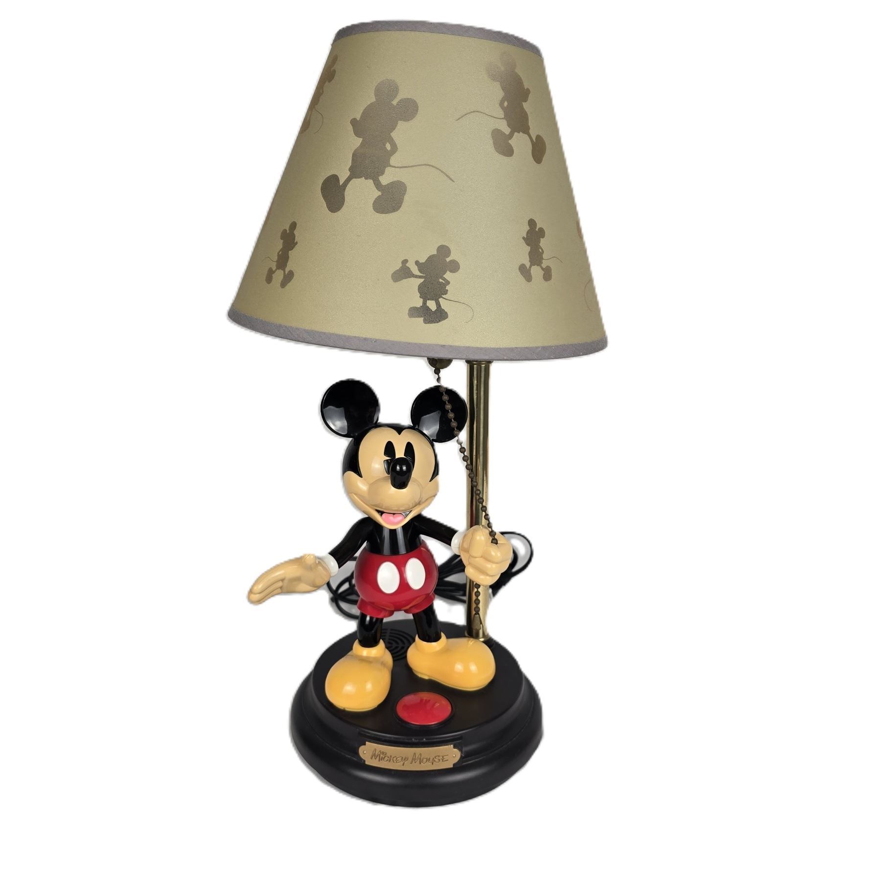 (Creative Joes) This is a fun lamp where Mickey Mouse does all the work for you. With the press of the button, Mickey Mouse pulls the chain turning on or off the lamp. Each button press includes a cute phrase from Mickey Mouse. It is in excellent condition and is tested and fully operational. Check out our Youtube video to see it in action. It measures 18.5 “ tall and is 10” in diameter with the shade. It weighs 2 lbs 14 oz.