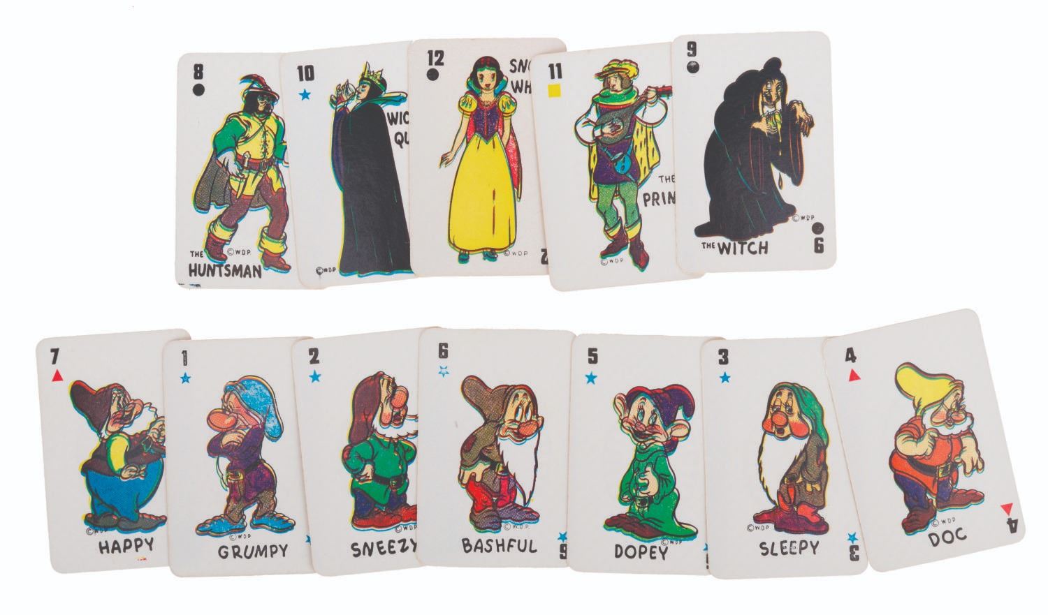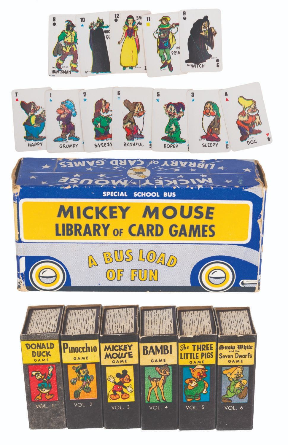(Russel’s, 1940s-50s) A Mickey Mouse Library of Card Games by Russel’s Popular Games, featuring six Disney character card games packaged within a Bus-shaped box. Measuring 6"x2"x2.75", the card sets and box are in good condition with creases, a few tears, and wear.