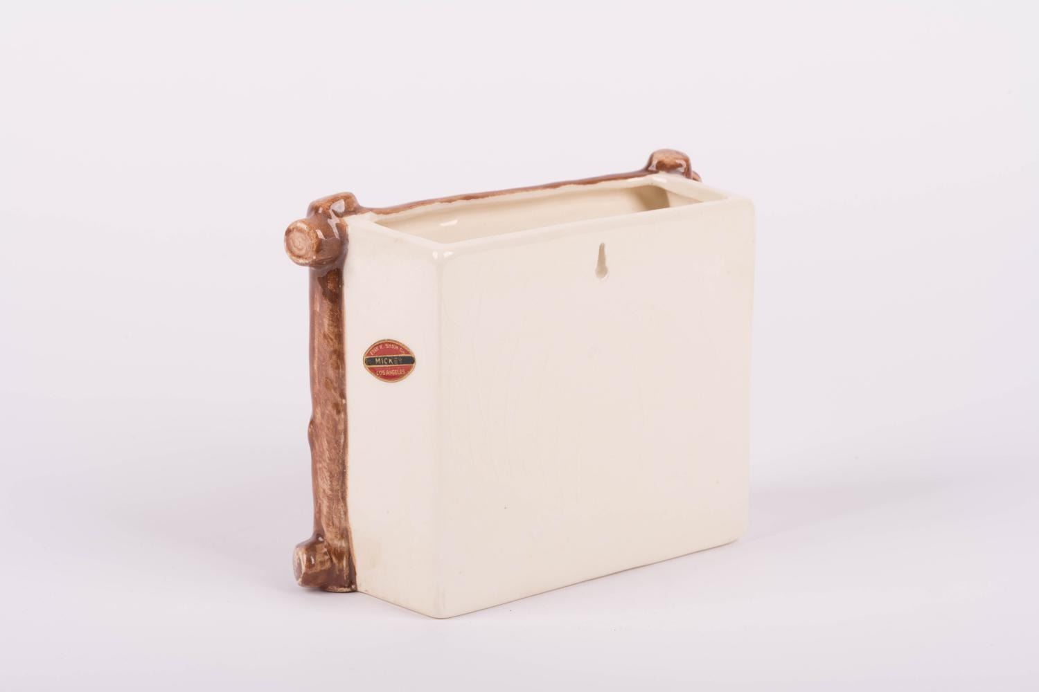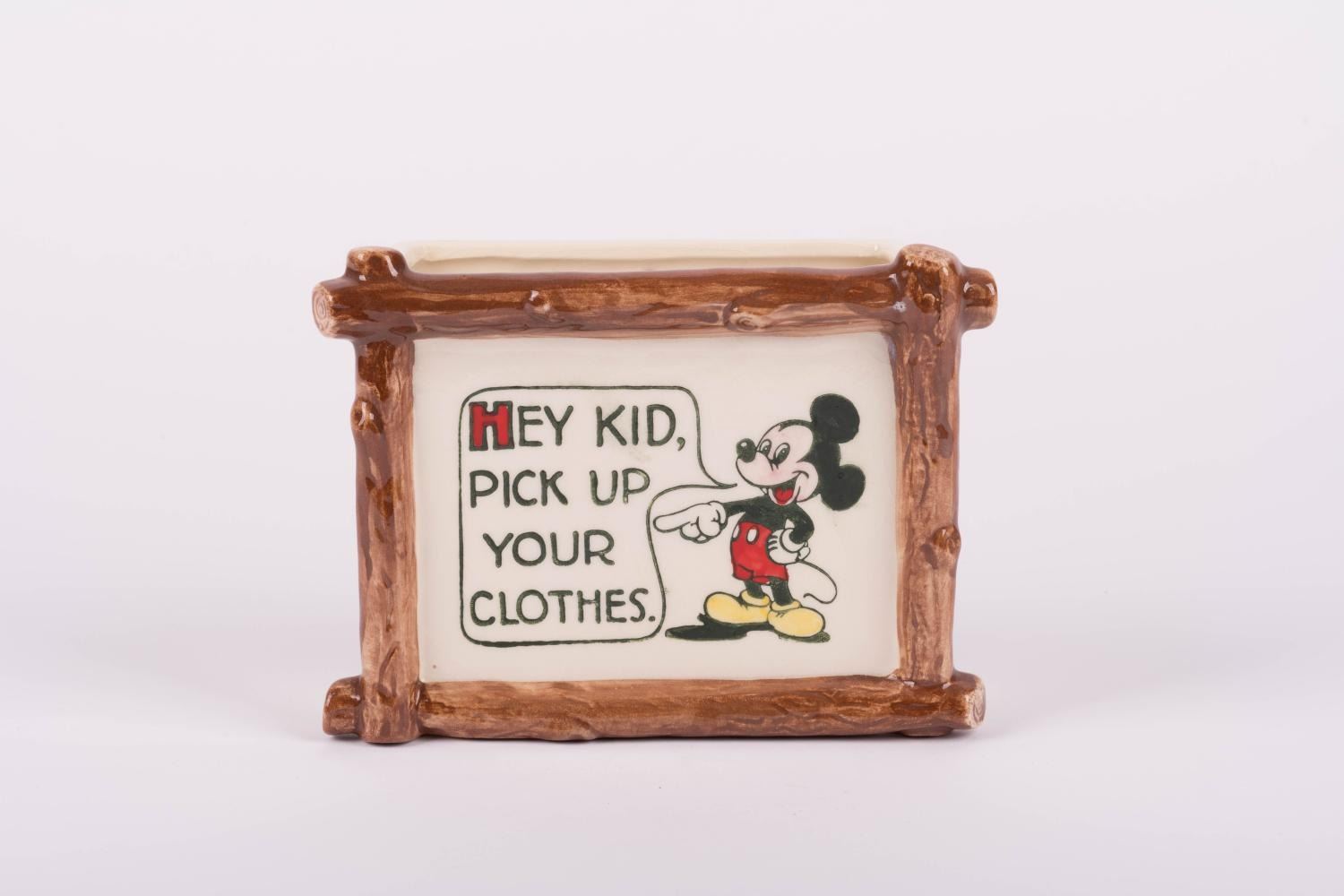 (Shaw, 1950s) A Mickey Mouse ceramic planter that reads"Hey Kid, Pick Up Your Clothes." Measuring 2.25" x 6.5" and 5" tall, the planter is in very good condition with crazing to the back.