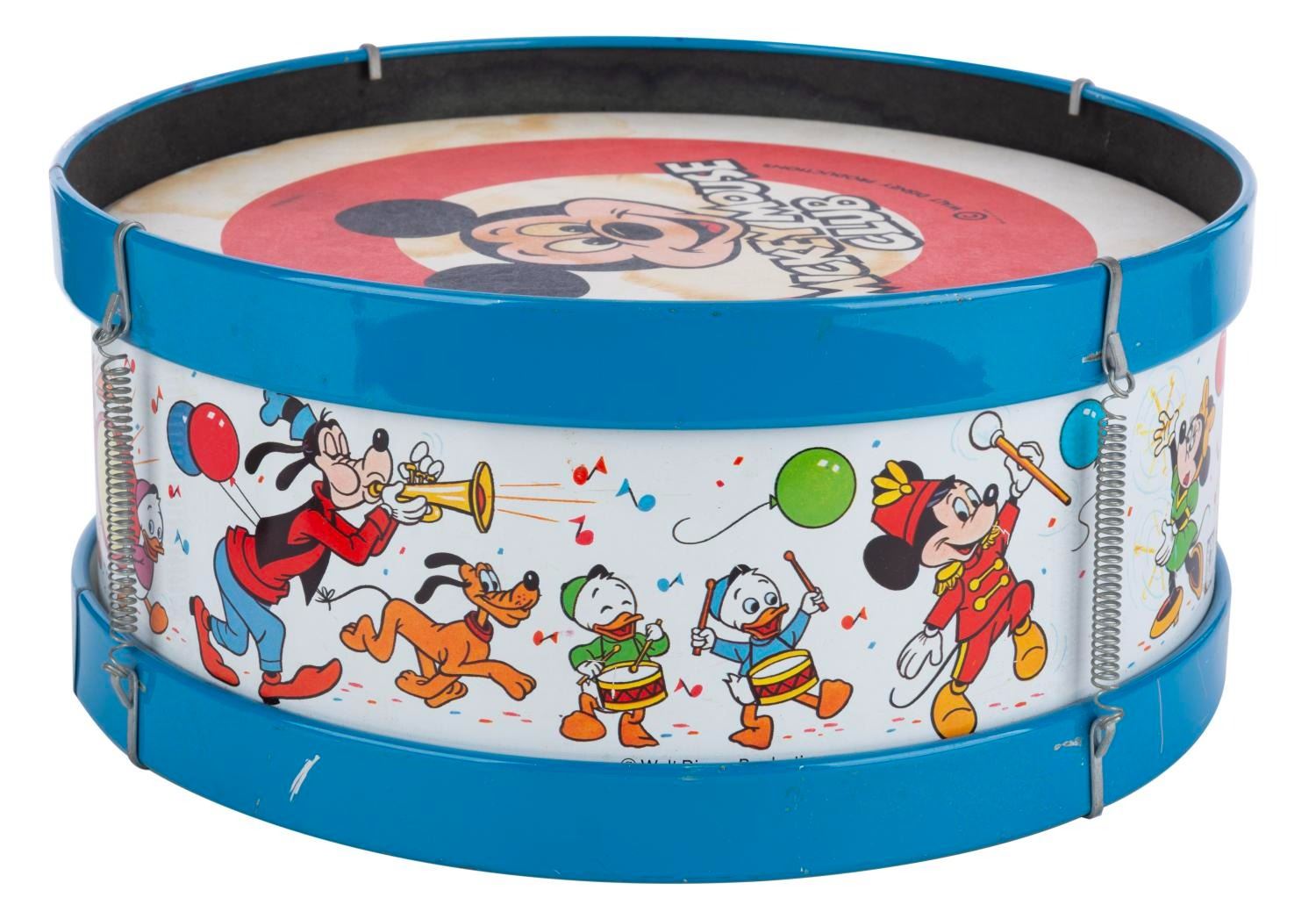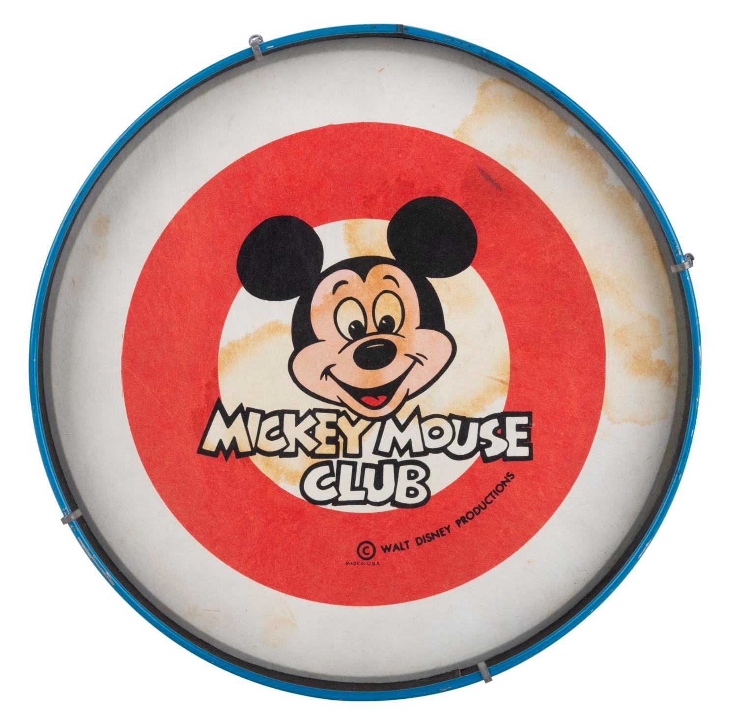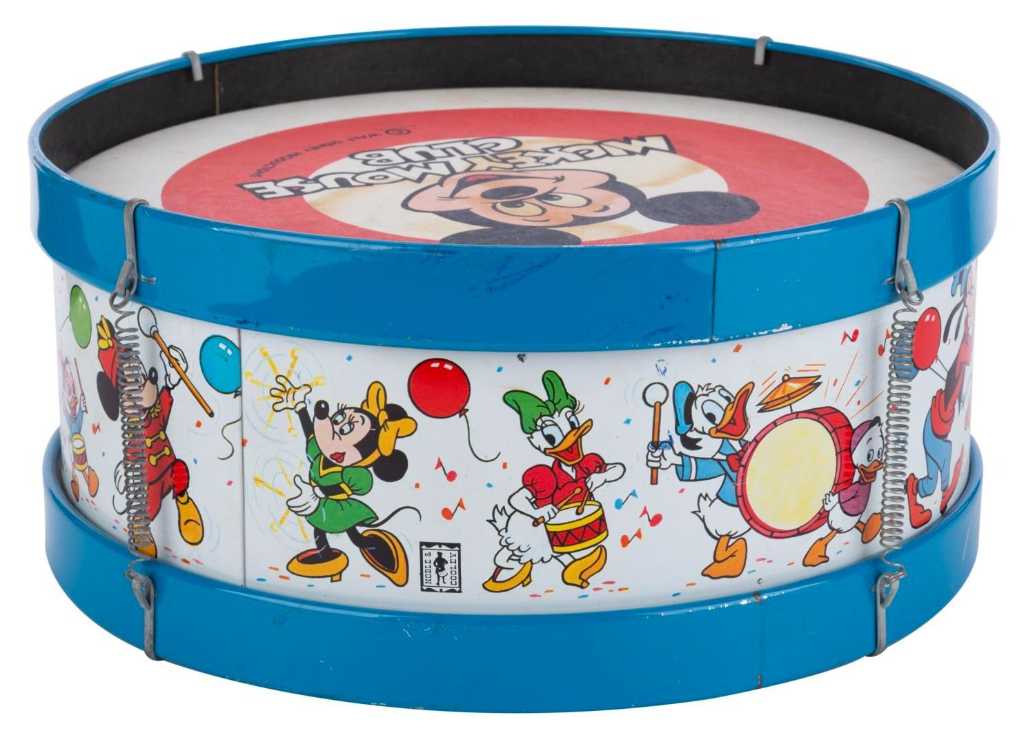 (Noble Cooley, 1950s) A Mickey Mouse Club Drum Toy with tin lithographic imagery of Donald, Goofy, Minnie, and “the leader of the club,” Mickey Mouse. Measuring 5” tall and 11” in diameter, the drum is in very good condition, with minor scuffs, faint scratches, and spots of yellowing to the drum head graphics.