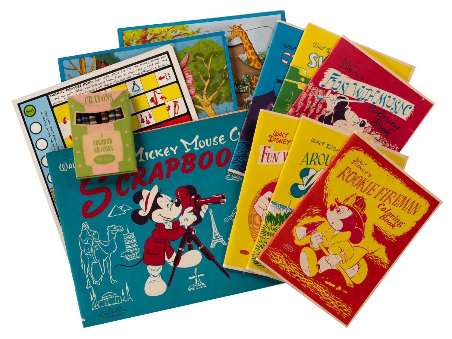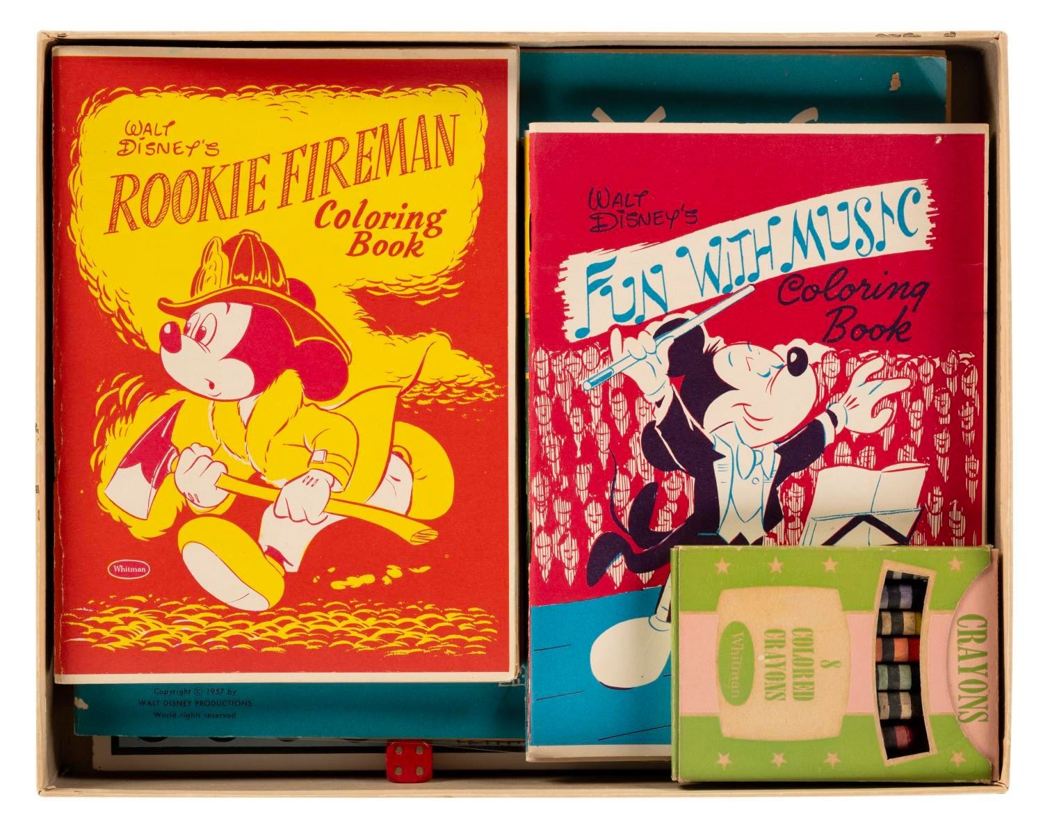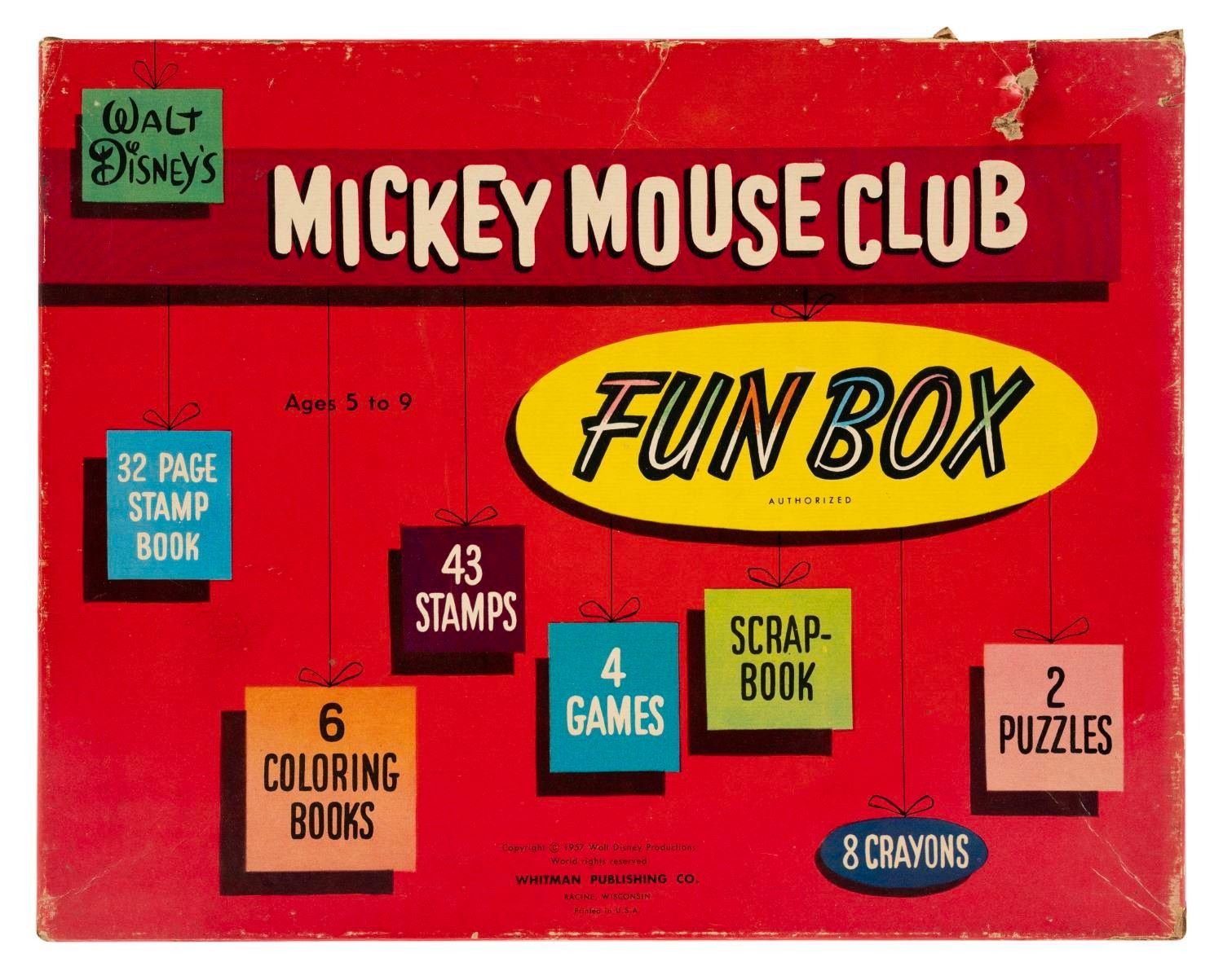 (Whitman, 1957) A Walt Disney’s Mickey Mouse Club Fun Box, including 6 coloring books, 4 games, 2 puzzles, and a scrapbook. The set is missing its stamp book, stamps, and 1 of the 8 intended crayons. Measuring 9.25” x 12” x 1.75” deep, the fun box displays in good condition with creases, tears on the packaging, wear, and punched game pieces.