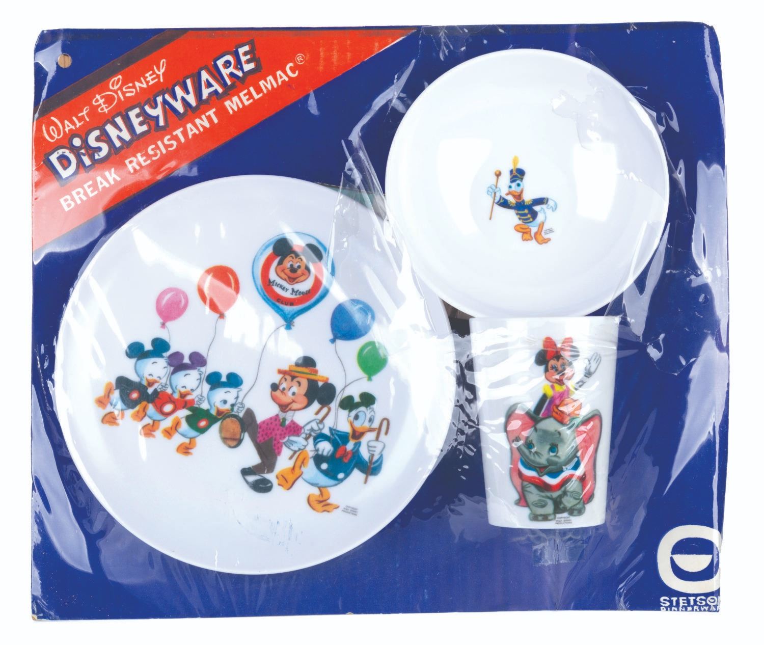 (Allied Chemical, 1960s) A set of Walt Disney Disneyware Melmac dishes featuring the Mickey Mouse Club logo and members of the "Fab Five." The set consists of one bowl, one plate, and one cup. Measuring 2.5" in diameter and 3.5" tall to 7.25" in diameter, the set is in very good condition with a tape residue running the height of the cup and two pieces of adhesive on the reverse of the bowl.