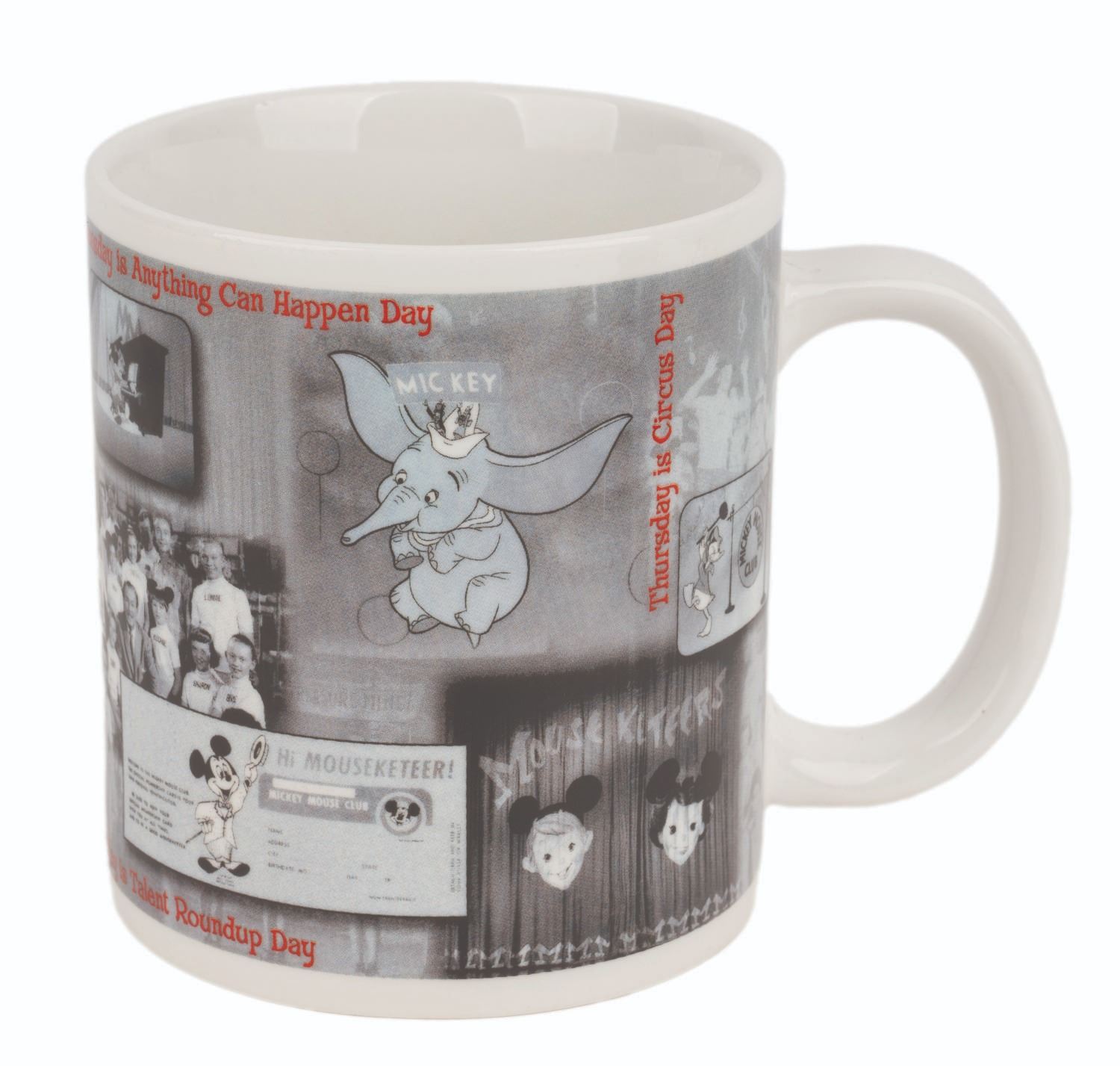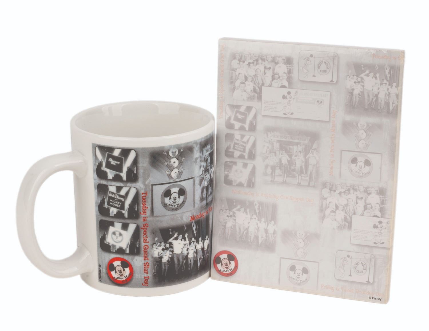 (Disneyland, 1990s-2000s) A Mickey Mouse Club notepad and coffee mug featuring photos of the original Mouseketeers. Measuring 5" x 6.75", the notepad is in very good condition in its original packaging with light scratches. The mug measures 4.5" x 5.5" and is in very good condition with some small black spots near the handle and light wear on the bottom.