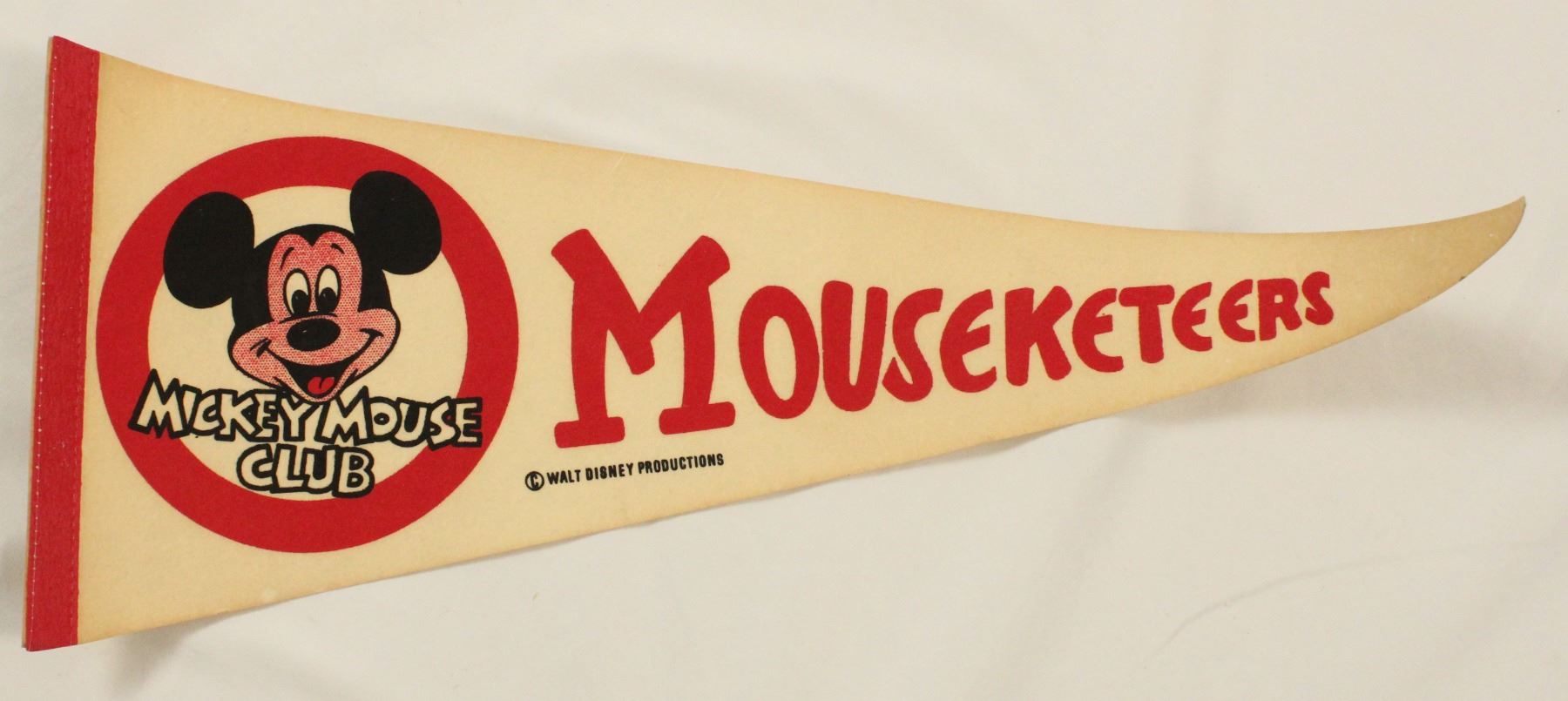 This is a red and cream colored pennant featuring the Mickey Mouse Club logo and "Mousketeers " in large red font. It is in good condition with some bending to the pennant and pin marks along the edges and point. It measures ~24" long.