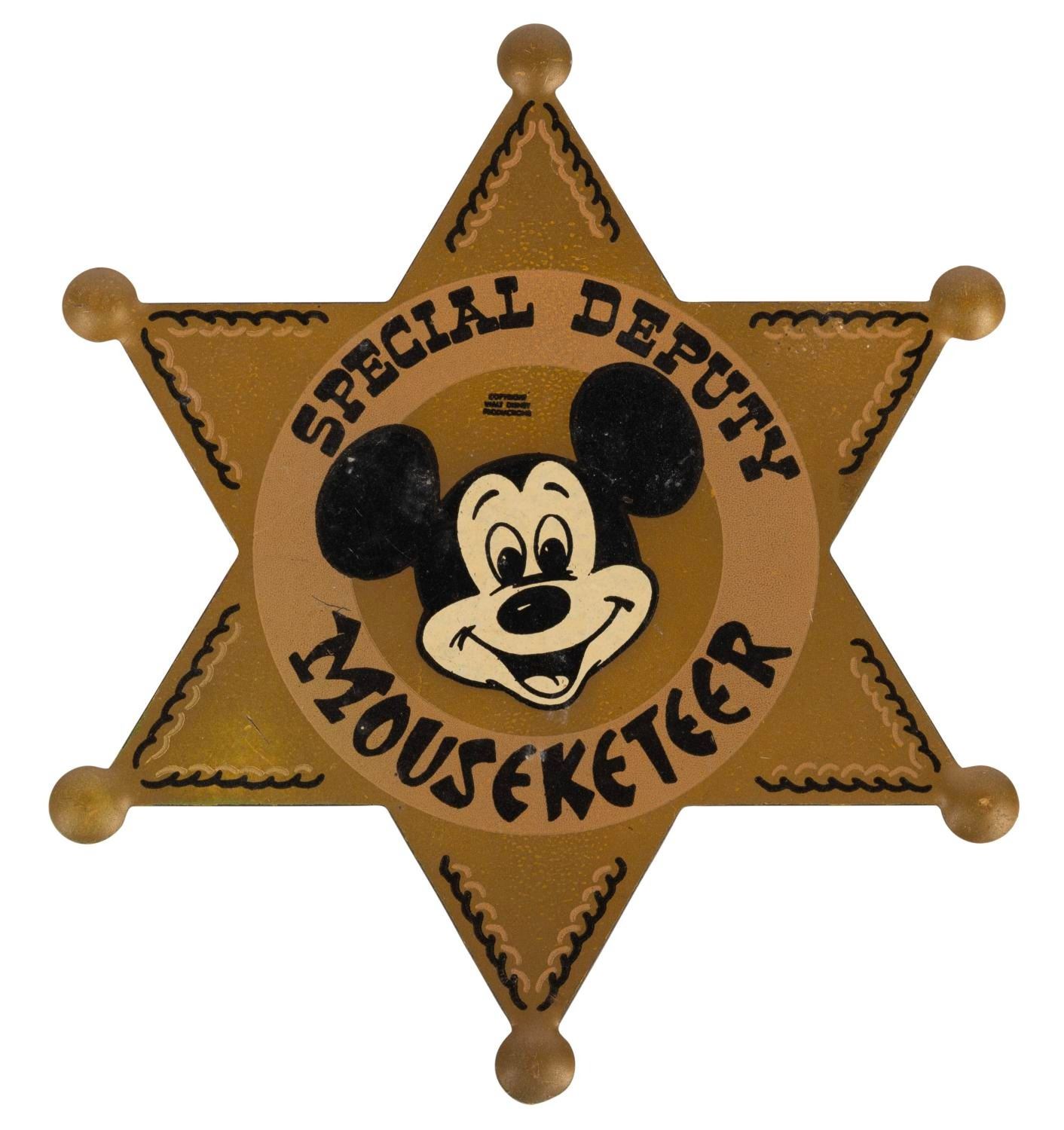 (Disney, 1955) A rare Special Deputy Mouseketeer prop badge, created for the Talent Roundup Day airing every Friday during the first season of "The Mickey Mouse Club." Badges like these were noticeably worn by all the Cast Members performing in the segment, including the Mouseketeers. Measuring 4.25" x 4.75", the badge is in good condition with very light paint loss, scratching, and oxidation on the front and reverse.