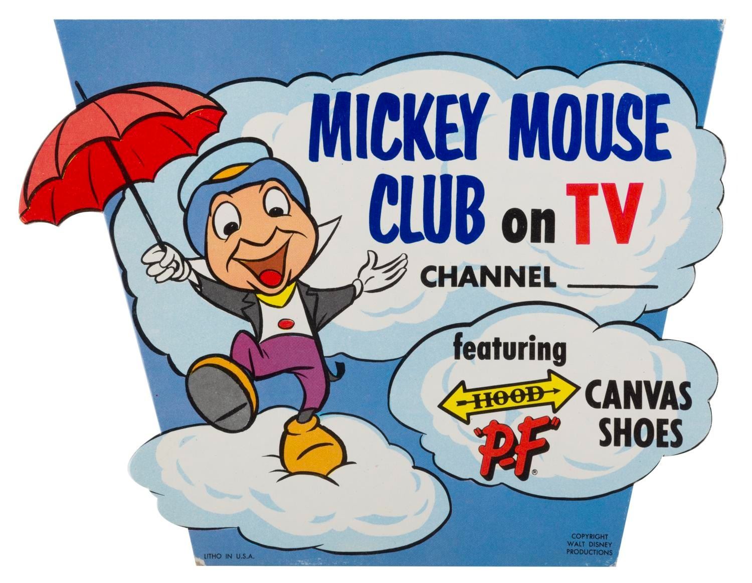 (Hood, 1950s) A counter or shelf top display for"P-F" Flyers tennis shoes, sponsor of the original Mickey Mouse Club. Measuring 7" x 9", the card displays in good condition with light edge wear, and loss of paper and the support leg from the back.