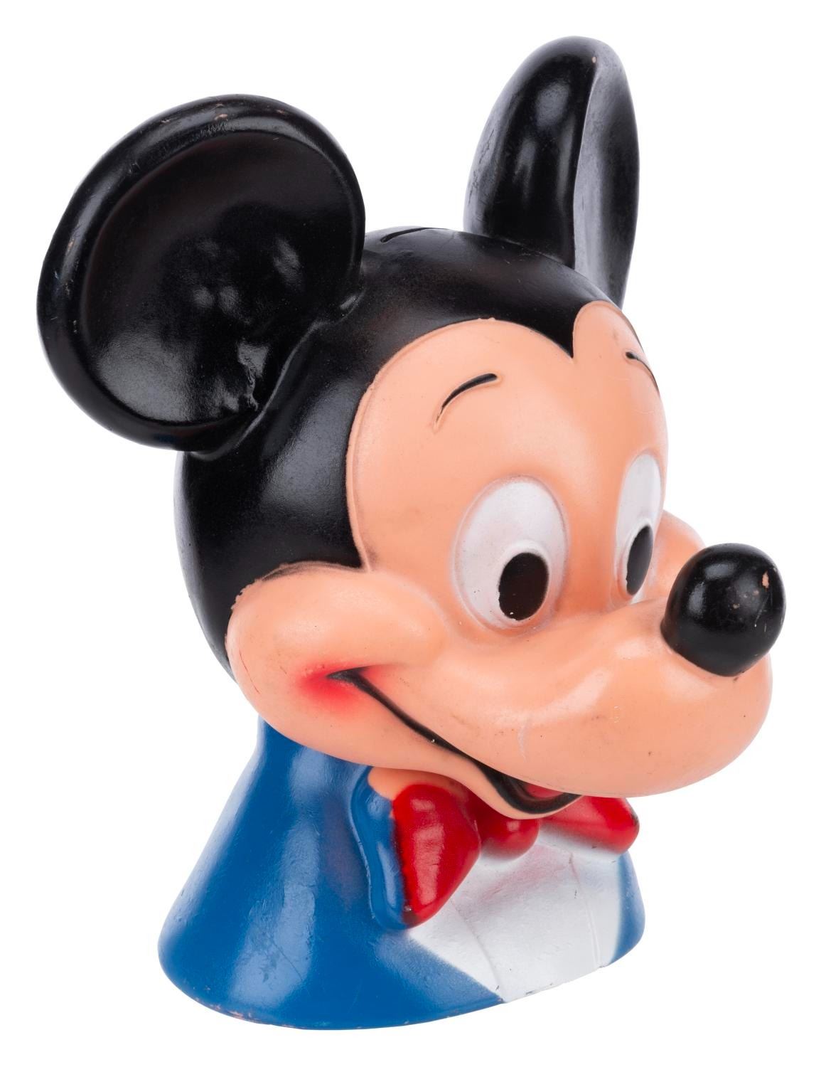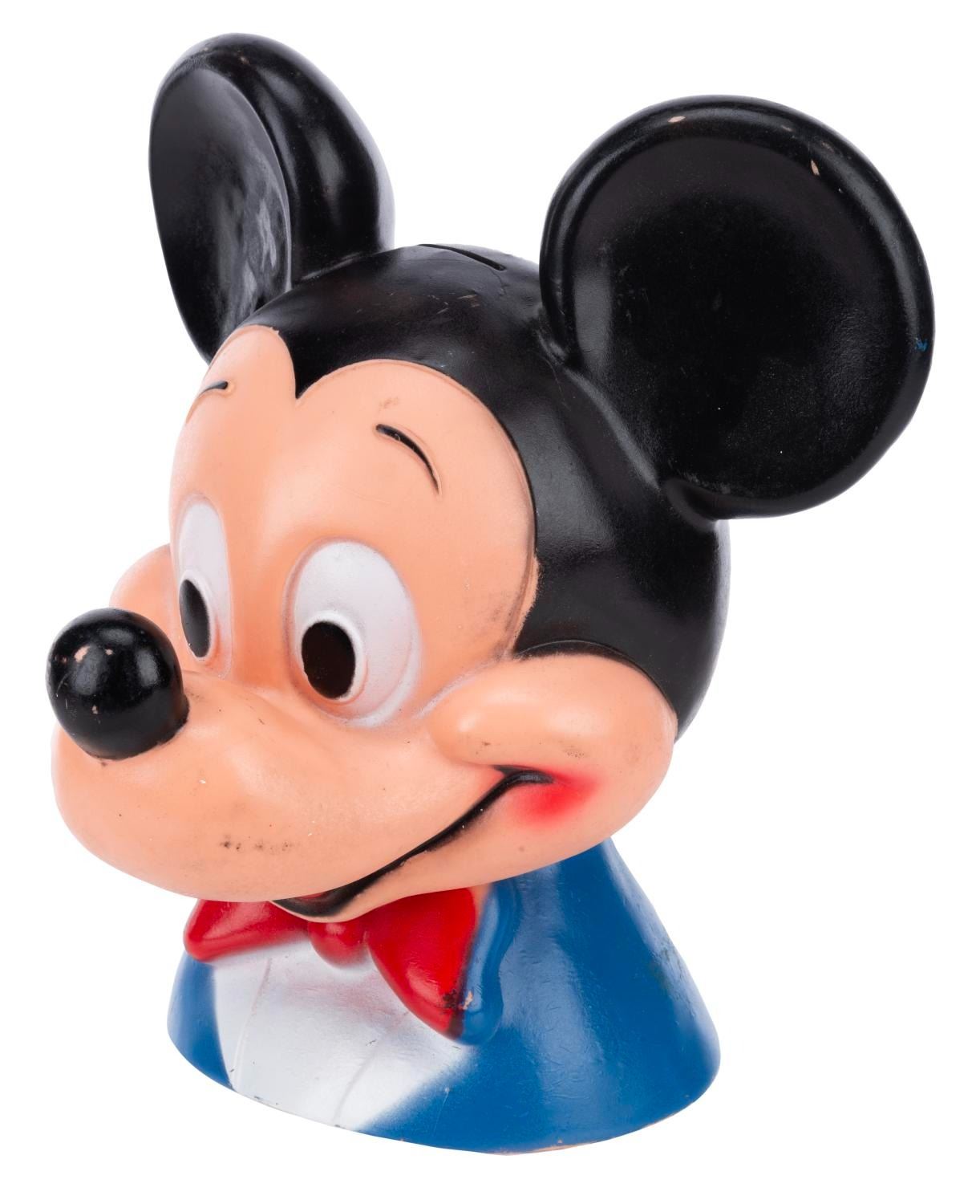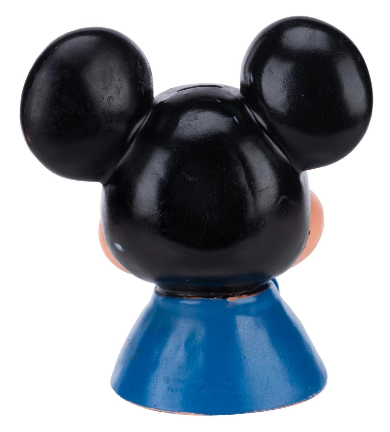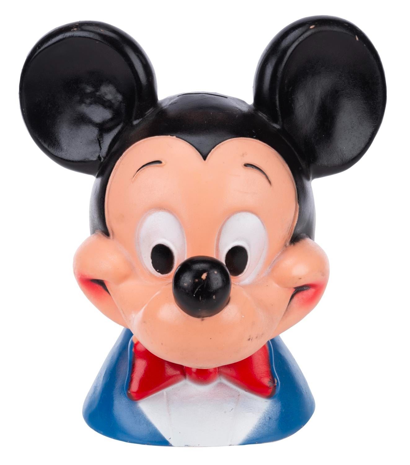 (Play Pal Plastics, 1971) A vinyl bank of Mickey Mouse’s head, with a plastic stopper on the bottom. Measuring 9.25” x 8” x 10.25” tall, the bank displays in good condition with small scuffs and scratches.