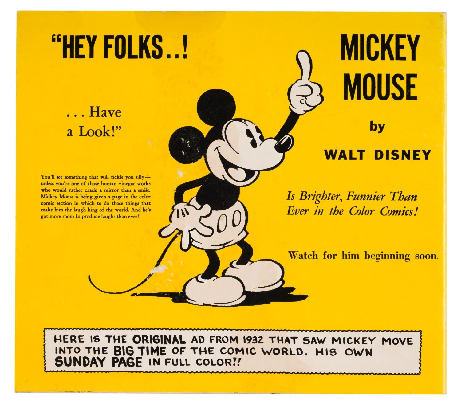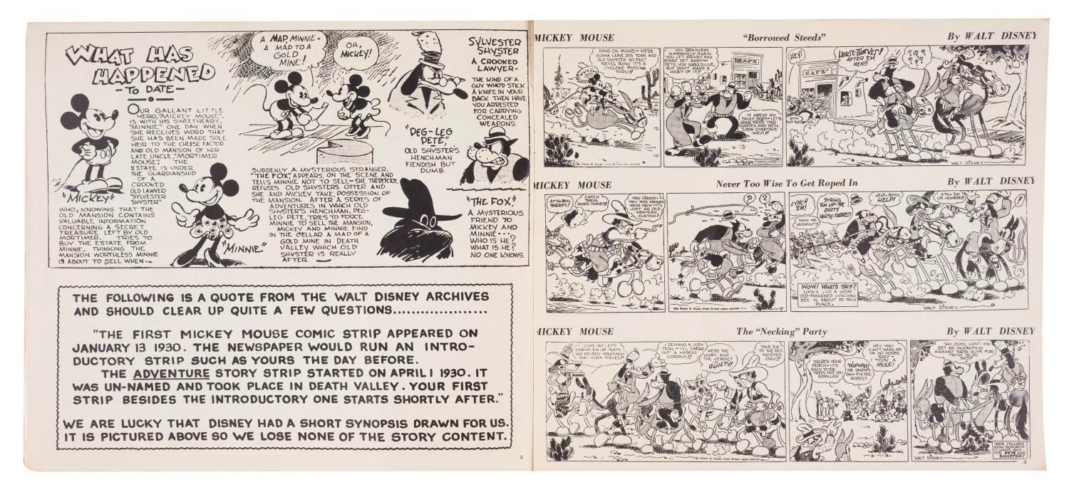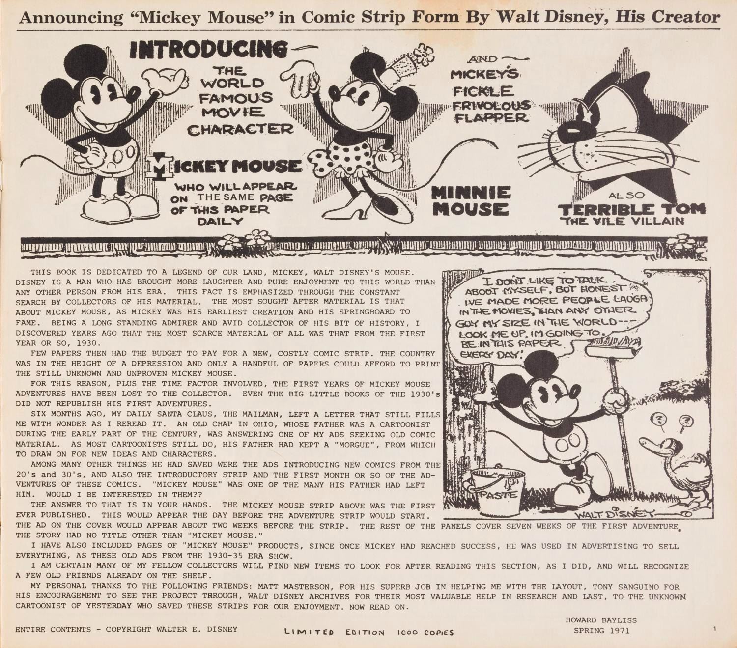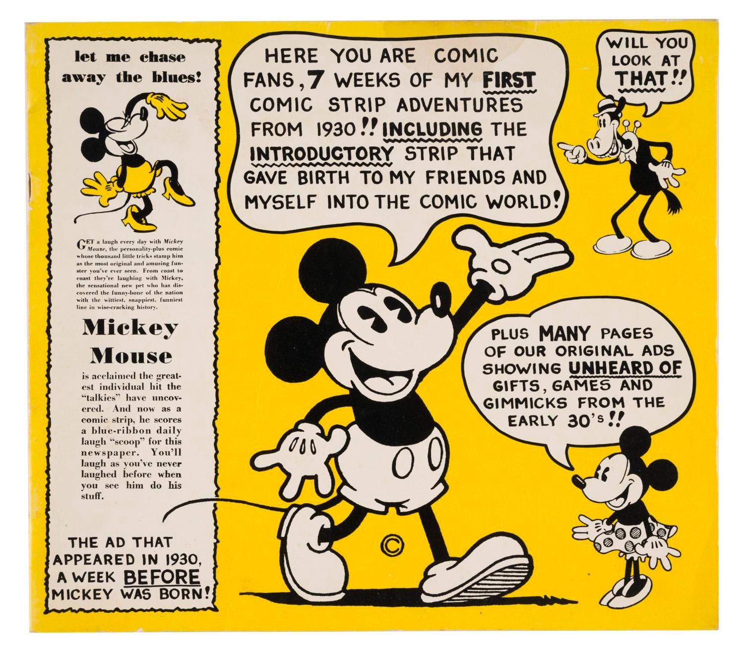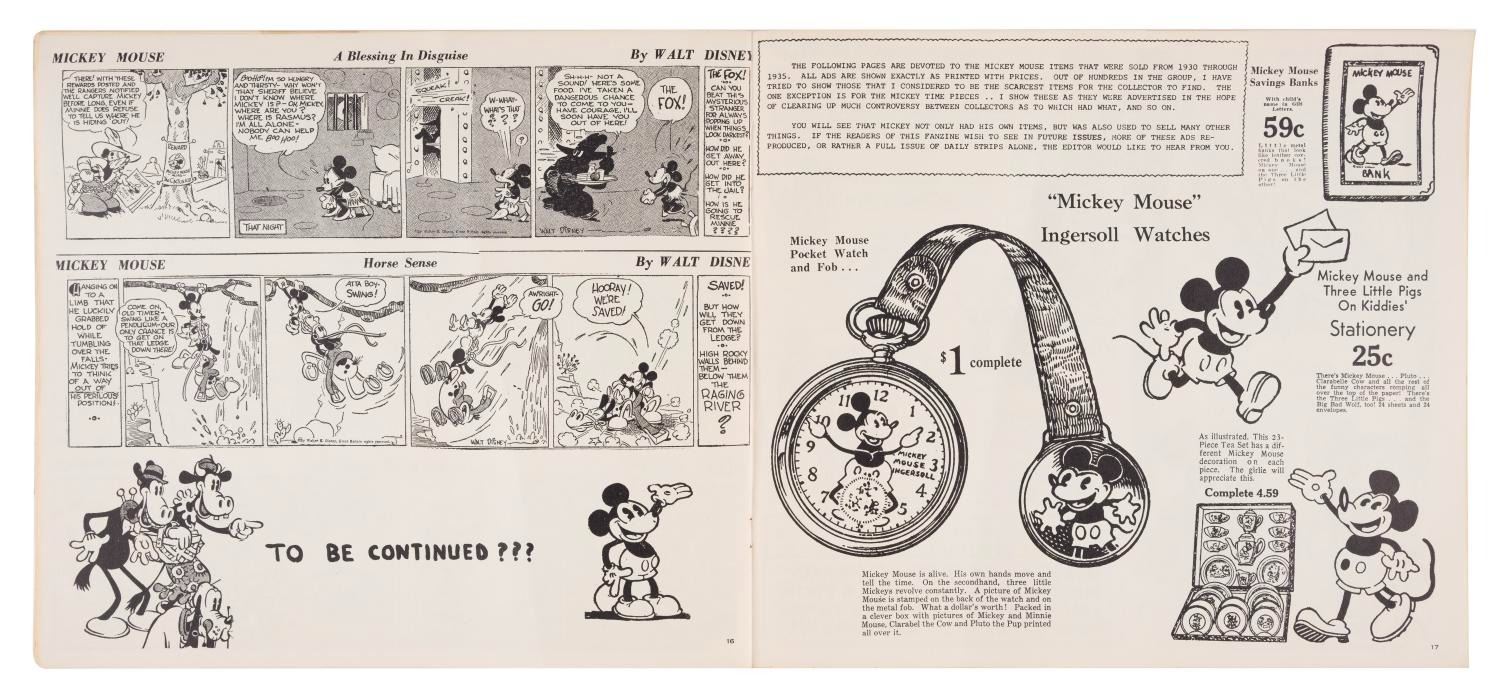 (Howard Bayliss, 1971) An early fanzine reprinting seven weeks of the early Mickey Mouse daily comic strip from 1930. Included are reproductions of advertisements for Mickey Mouse licensed merchandise of the era. Measuring 10.5" x 12", the fanzine is in good condition, with a vertical crease and a circle of water stain on the upper edge.