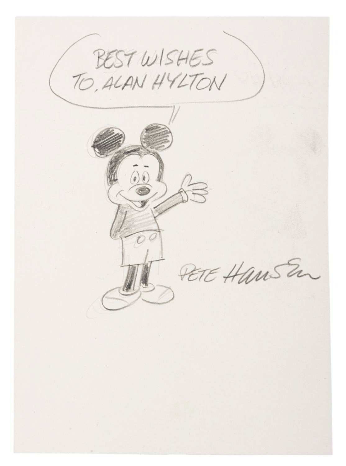 (Hansen, 1970s-80s) A Mickey Mouse drawing signed by the comic artist Pete Hansen. Measuring 5.25" x 7.25", the pencil drawing displays in very good condition with smudges and a gentle vertical fold.