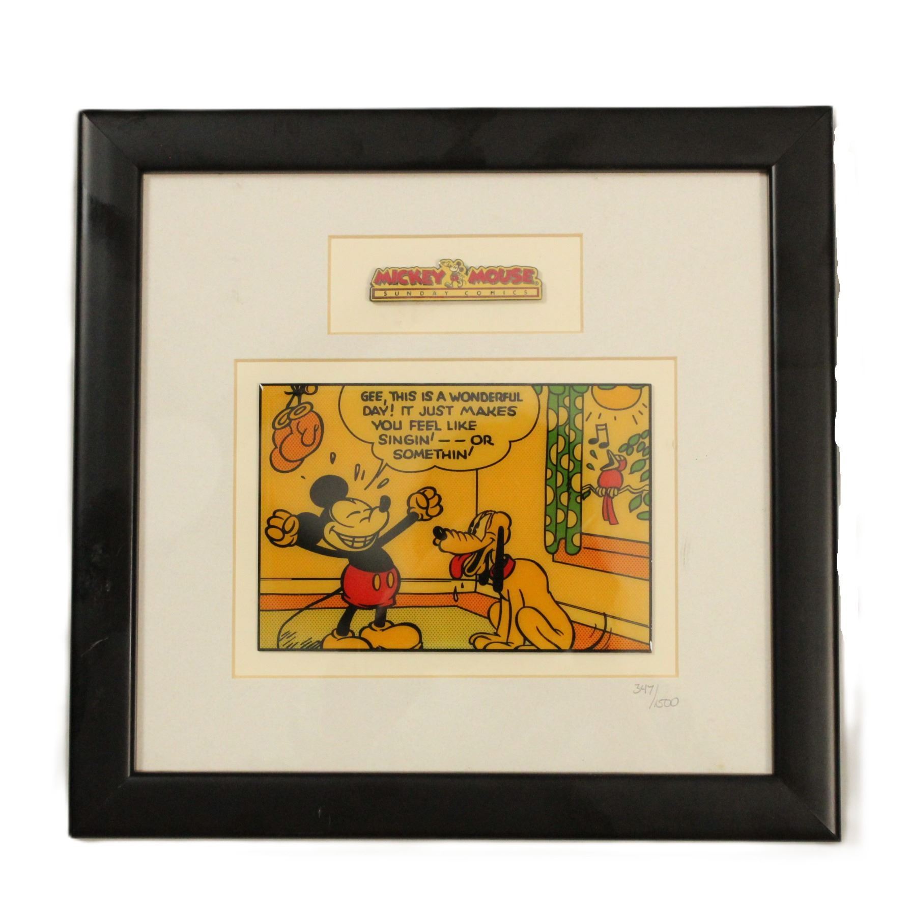 (Disney Pin Trading) A limited edition #347 of 1500 Mickey Mouse Sunday Comics framed pin set with COA. It includes two pins, the title pin and a jumbo pin measuring 6" x 4.25" with Mickey declaring to Pluto that it is a wonderful day.