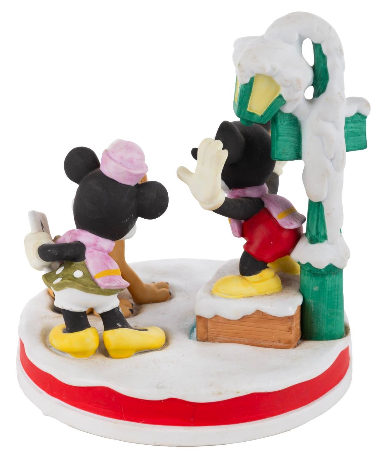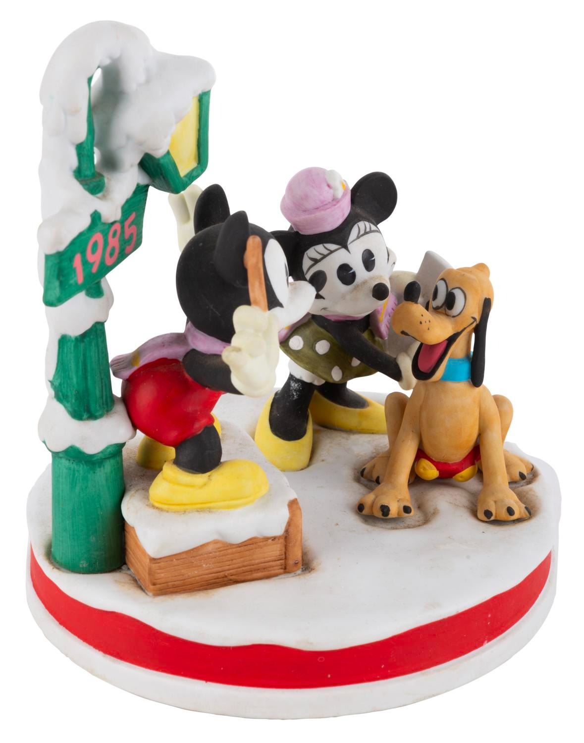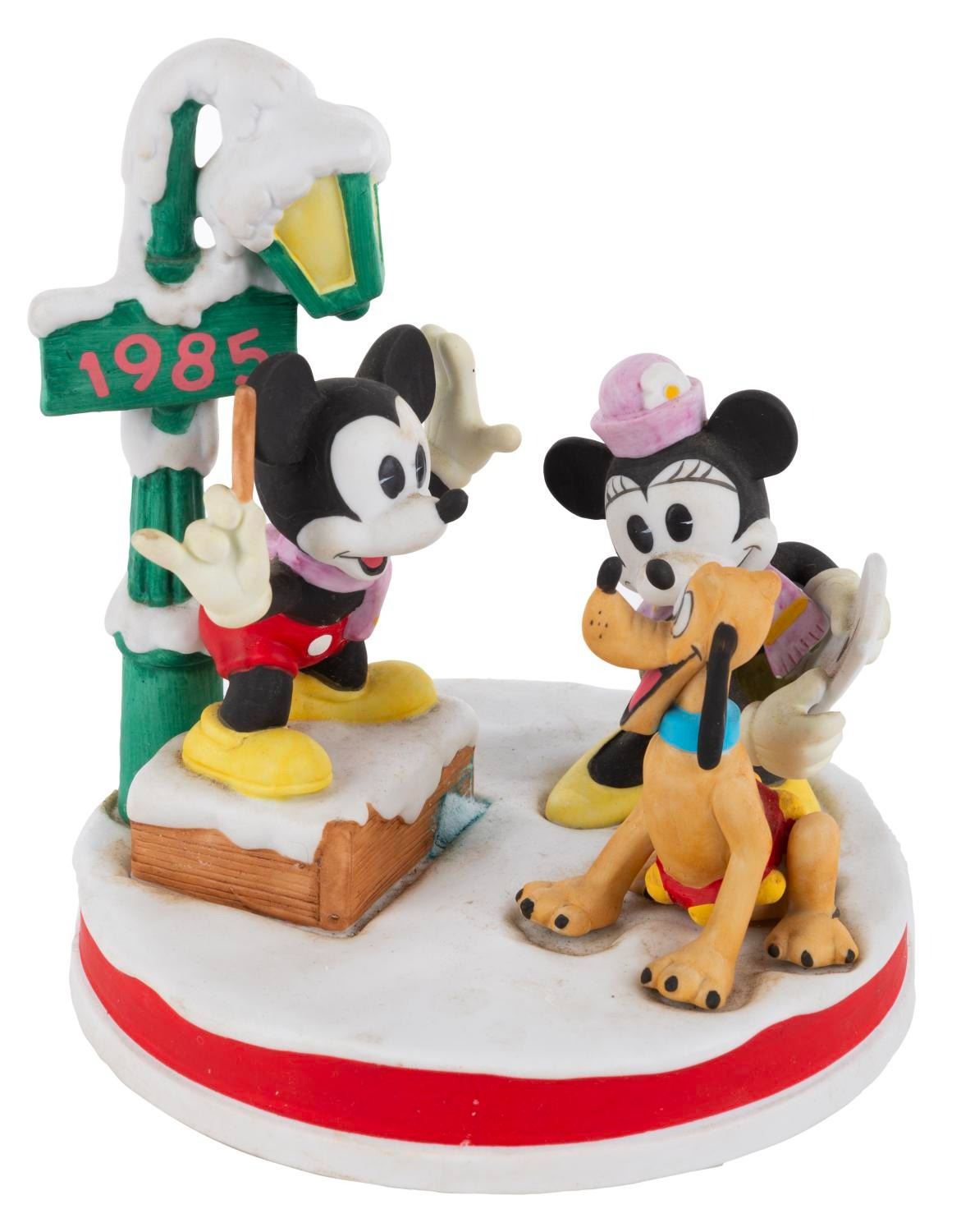 (Disney Parks, 1985) A"First Limited Edition" of a commemorative porcelain figurine featuring Mickey, Minnie, and Pluto caroling in the snow. The figure was inspired by the Walt Disney Studio’s Christmas card for 1935, and released in an edition of 2000 pieces exclusively at Disneyland and Walt Disney World. Measuring 6.5" tall and 6" in diameter, the piece is in very good condition with some soiling from display.