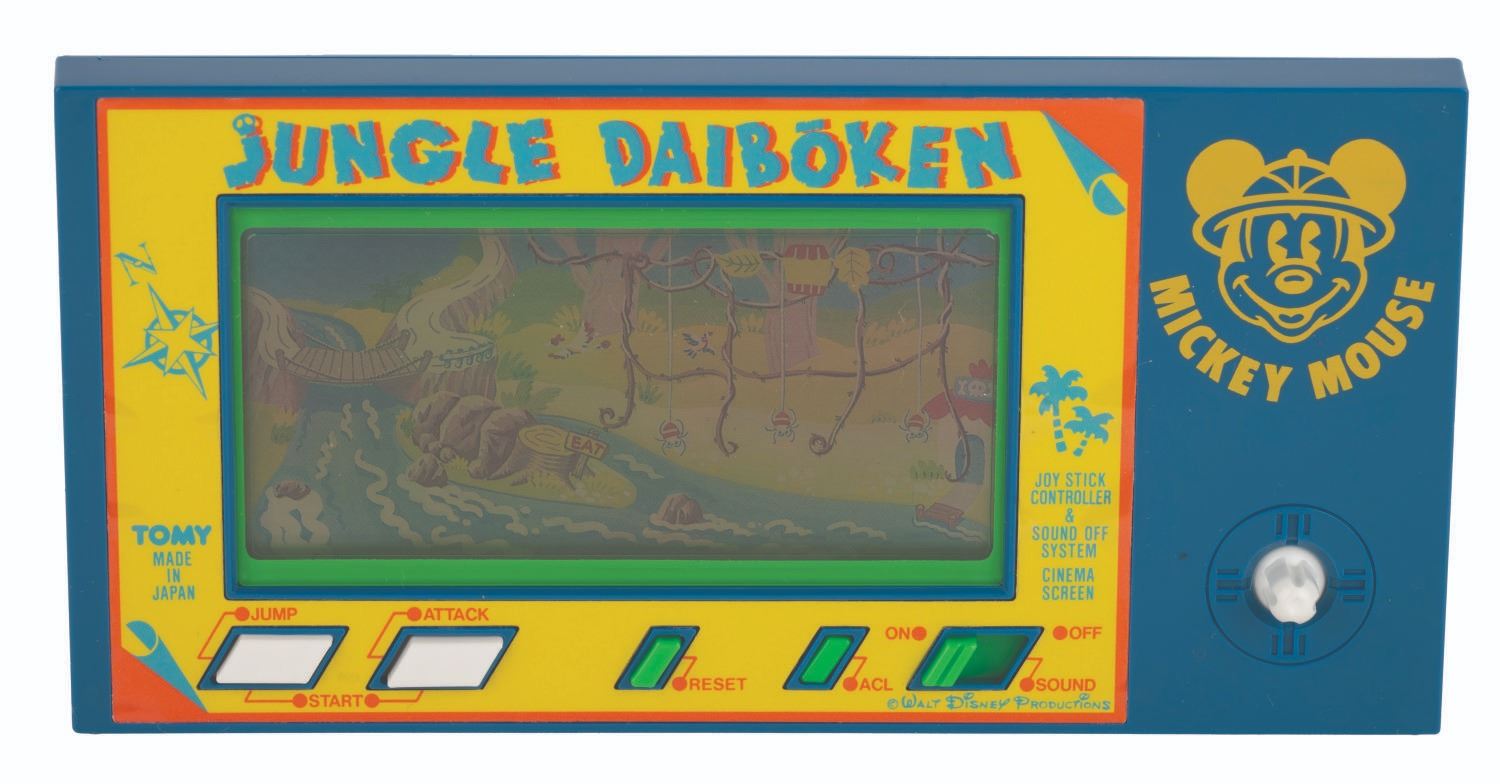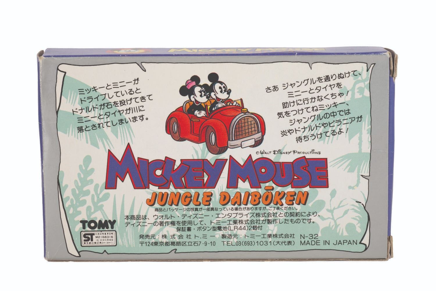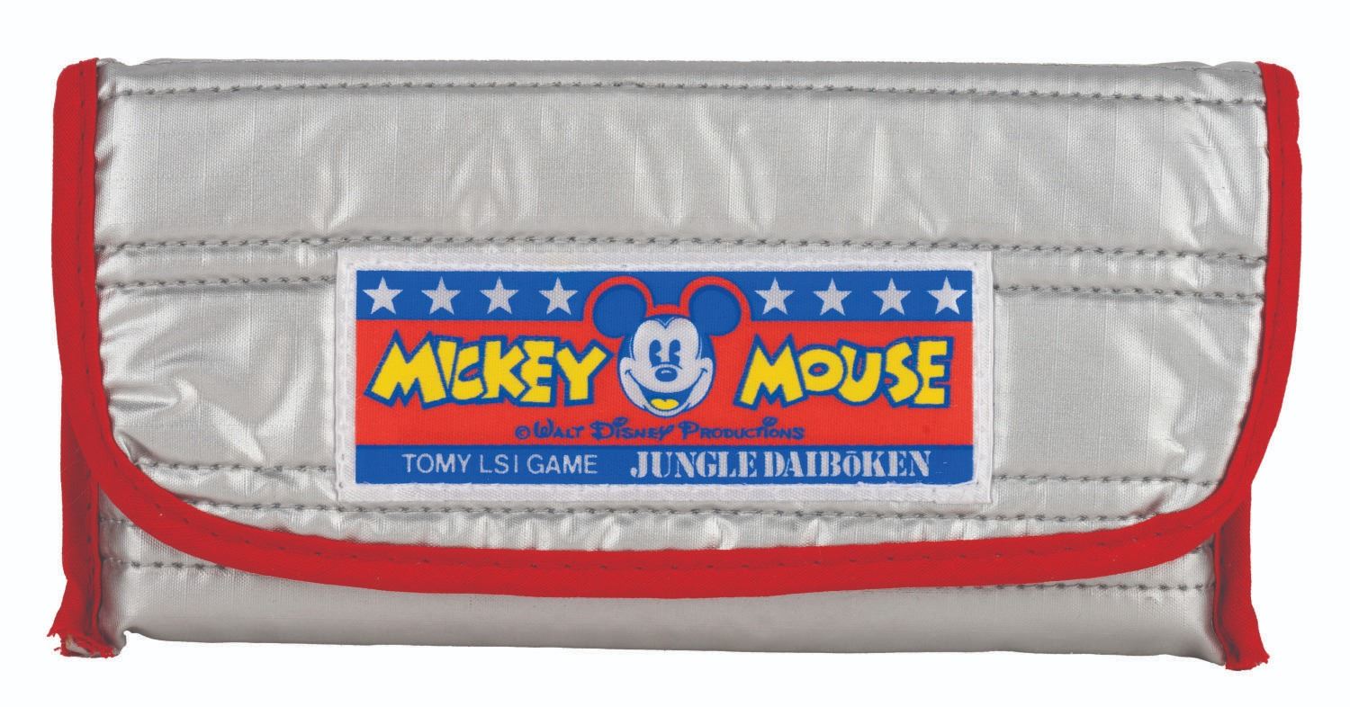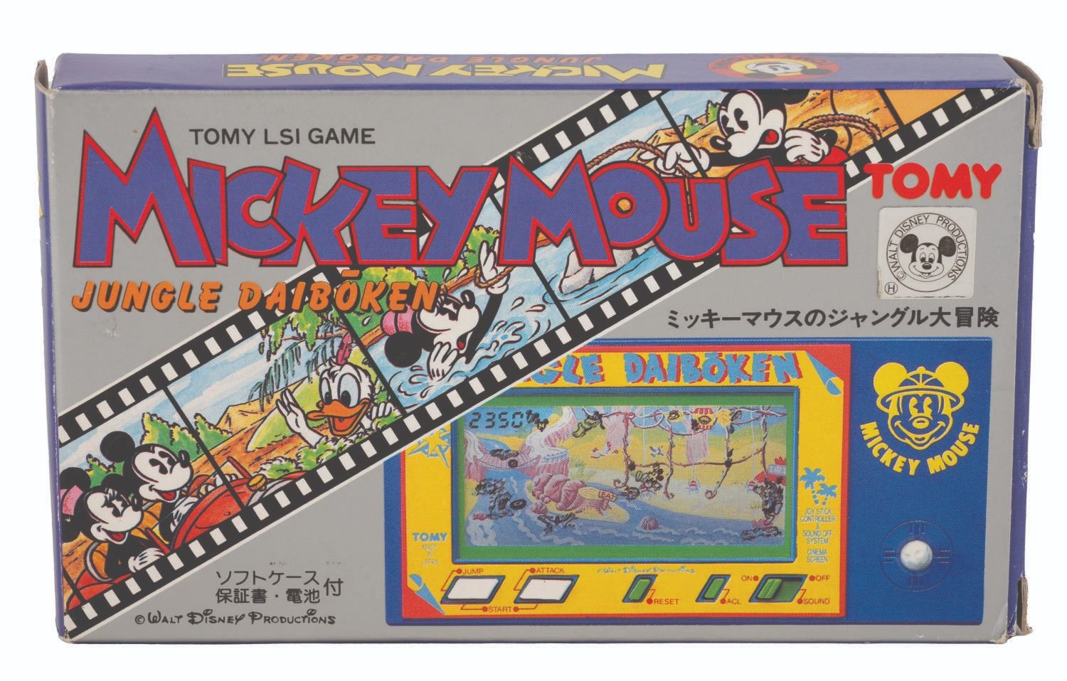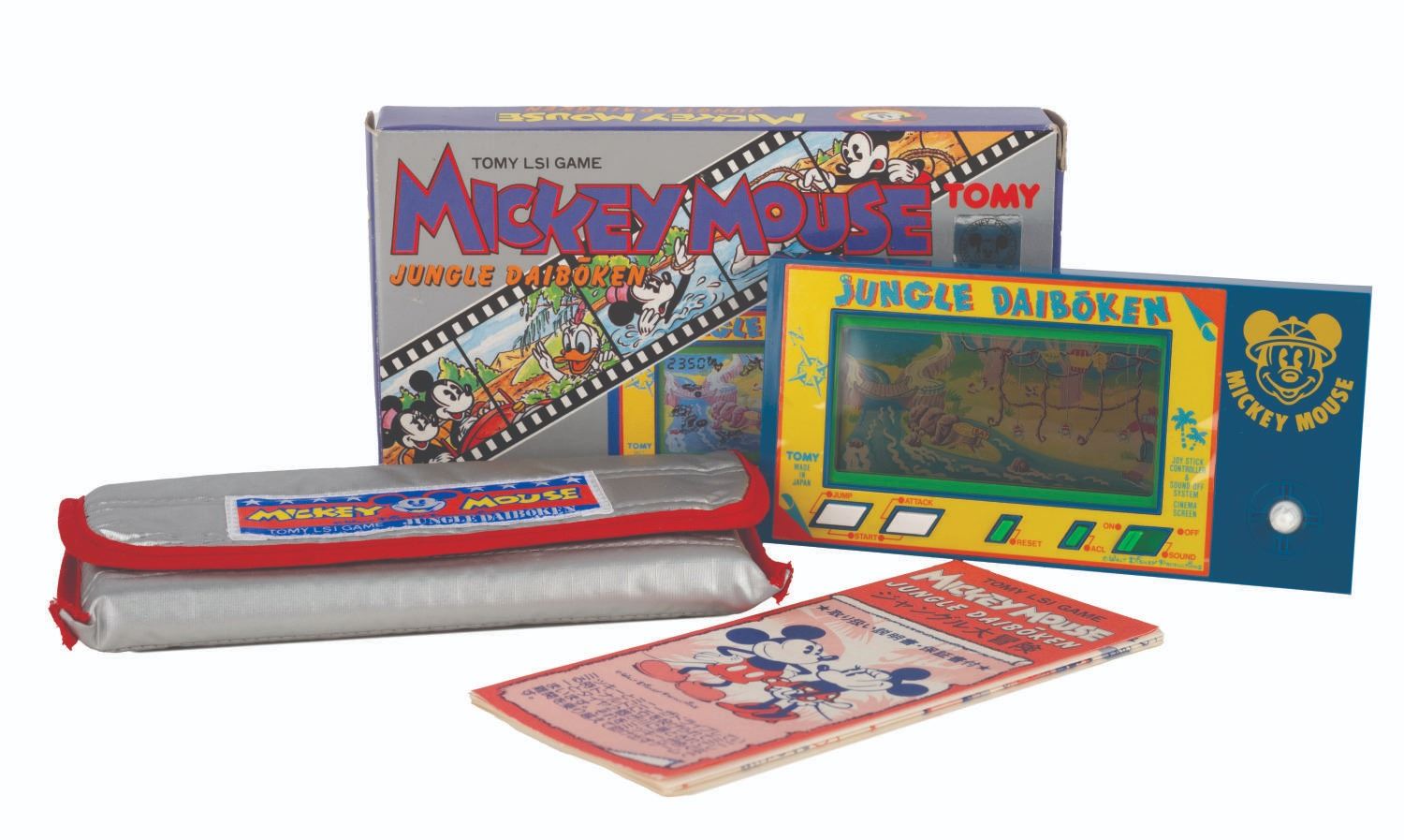 (Tomy, 1980s) A Tomy LSI Mickey Mouse Jungle Daibōken handheld game with a stylish silver-colored pouch and its original Japanese box. Requiring two 1.5V batteries (not included), the game worked when tested. Measuring 2.5” x 5.25” with its original 3.5” x 6” box, the game is in fine condition.