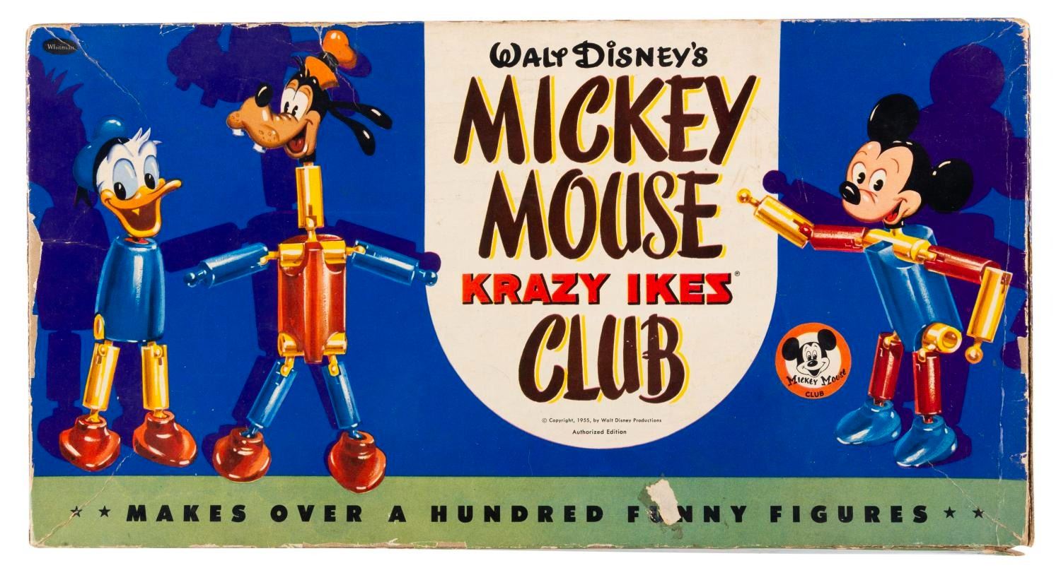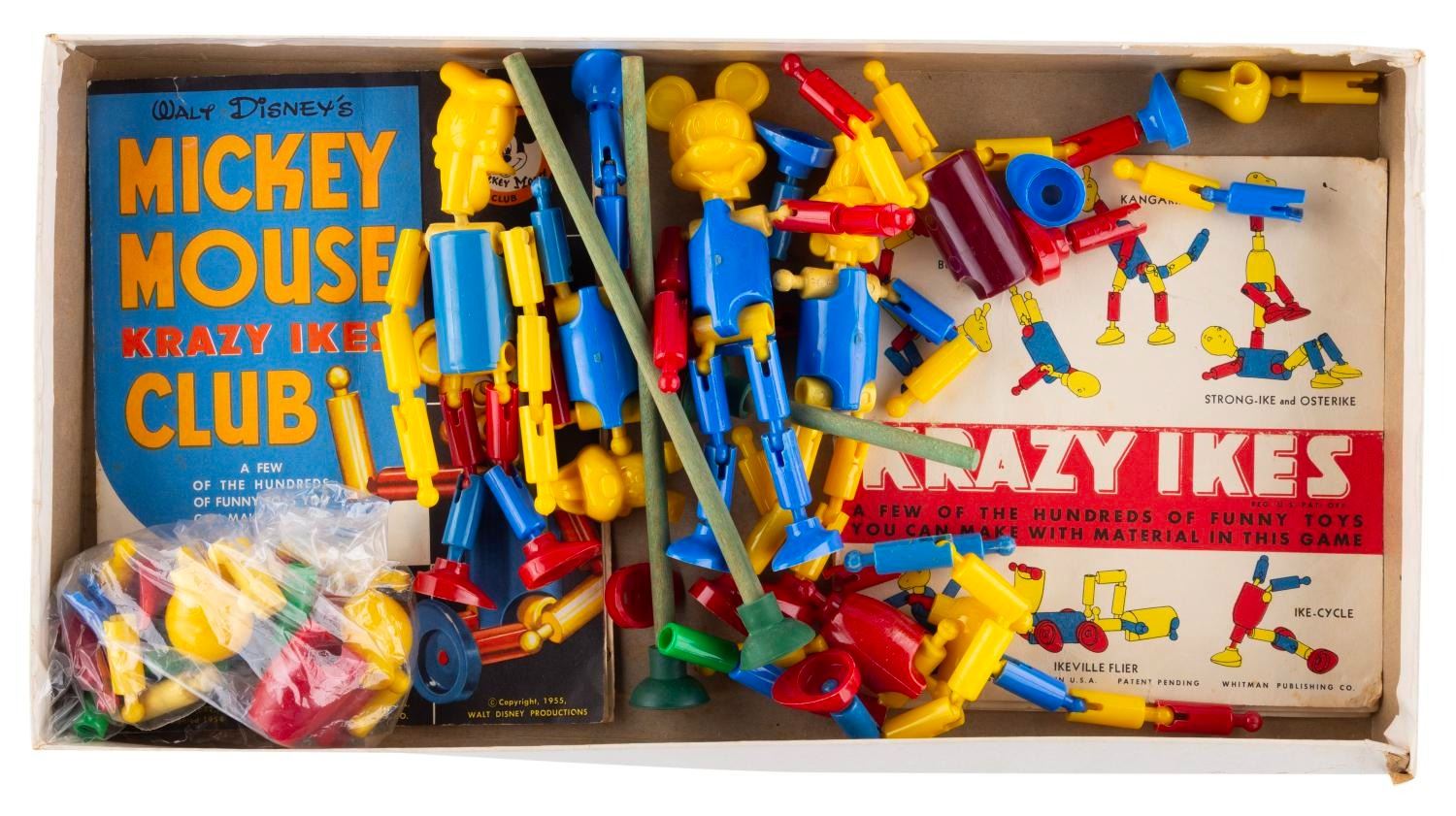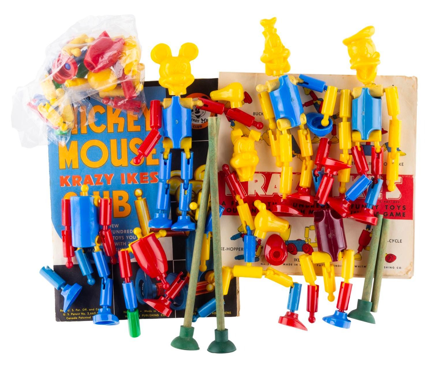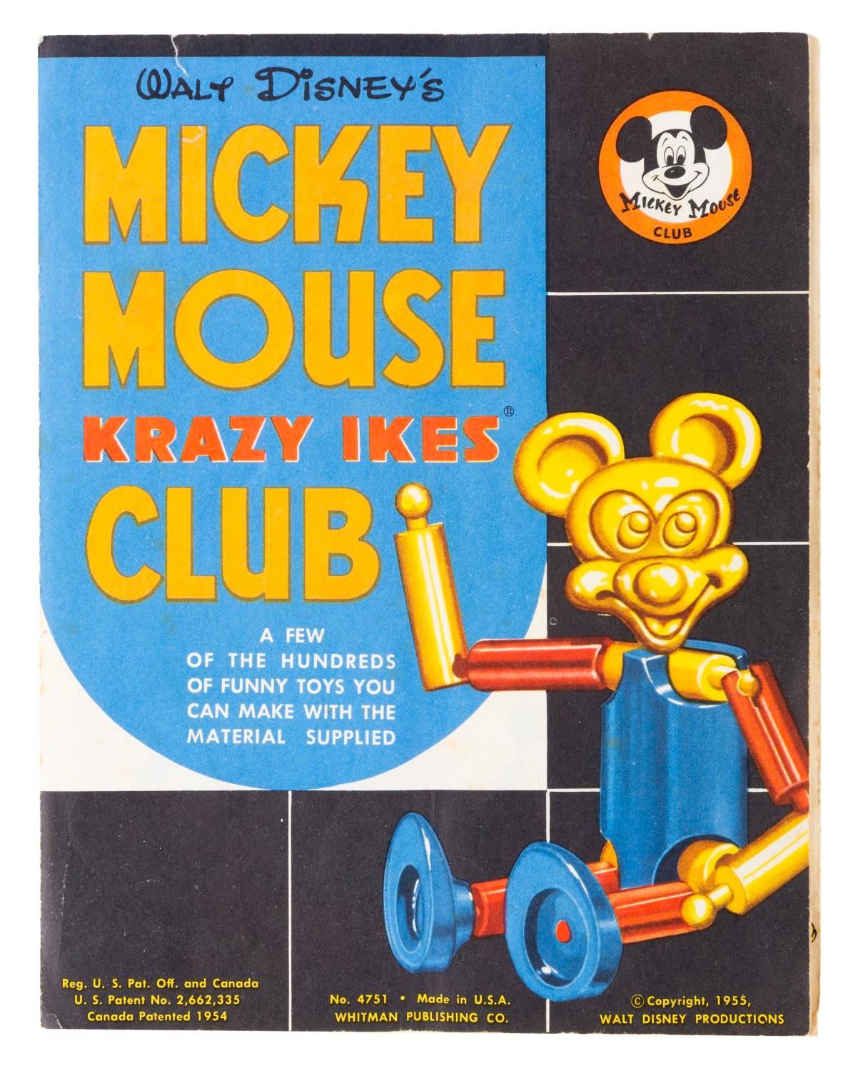 (Whitman, 1955) A Mickey Mouse Club “Krazy Ikes” play set with plastic pieces that assemble to create Disney characters and “Hundreds of Funny toys,” and a booklet enclosed showing some configurations. The booklet and pieces are in very good condition, with 92 pieces included, with a further 27 pieces and an instruction book included from a regular (Non-Disney) Krazy Ikes set. The box measuring 8” x 15.5” x 1.5” is in fair condition with typical wear, especially at edges and corners, with some splits and tape repair.