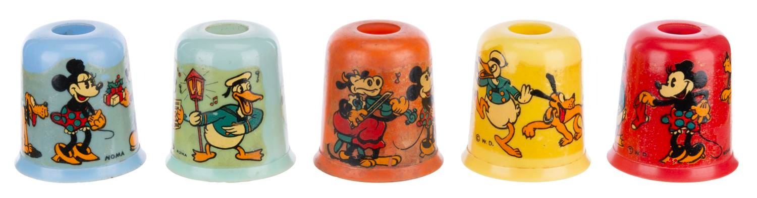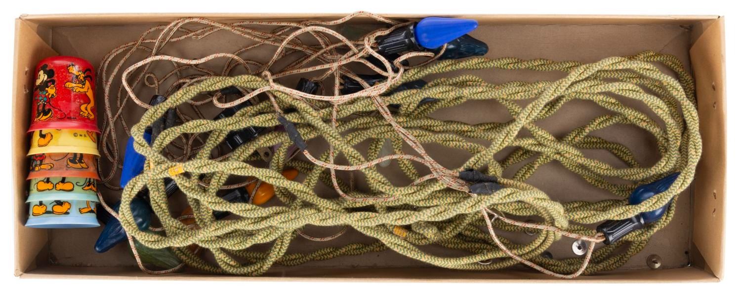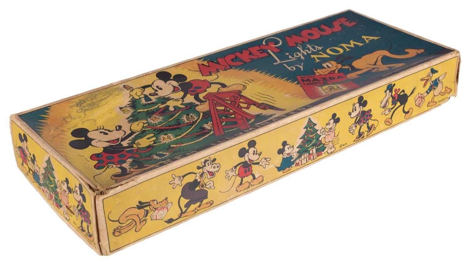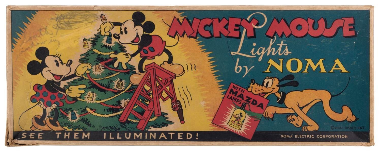(NOMA, 1930s) A Mickey Mouse Lights by NOMA set with Mazda lamps. The set was modified to include 12 bulbs and eight shades. The 1.5" x 2" shades are in good condition with typical wear to the decals from age. The