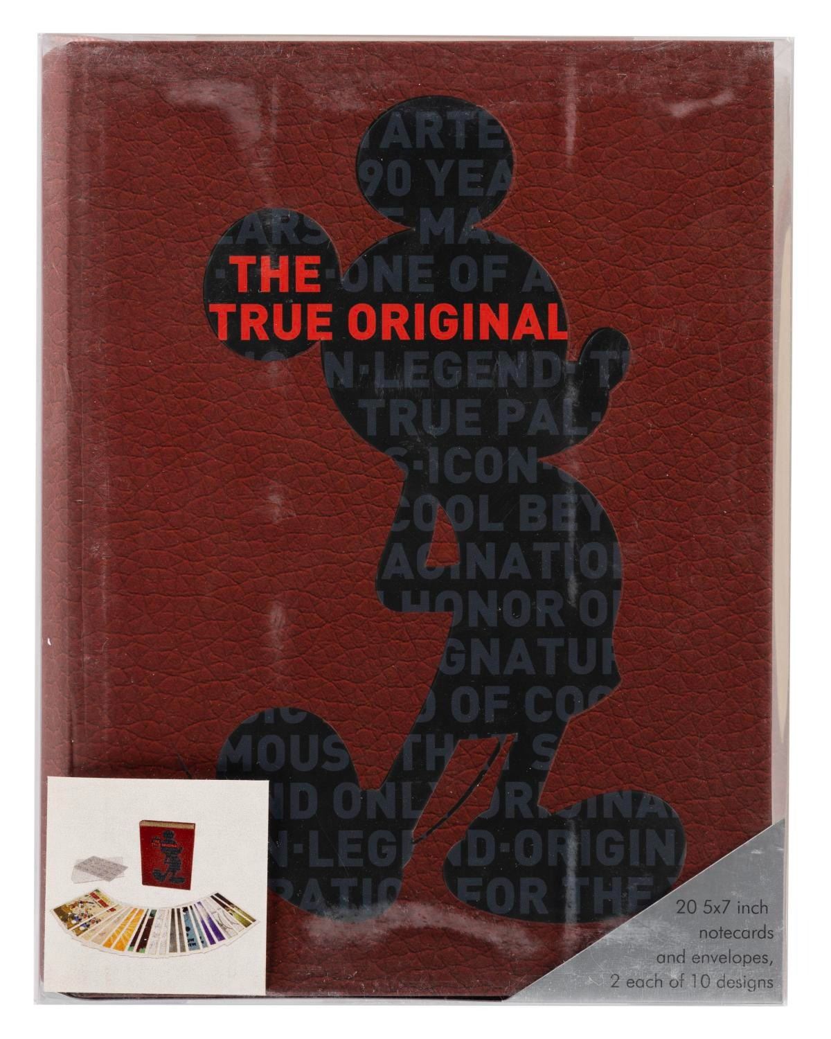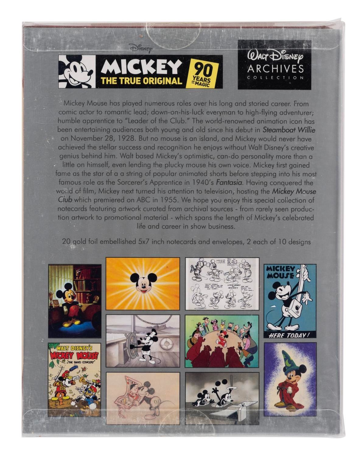 (Enesco, 2018) An unopened Mickey Mouse: The True Original 90th birthday notecard and envelope set featuring 20 5” x 7” notecards and envelopes. Measuring 6.75” x 8.75” x 2”, the unopened set is in fine as-new condition, while the outer plastic packaging is in fair condition with scratches, scuffs, and wear throughout.