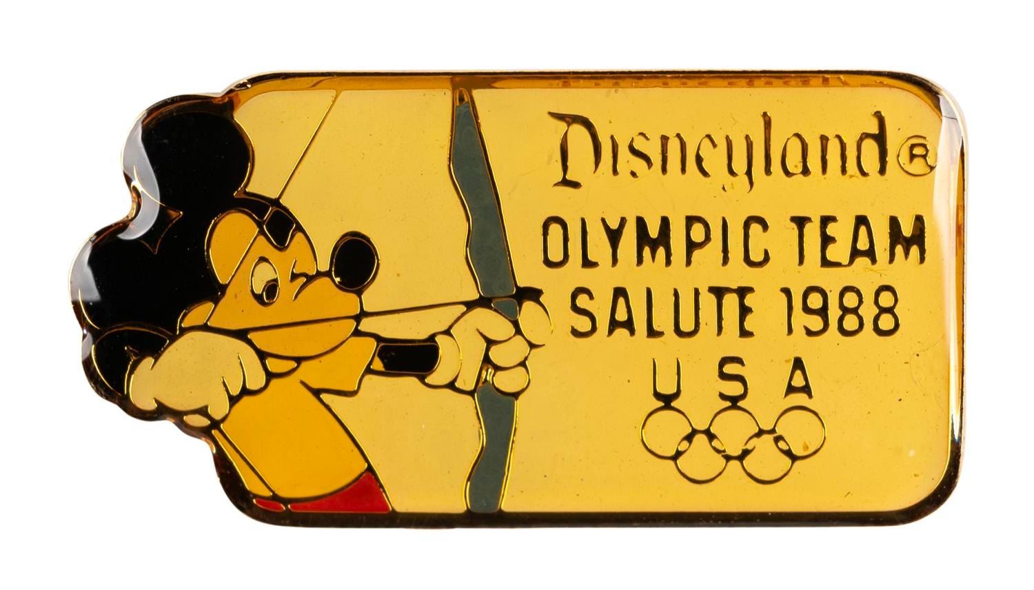 (Disneyland, 1988) A Disneyland Olympic Team Salute 1988 pin, featuring Mickey Mouse as an archer. Measuring 1.5” wide, the pin is in very good condition with color shift from age.