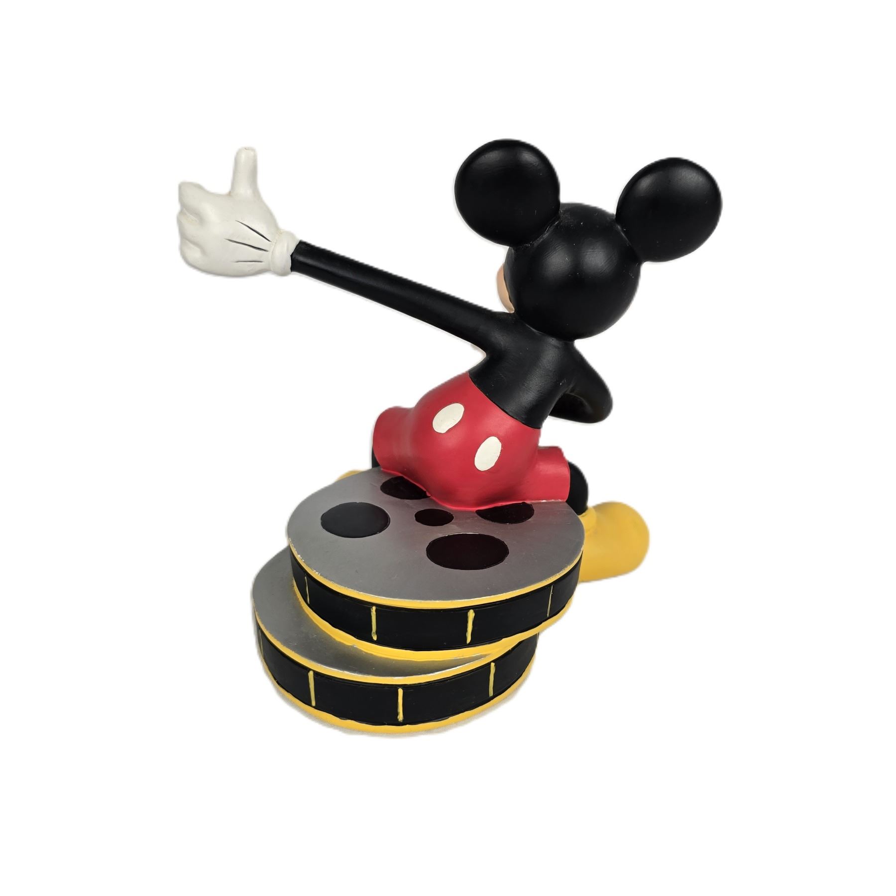 (Disney Store) This is a Mickey Mouse figurine and photo holder featuring Mickey Mouse sitting atop a pair film reels. It measures 5” x 7” by 5.5” and weighs 1 lb 12 oz. It is missing the plastic photo holder.