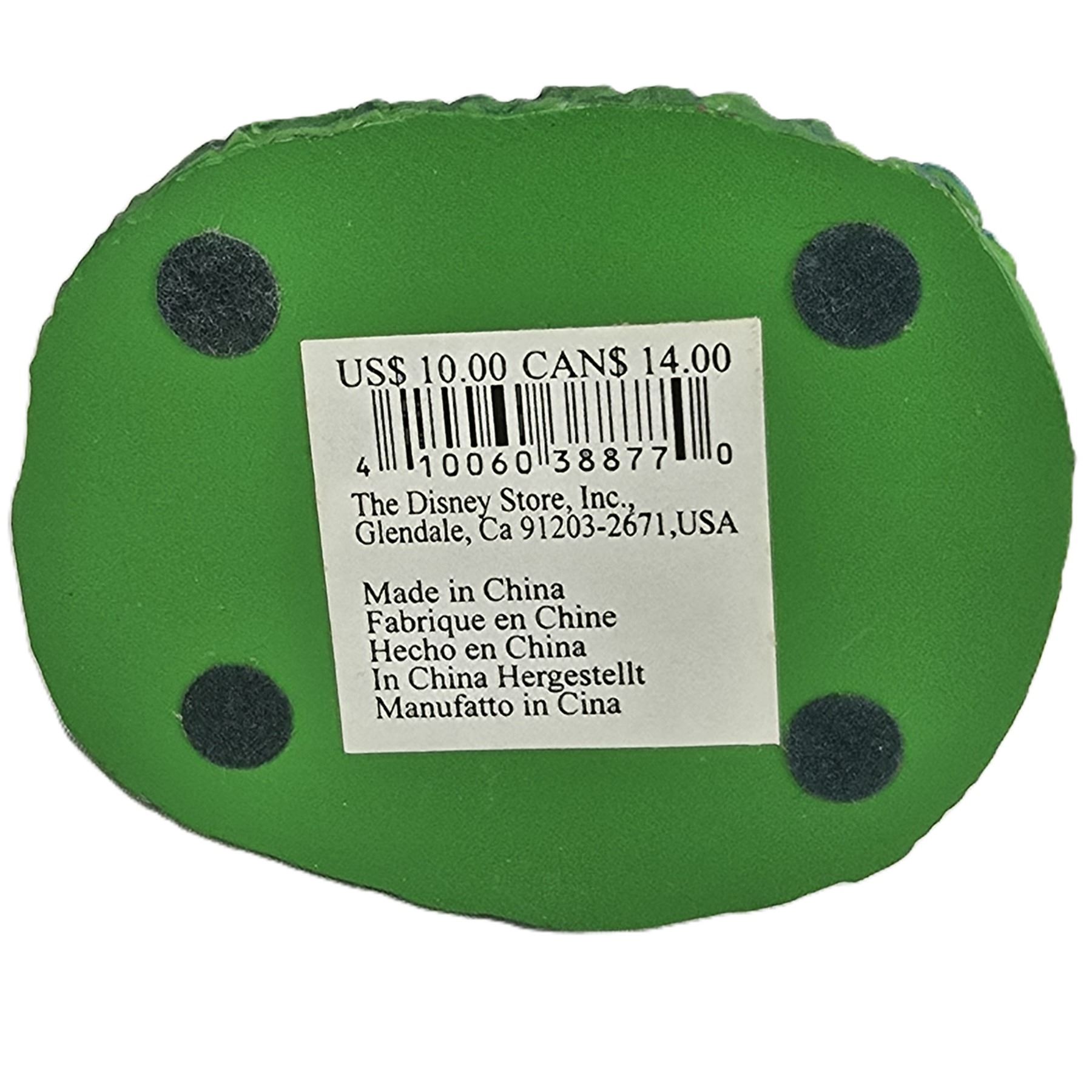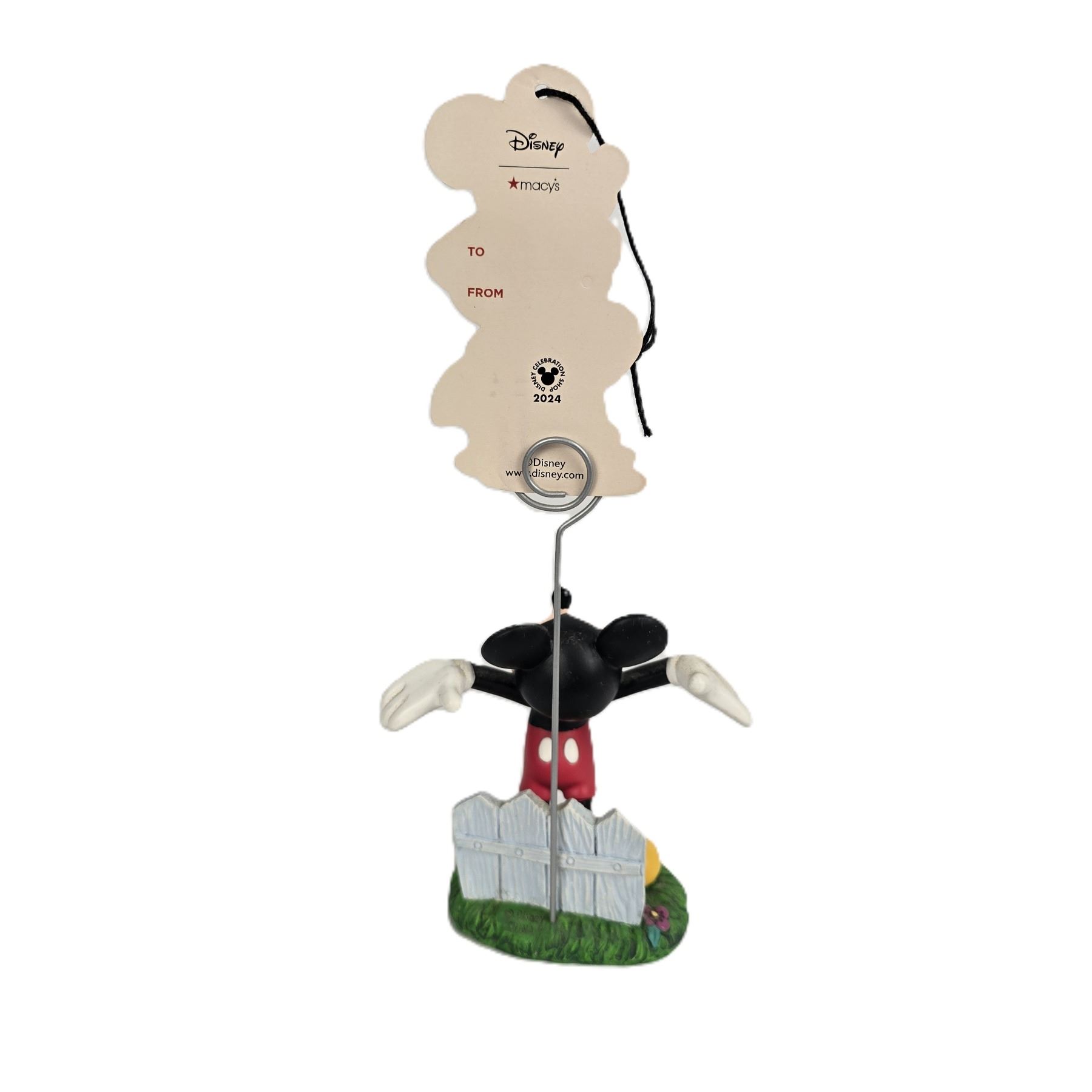 (Disney Store) This is a photo holder featuring a classic look Mickey Mouse with arms open wide and looking up at your photo. Mickey is standing on a base of painted green grass and flowers in front of a short fence. The photo holder staff is made of metal. The Macy's gift tag is an image of a classic Mickey Mouse parade balloon with handlers on the ground. The holder measures 2.75” x 3” x 6.25” and weighs 6 oz.