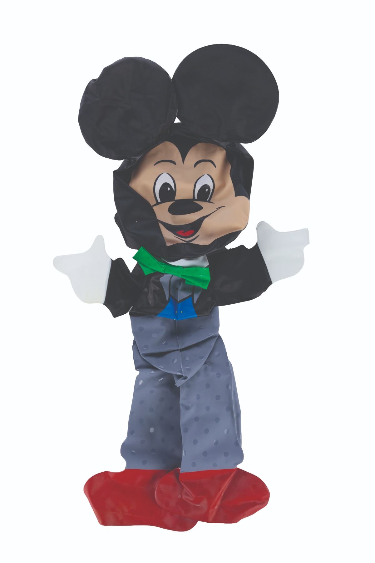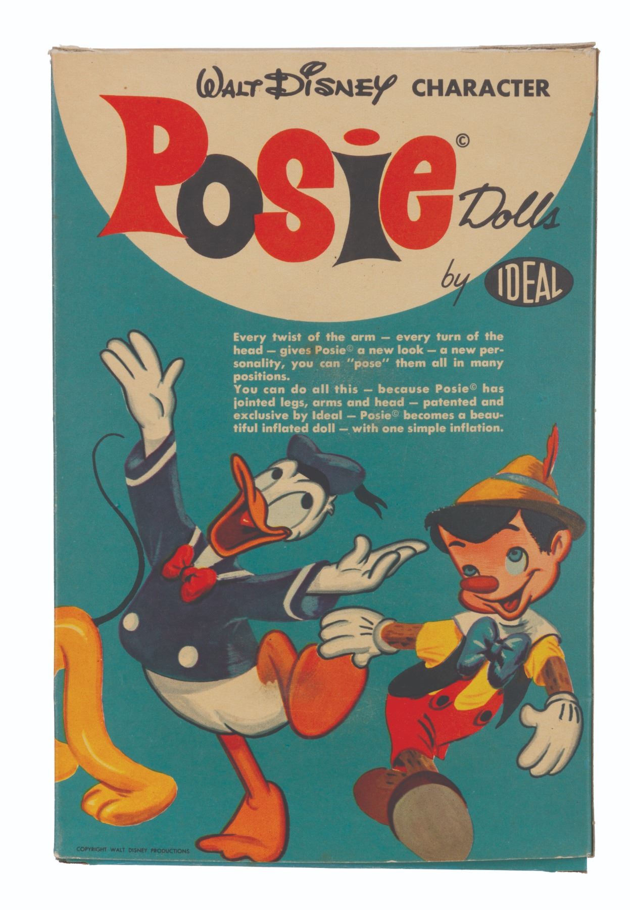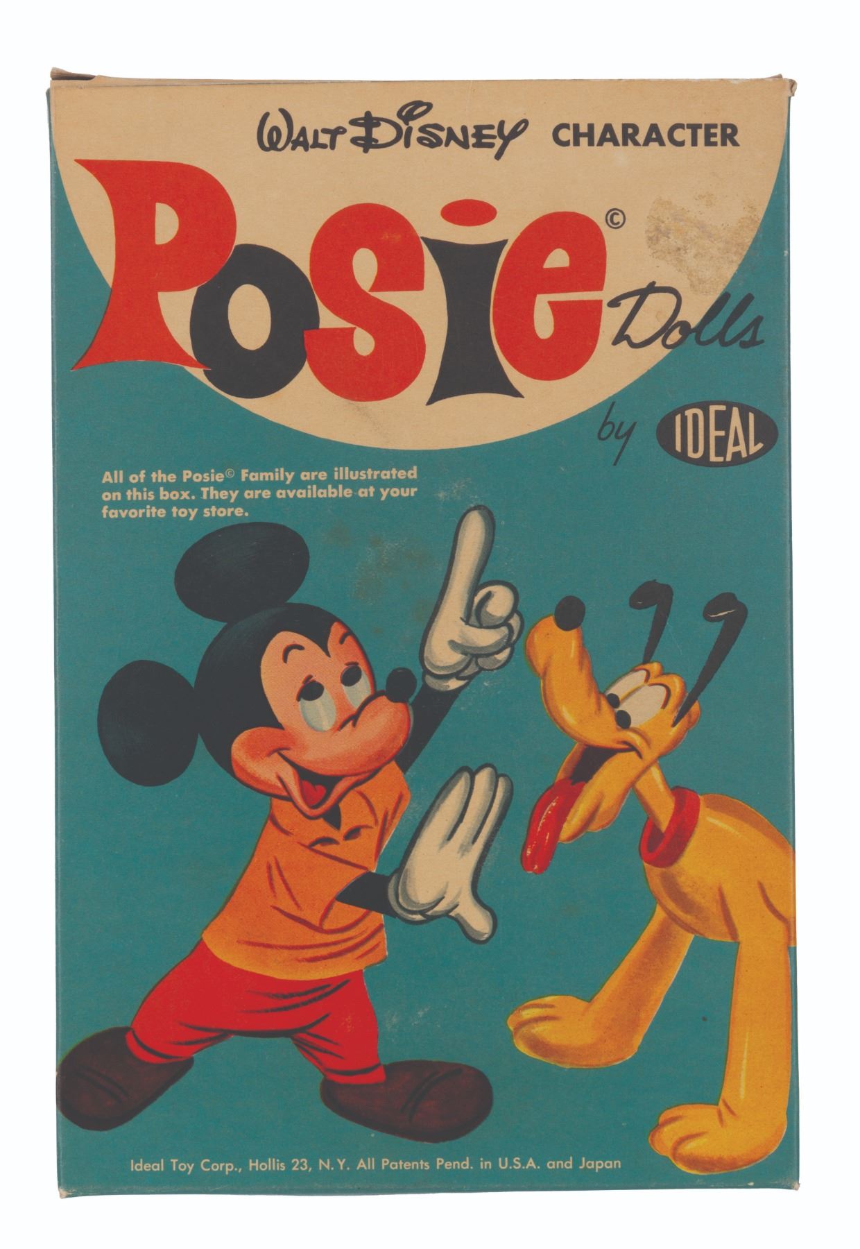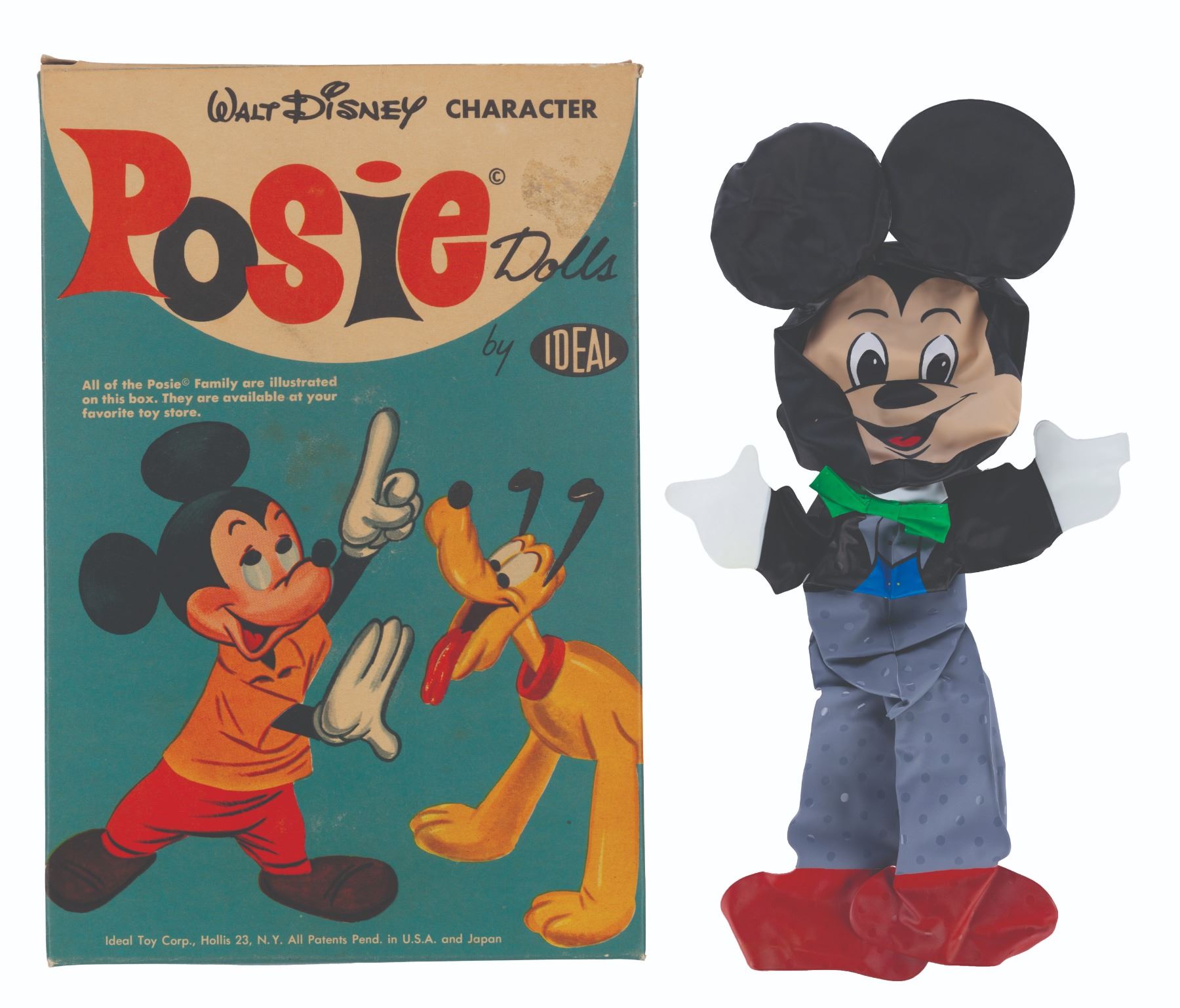 (Ideal Toy Corp, 1960s) A Mickey Mouse Posie doll by Ideal Toy Corp. The inflatable Mickey doll sports a suit and a fashionable green bow tie. Measuring 12" x 20", the doll is in fine condition, in its original 6" x 9" good condition box with sticker residue, check marks on the top and bottom, and discoloration from age.