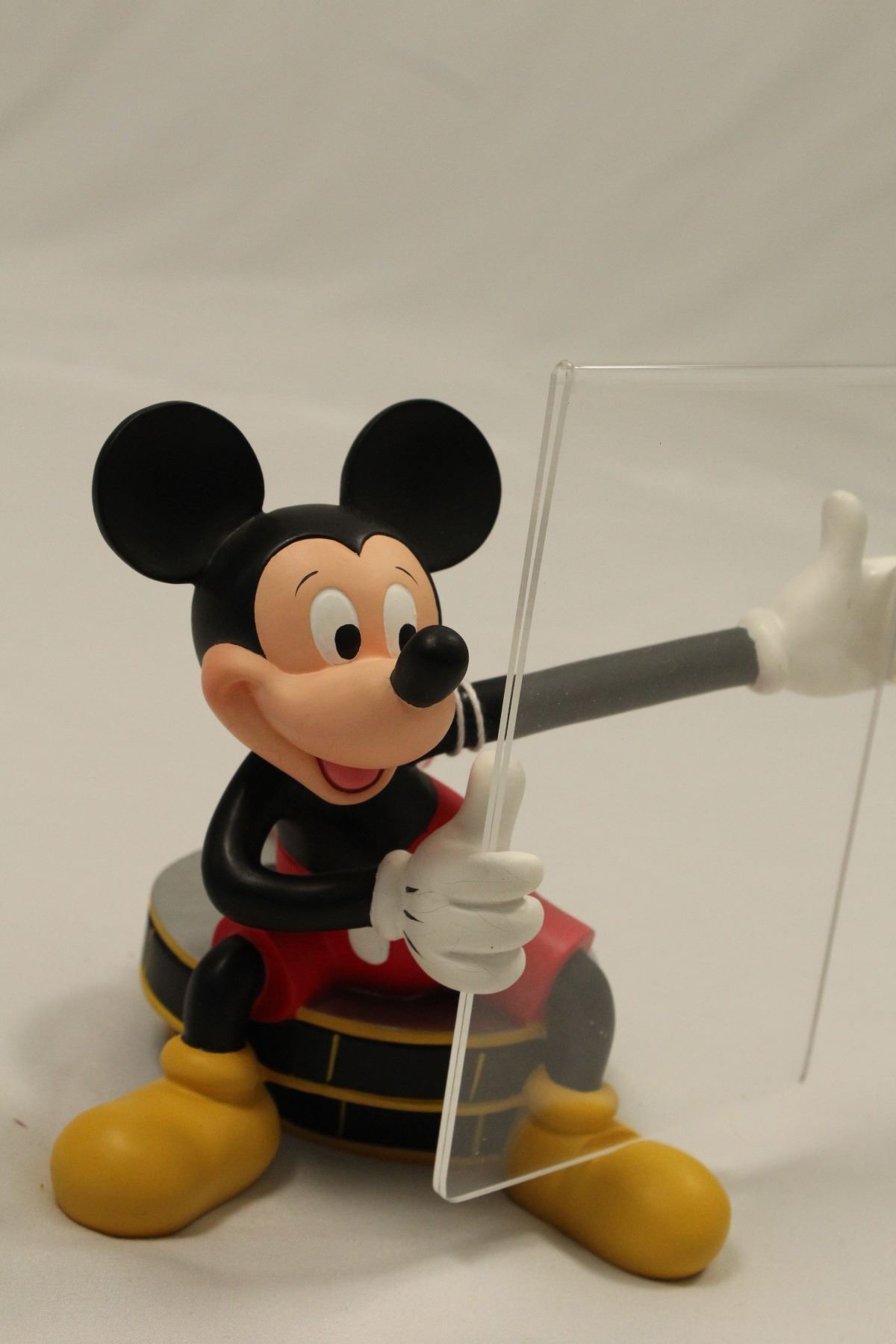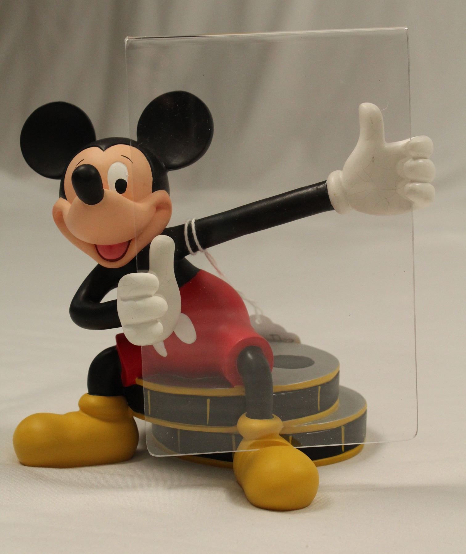 (Disney, 1990) This is a fantastic picture frame with Mickey Mouse, seated on two film reels, holding the plexiglass picture frame. This resin, hand painted figure is in fine condition and measures 6.5" x 4.5" x 7".