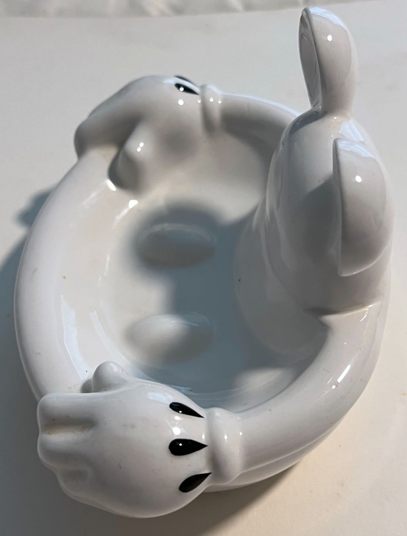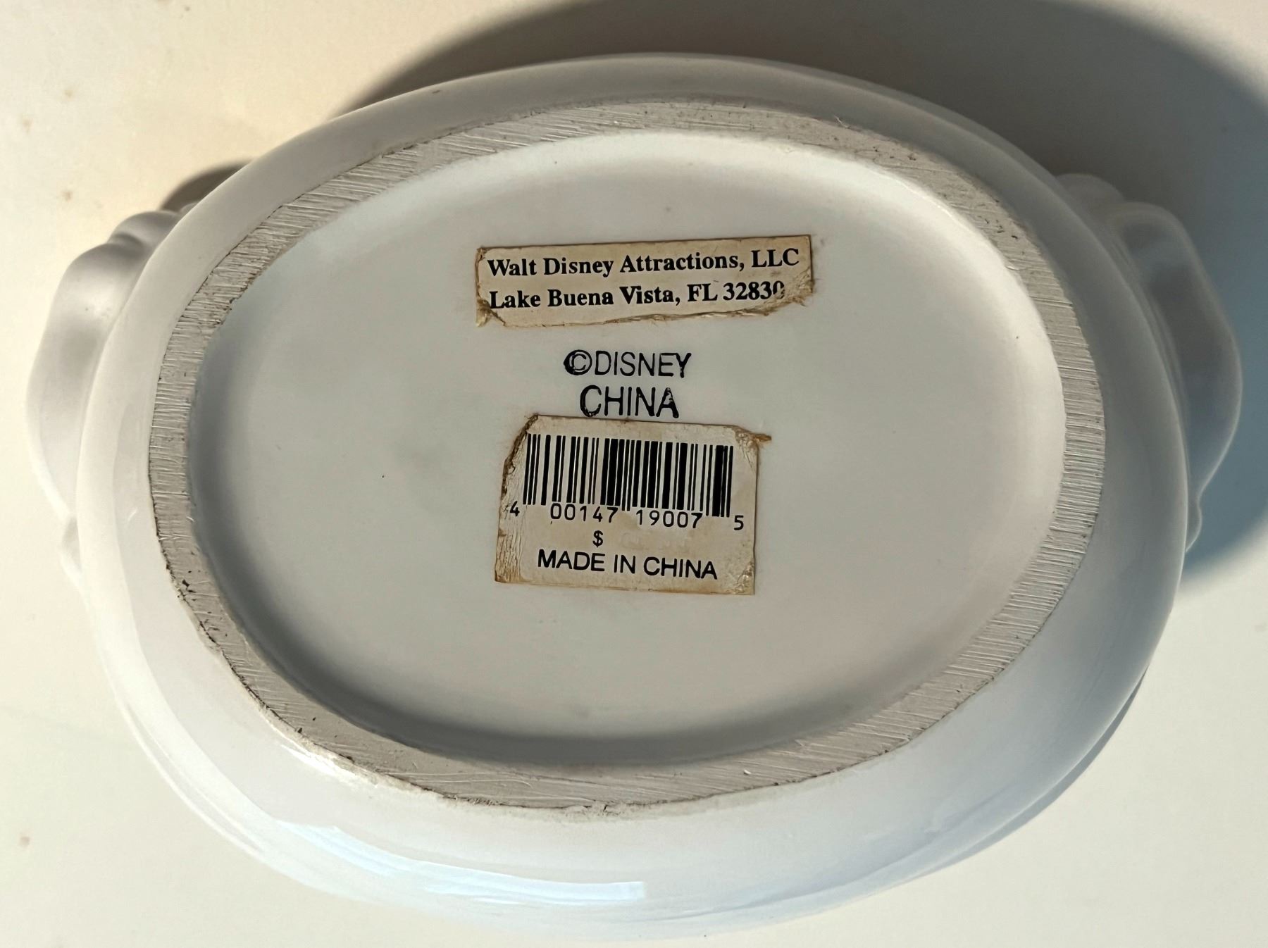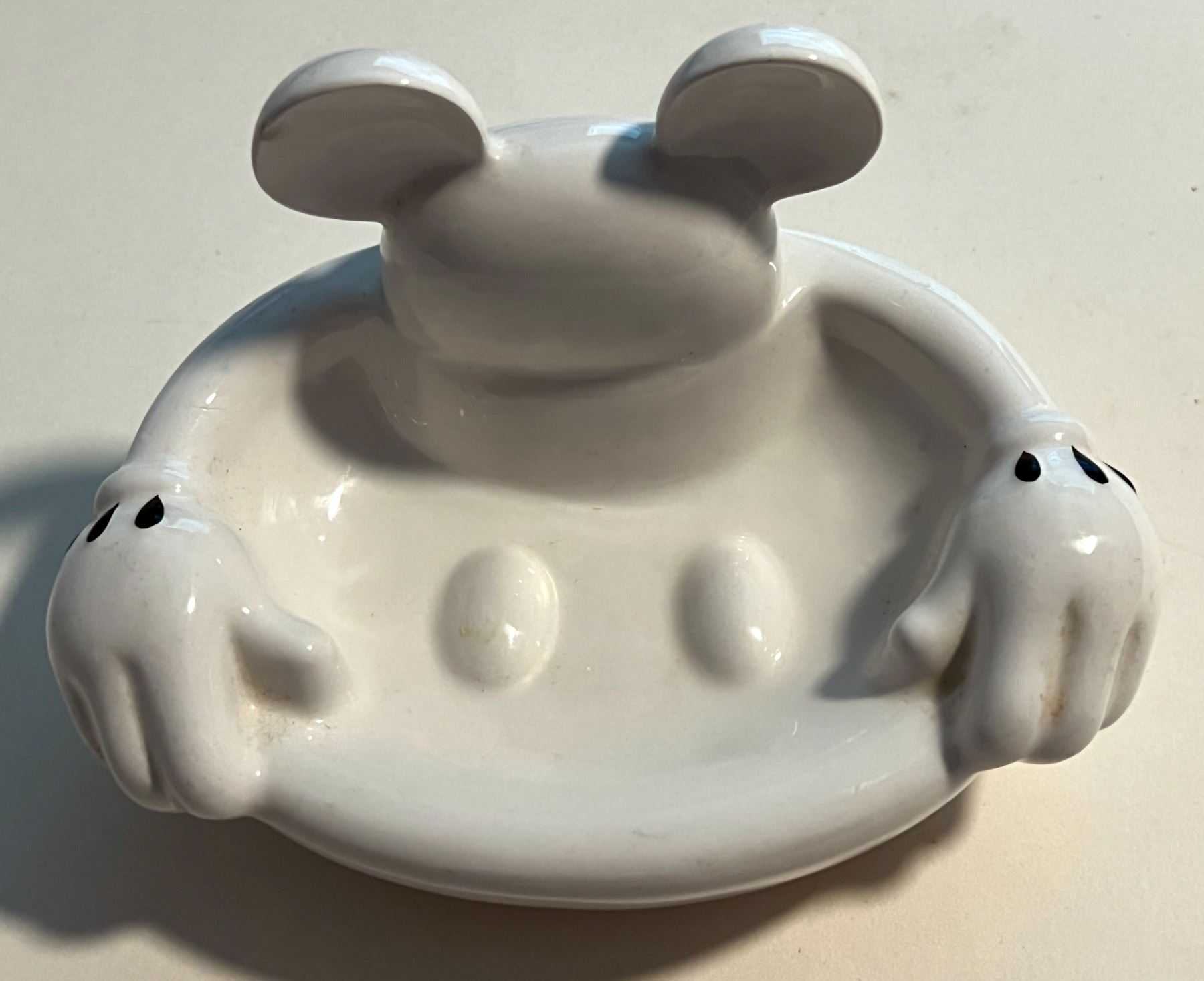 (Walt Disney Attractions) This is a white porcelain soap dish with Mickey's head, arms and hands wrapping around the rim of the dish. It is in fine condition. It measures 6.5" x 5" x 4" and weighs 10 oz.