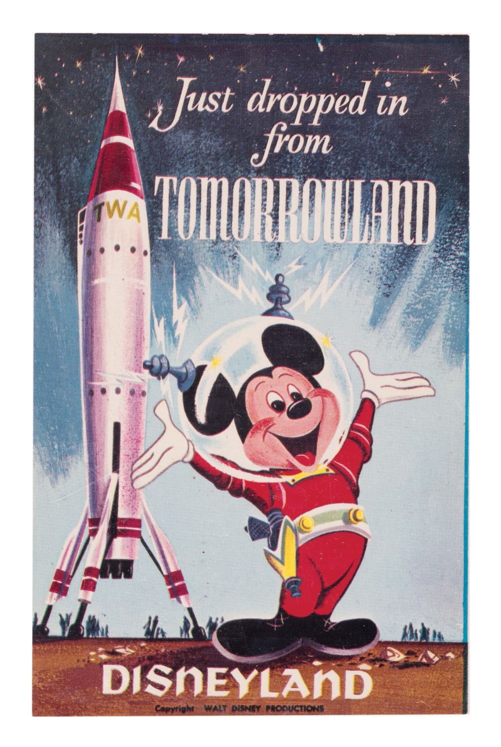 (Disneyland, 1950s-1966) A rare Disneyland postcard featuring Walt Disney's Mickey Mouse and the TWA Rocket to the Moon in the exciting realm of Tomorrowland. Measuring 3.5"x5.5", the unused postcard is in fine condition with a few signs of wear to edges and corners from handling and age.