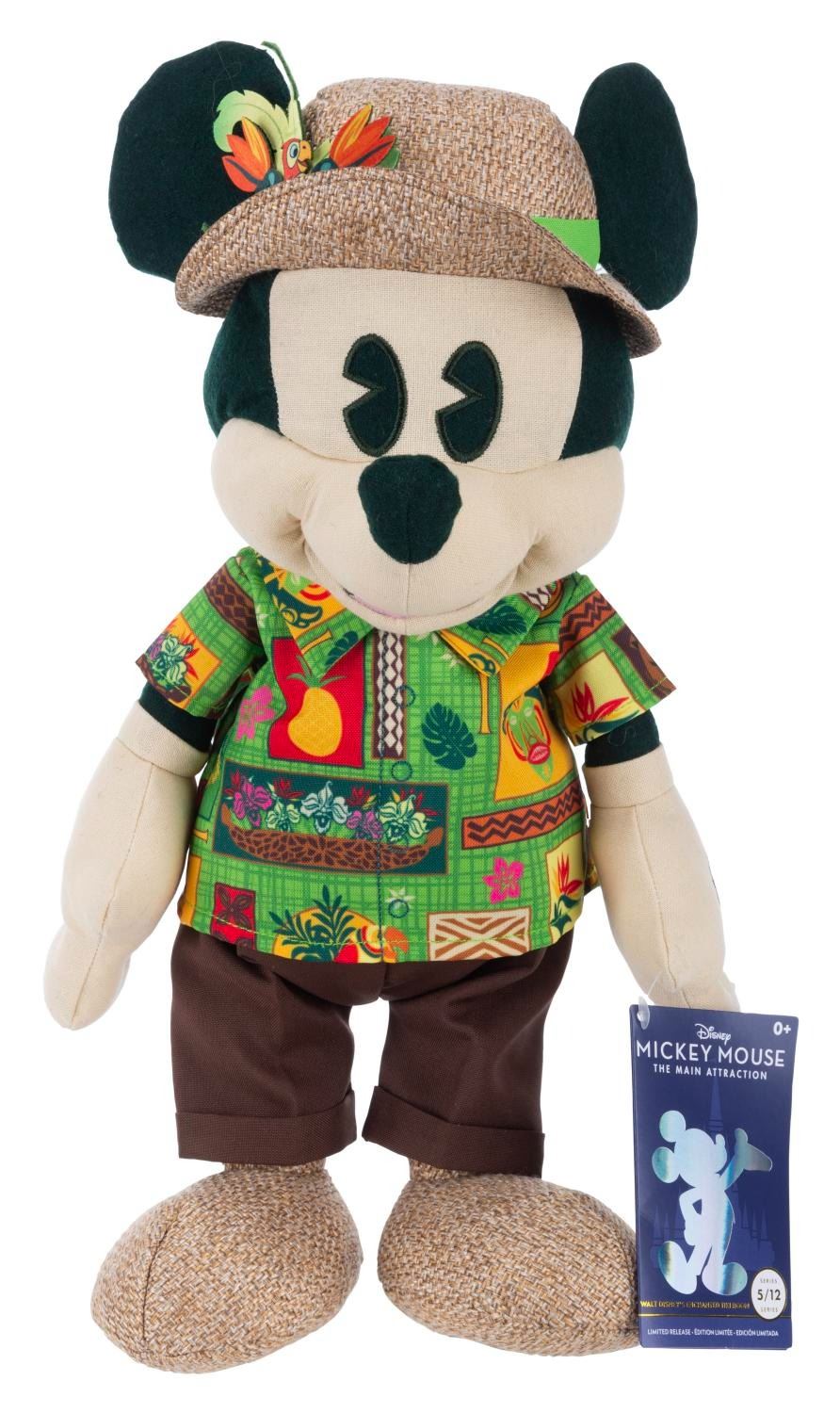 (Disney, 2022) A Walt Disney’s Enchanted Tiki Room-themed Mickey Mouse plush. This Mickey was released in Series 5 of the Mickey Mouse: The Main Attraction merchandise line, celebrating Walt Disney World’s 50th anniversary. Measuring 9” x 7” x 16” tall, the plush is in fine condition.