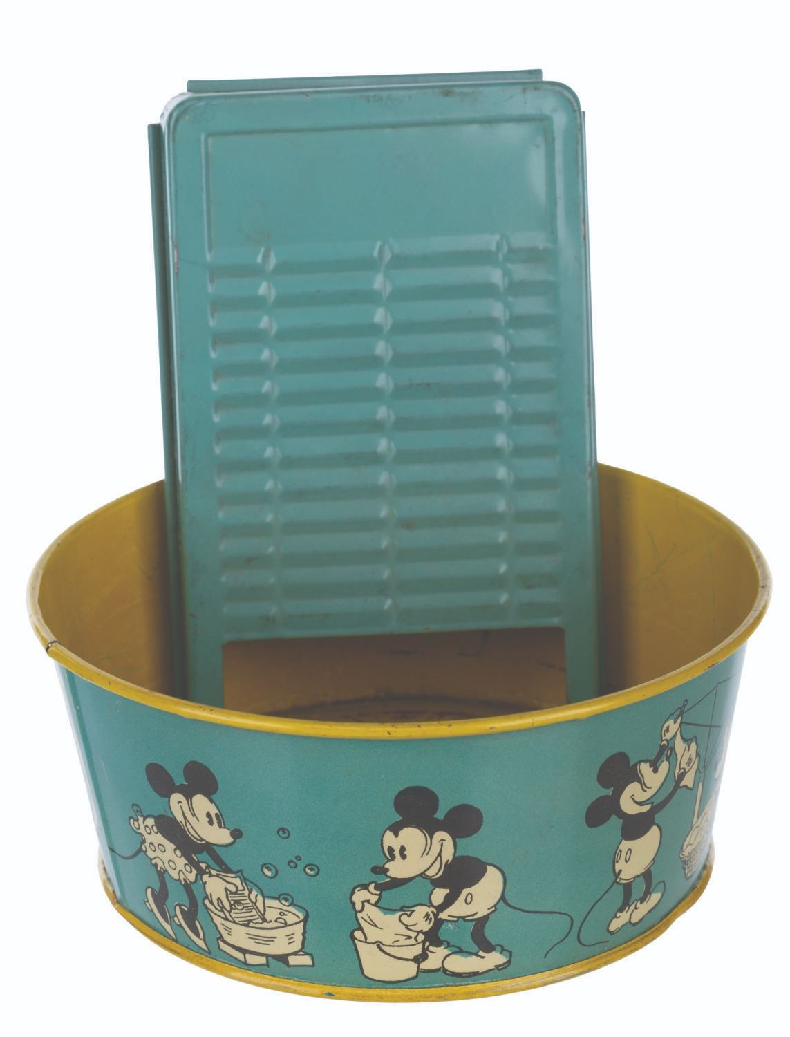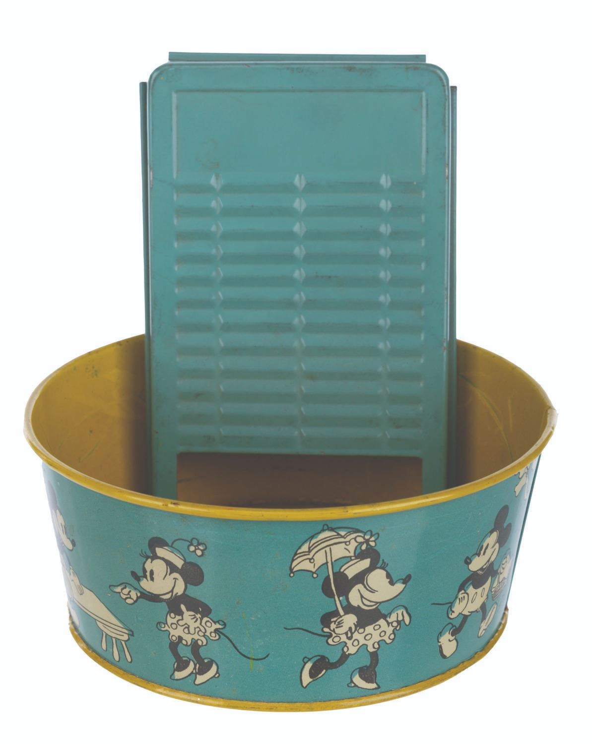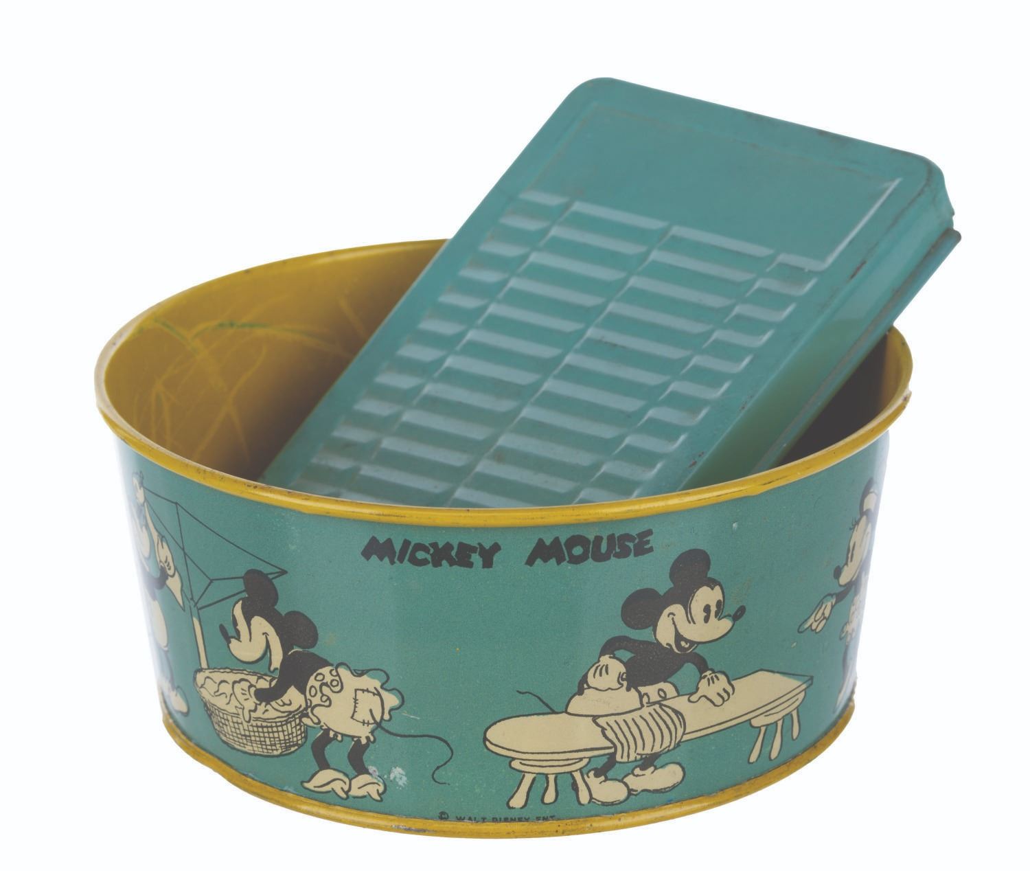 (Disney, 1930s) A Mickey Mouse tin litho toy wash bucket and washboard featuring images of Mickey and Minnie Mouse. Measuring 2.5" in diameter, the wash bucket is in good condition with wear from use and many scratches inside. The washboard measures 3.5" x 5.25" and is in good condition with wear and oxidation from age.