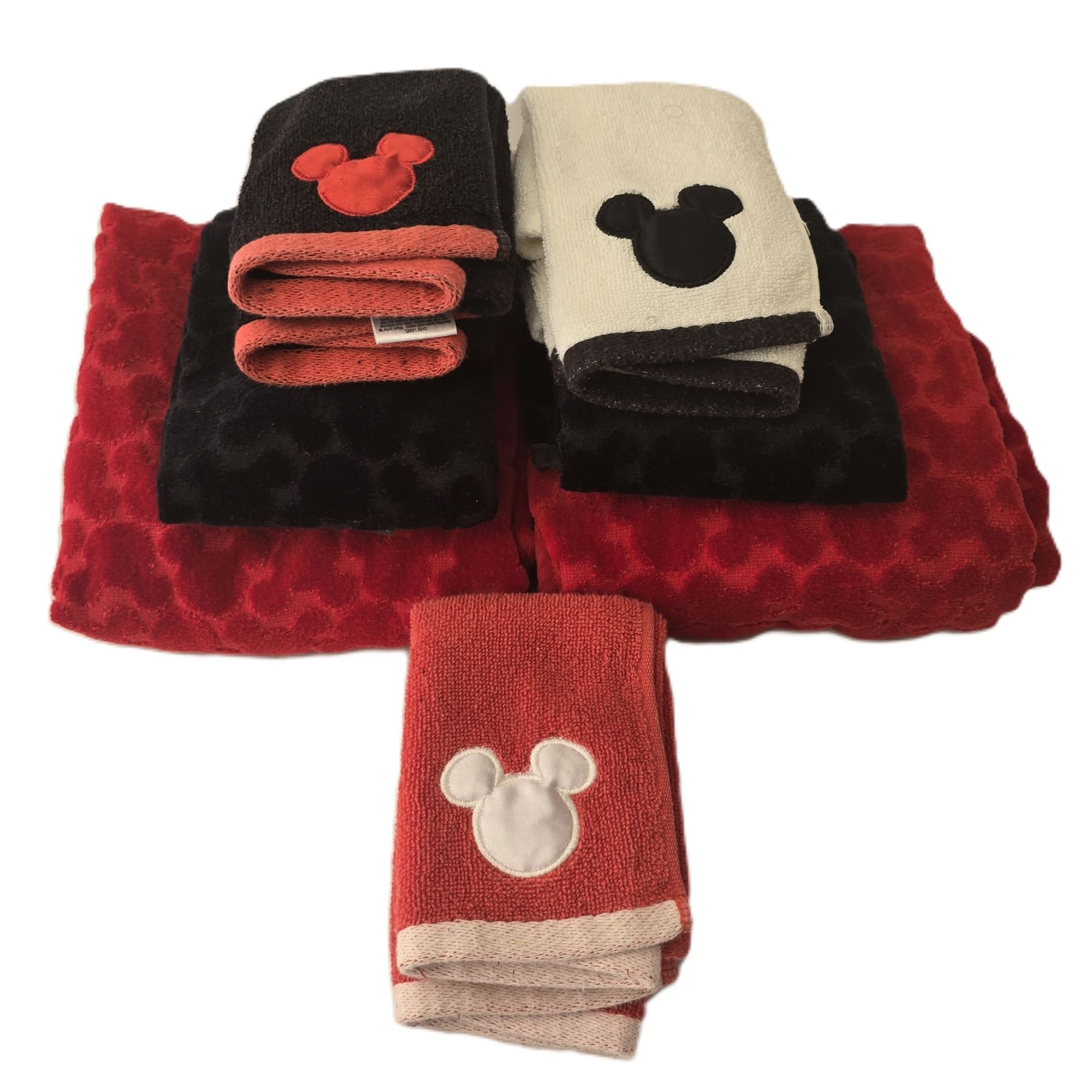 This is a 10-piece Mickey Mouse embroidered towel set. The set includes towels in red, black and white. The set is 100% cotton and is in great condition as it was only used for display. It features two large body towels, two medium hand towels and six embroidered face cloths, all featuring Mickey head icons. All together it measures 9" x 10" x 10" and weighs 2 lbs 10 oz.