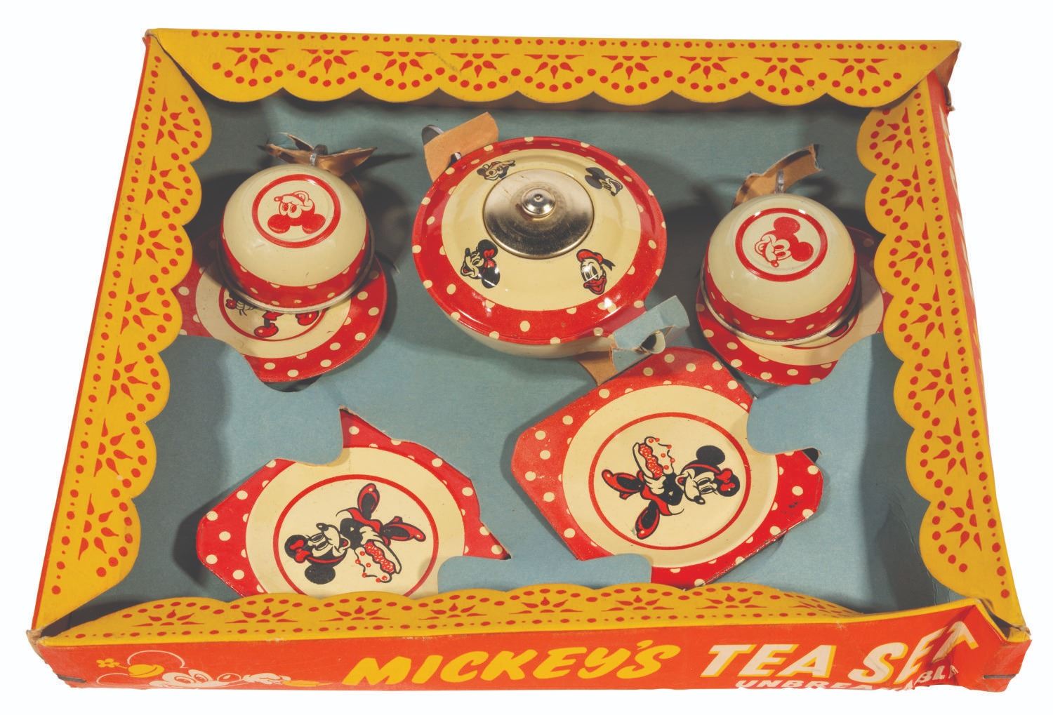 (Happynak, 1940s) A Mickey Mouse Unbreakable Tea Set by Happynak of England. The tin lithograph set includes four plates, two cups, and one teapot, each decorated with Mickey, Minnie, and Donald. The pieces are in very good condition overall with fading, minor scuffs, and wear. The original 10"x7.5"x1.5" good condition box exhibits creases, dents, and wear.