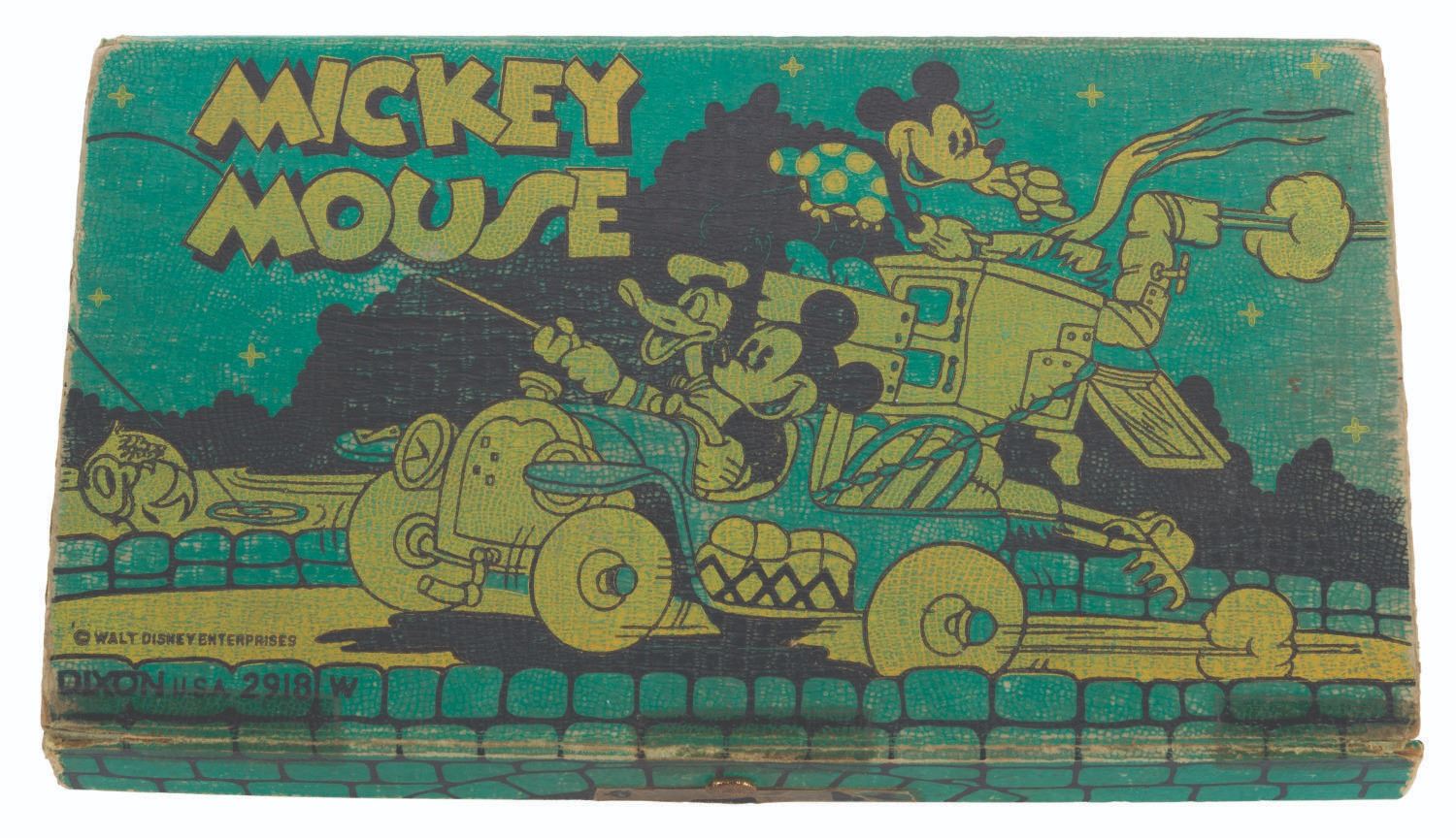 (Dixon, 1930s-1940s) A Mickey Mouse pencil case with school supplies. The case contains ten pencils, two erasers, two wooden rulers, two 1930s US maps, fountain pen nibs, scissors, two protractors, a pencil sharpener, and a tin Indian Head money saving bank. Measuring 6” x 11.5”, the pencil box is in fair, used condition with heavy soiling, adhesive repairs, pencil marks, edge wear, tears, and discoloration.