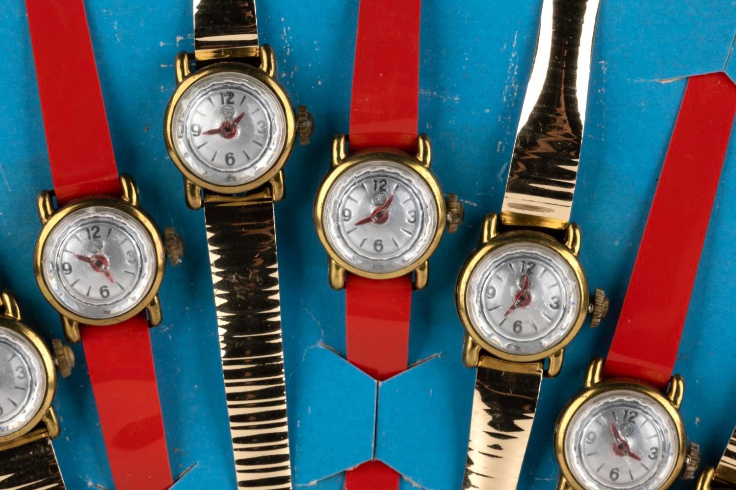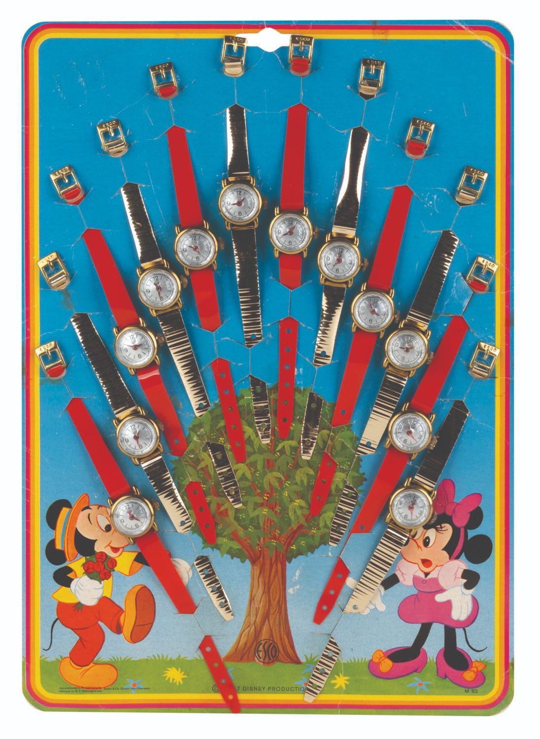 (Esco, 1970s) A rare intact set of twelve watches by Esco on a display board featuring Mickey Mouse and Minnie Mouse. The plastic watches, half gold and half red, likely require maintenance to work, though they are presented well on the display, which is mounted on foam core. Measuring 7” in length each, the watches are in very good condition with light scratches and wear, while the 8.25” x 11.75” board has scratches, stains, wear, and creases, notably at the top right corner.