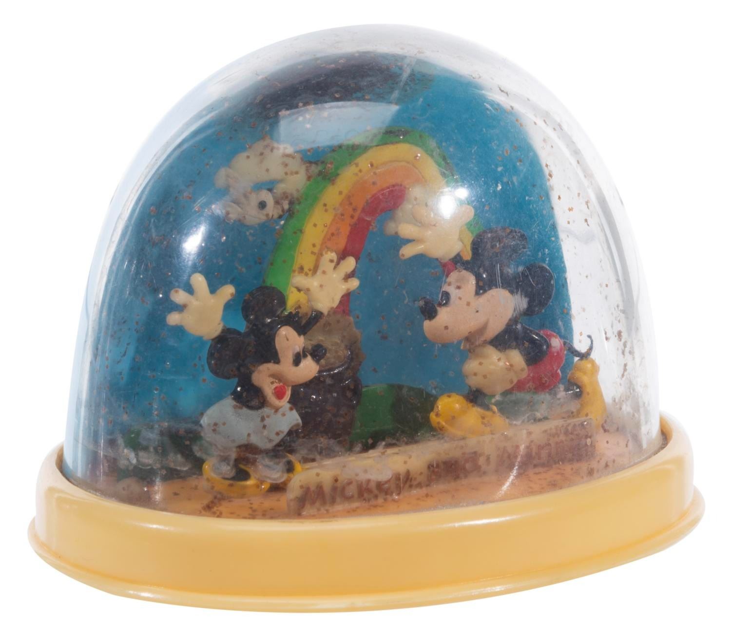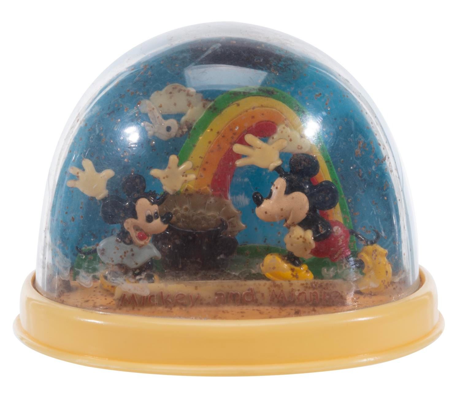(Disney, 1950s-60s) A snow globe of Mickey and Minnie Mouse in front of a rainbow and pot of gold. Measuring 3.25" x 4"x 3" tall, the snow globe displays in good condition with stains, wear, and no liquid inside.