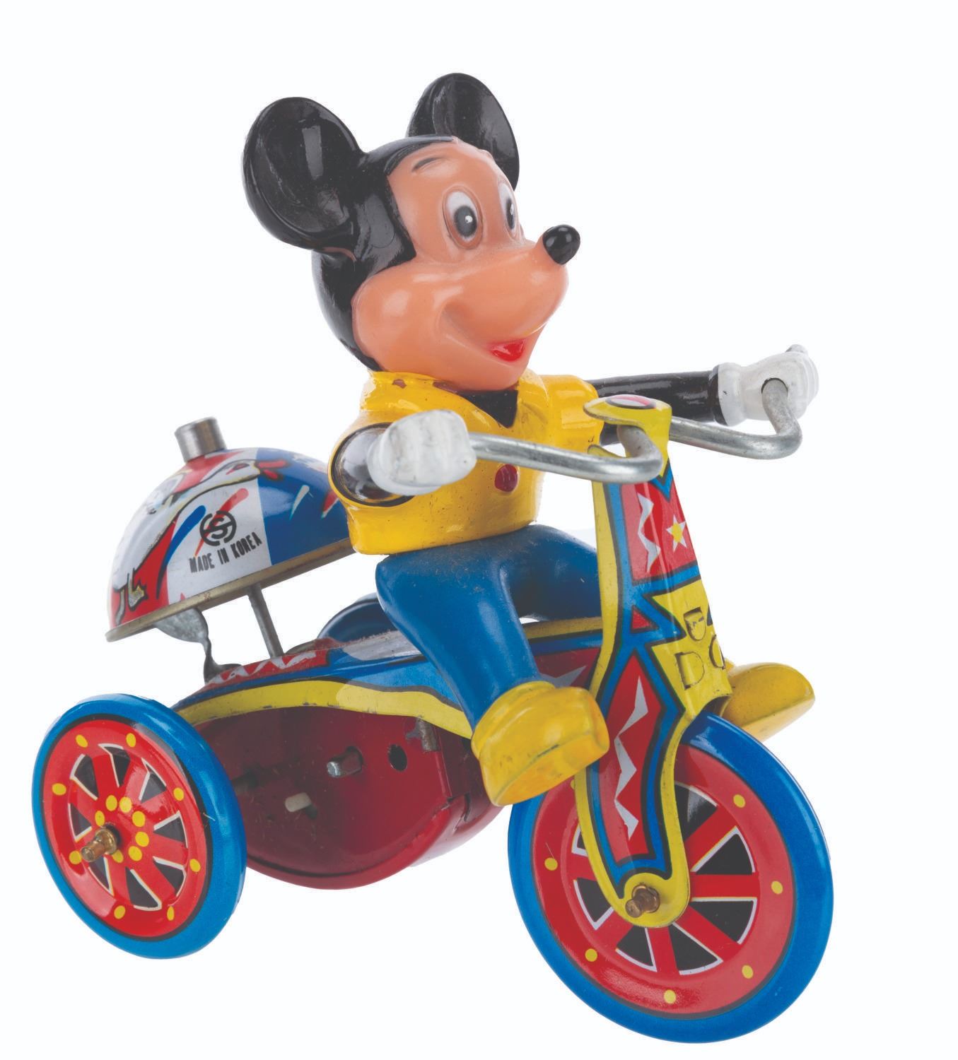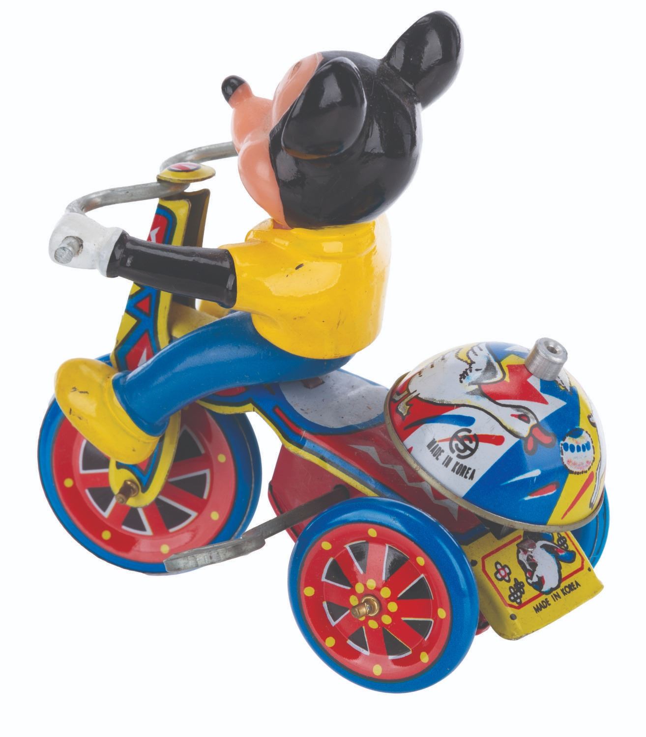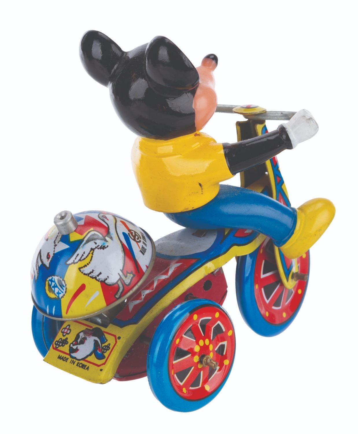(Korea, 1960s-70s) A tin litho Mickey Mouse tricycle toy made in Korea. When wound, the tricycle moves and the bell spins and rings. This toy has been tested and functions properly. Measuring 3.5” x 4.5” x 4.5” tall, the toy is in very good condition with light scuffs and paint loss.