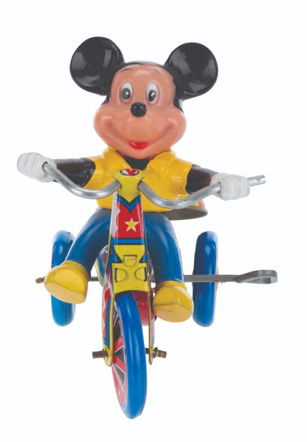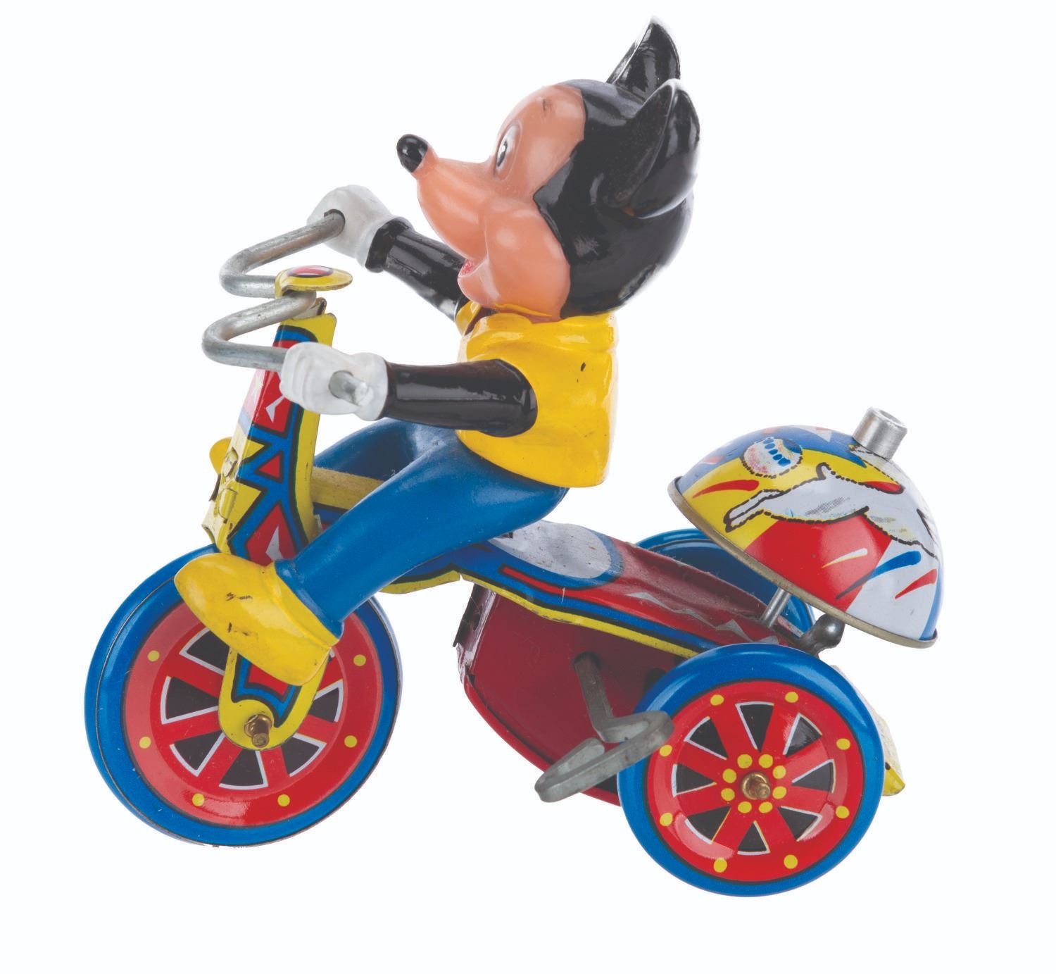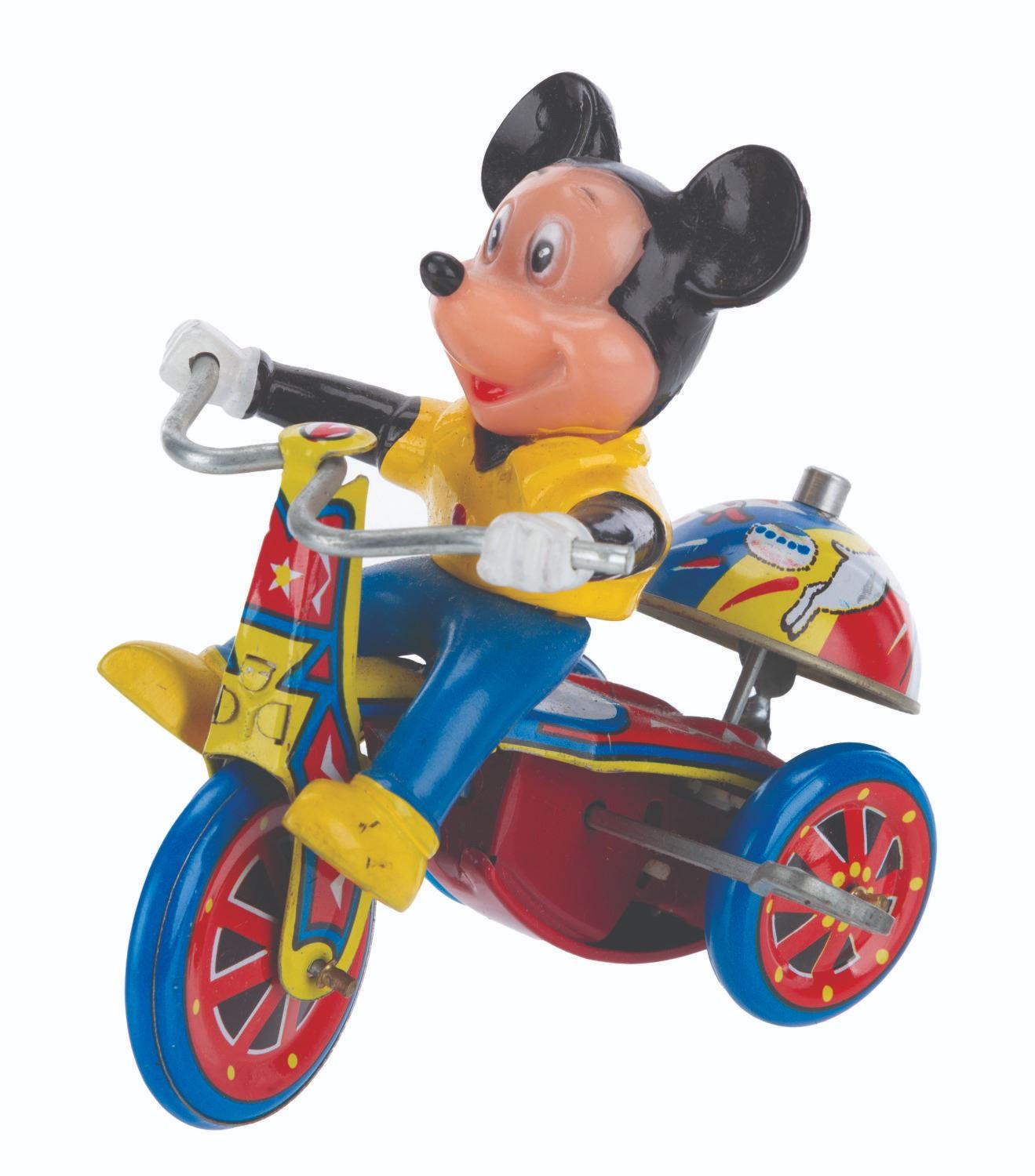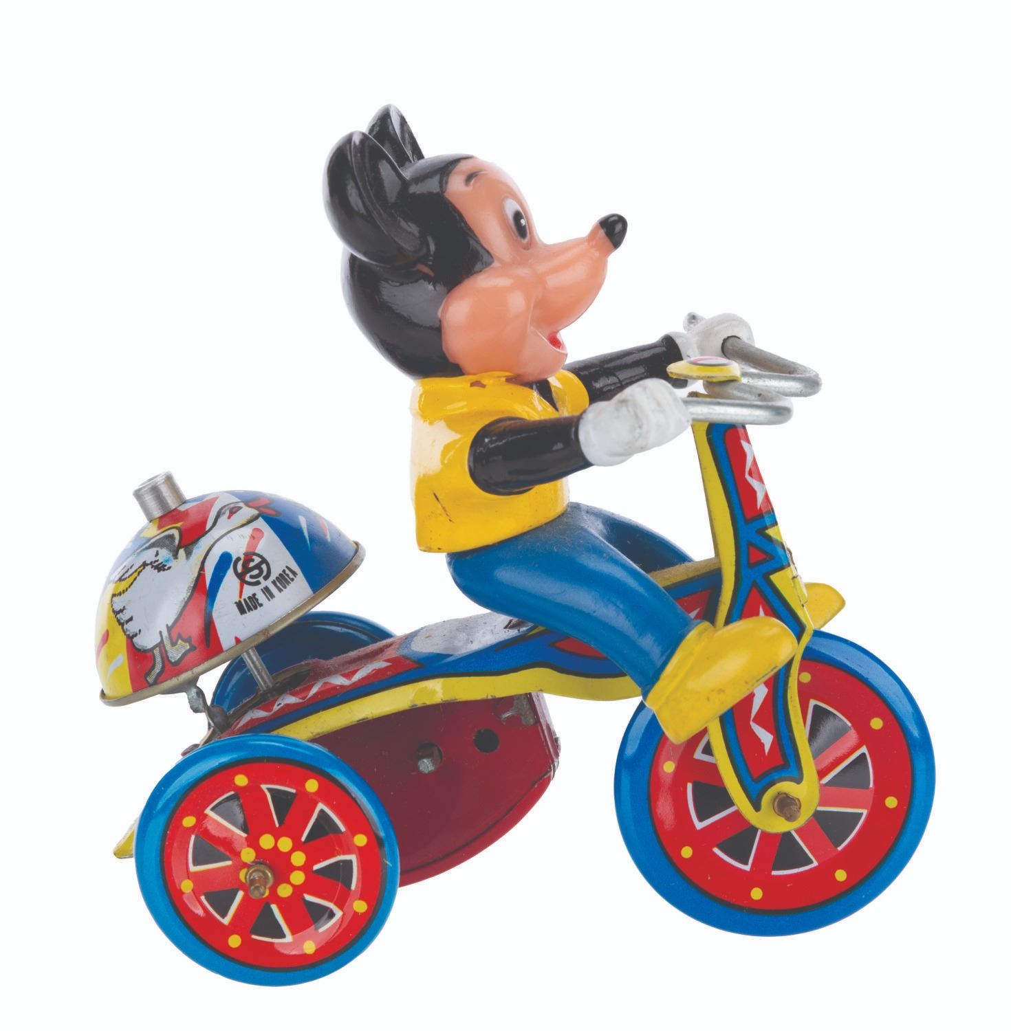 (Korea, 1960s-70s) A tin litho Mickey Mouse tricycle toy made in Korea. When wound, the tricycle moves and the bell spins and rings. This toy has been tested and functions properly. Measuring 3.5” x 4.5” x 4.5” tall, the toy is in very good condition with light scuffs and paint loss.