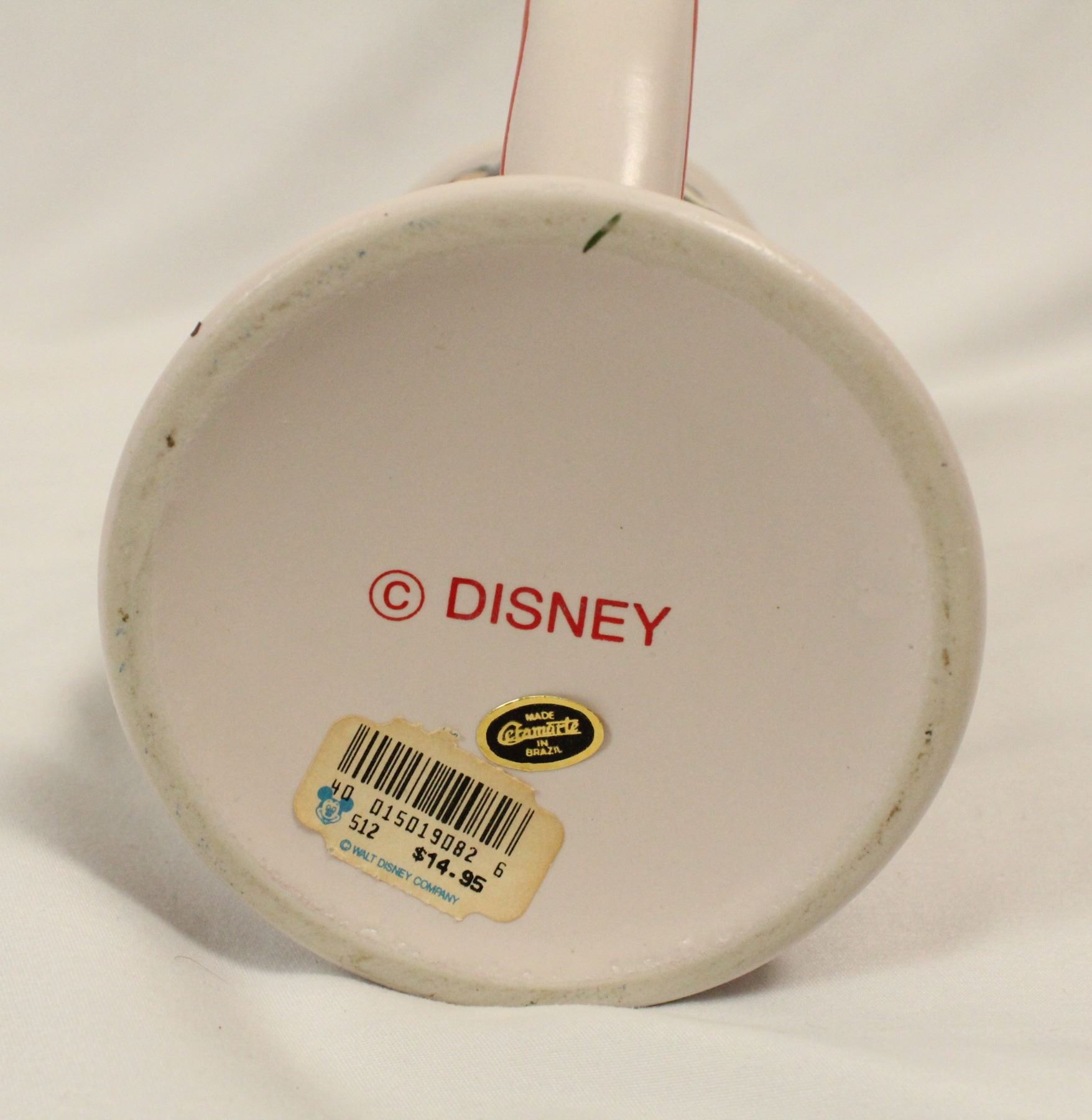 This is a ceramic stein produced by the Walt Disney Company that features 5 different images of Mickey Mouse from Steam Boat Willie to modern Mickey. It stands just over 6.5" tall and is in like new condition.