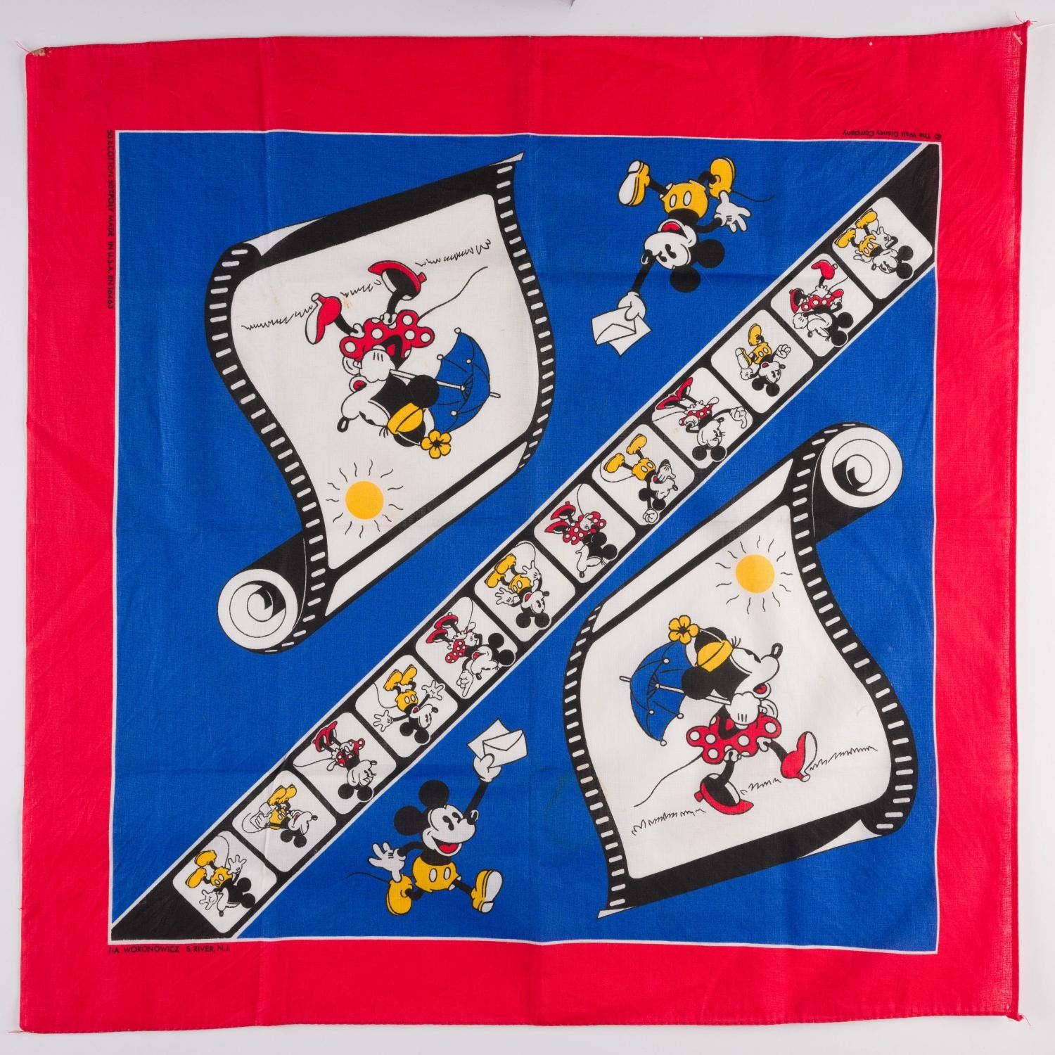 (Disney, 1990s) A handkerchief featuring Mickey and Minnie Mouse as they appeared in the early 1930s, on filmstrips. Measuring 22” x 22", the handkerchief is in very good condition with very light spotting and light handling wear.