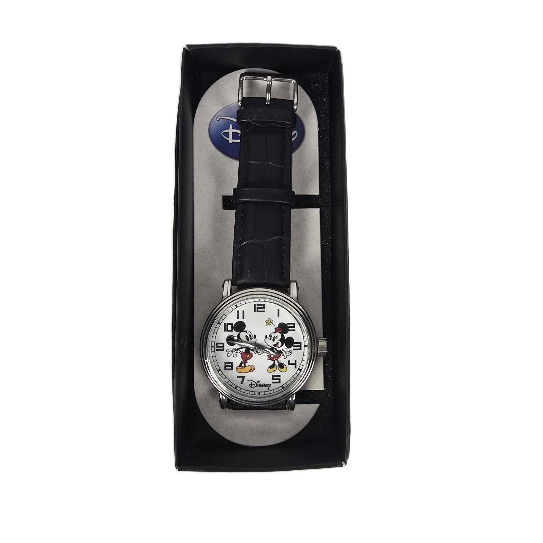 (Disney Store/Watchfactory) This is a large faced watch featuring a classic look, pie-eyed Mickey and Minnie Mouse holding hands on the face. It is in very fine condition and will need a battery replacement. The box measures 6” x 2.5” x 1.25” and weighs 3 oz.