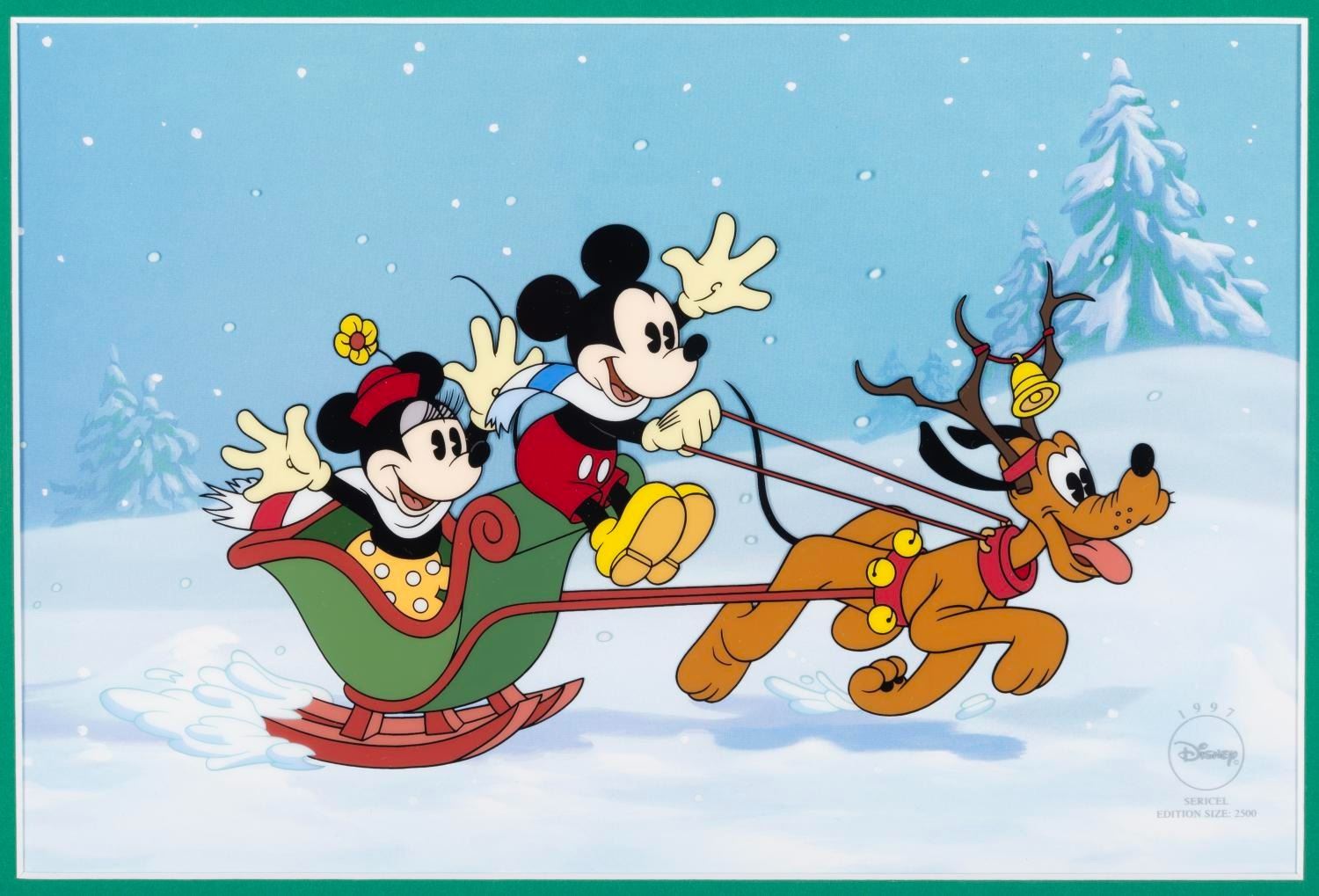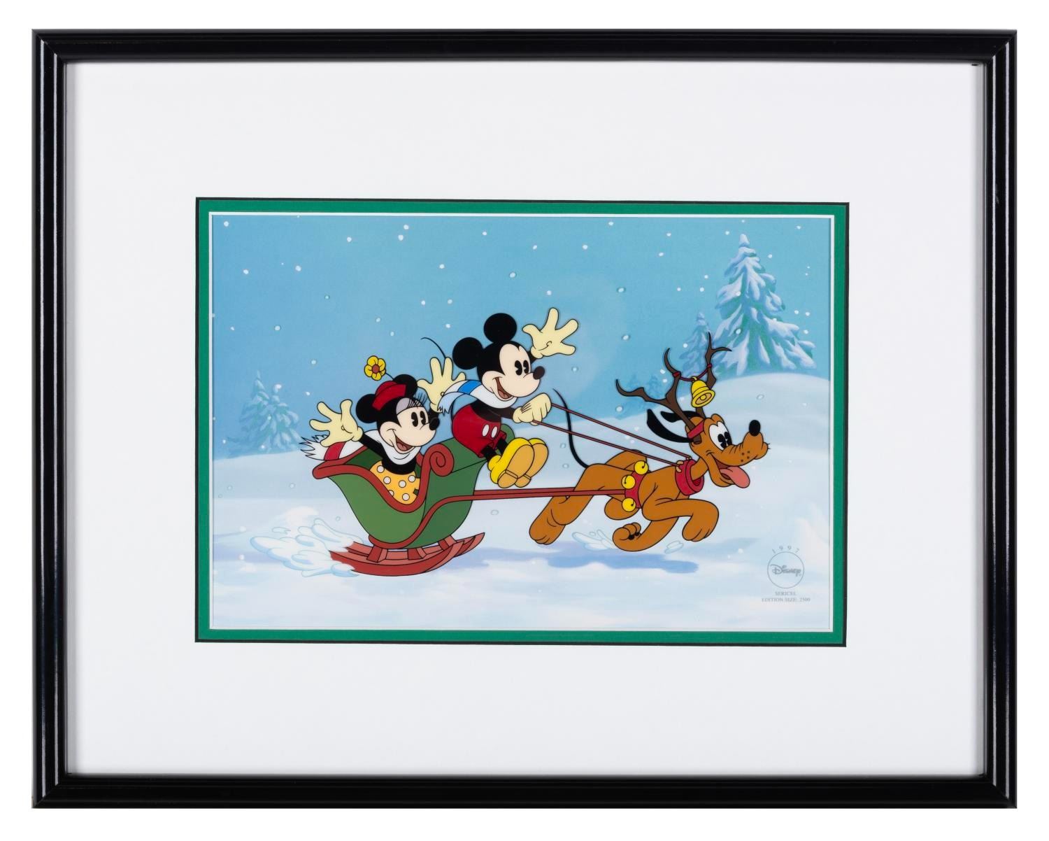 (Disney, 1997) A sericel of Mickey, Minnie, and Pluto titled"Sleigh Ride," released in a limited edition of 2,500. With a character size of 5.25" x 9" in an 8" x 12" visible framed matte, the piece is in fine condition.