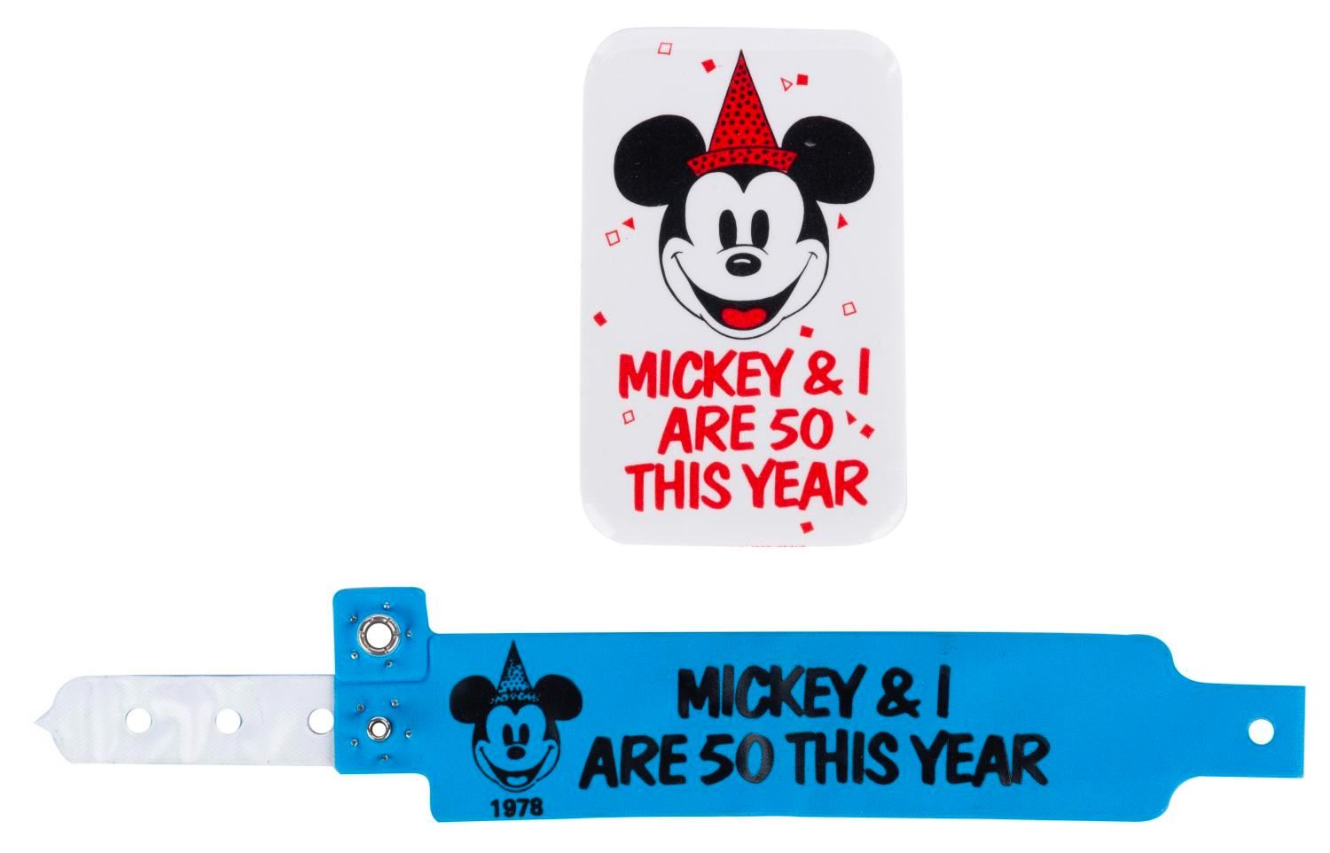 (Disneyland, 1978) A "Mickey & I Are 50 This Year" button and wristband. Measuring 1.5" x 2.75" and 1.5" x 11.75", the wristband and button are in very good condition with light wear from use plus rippling and a fold on the wristband.