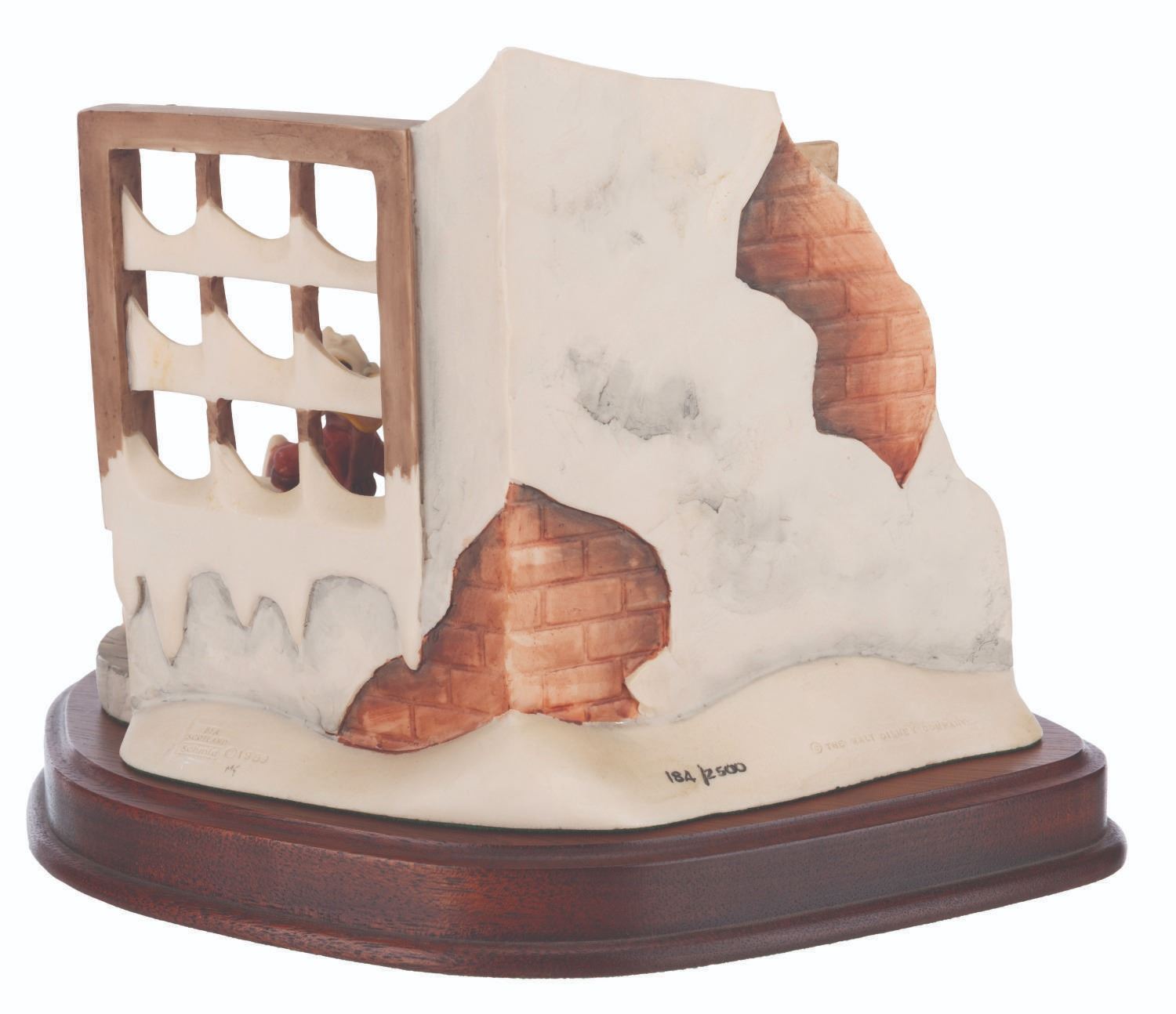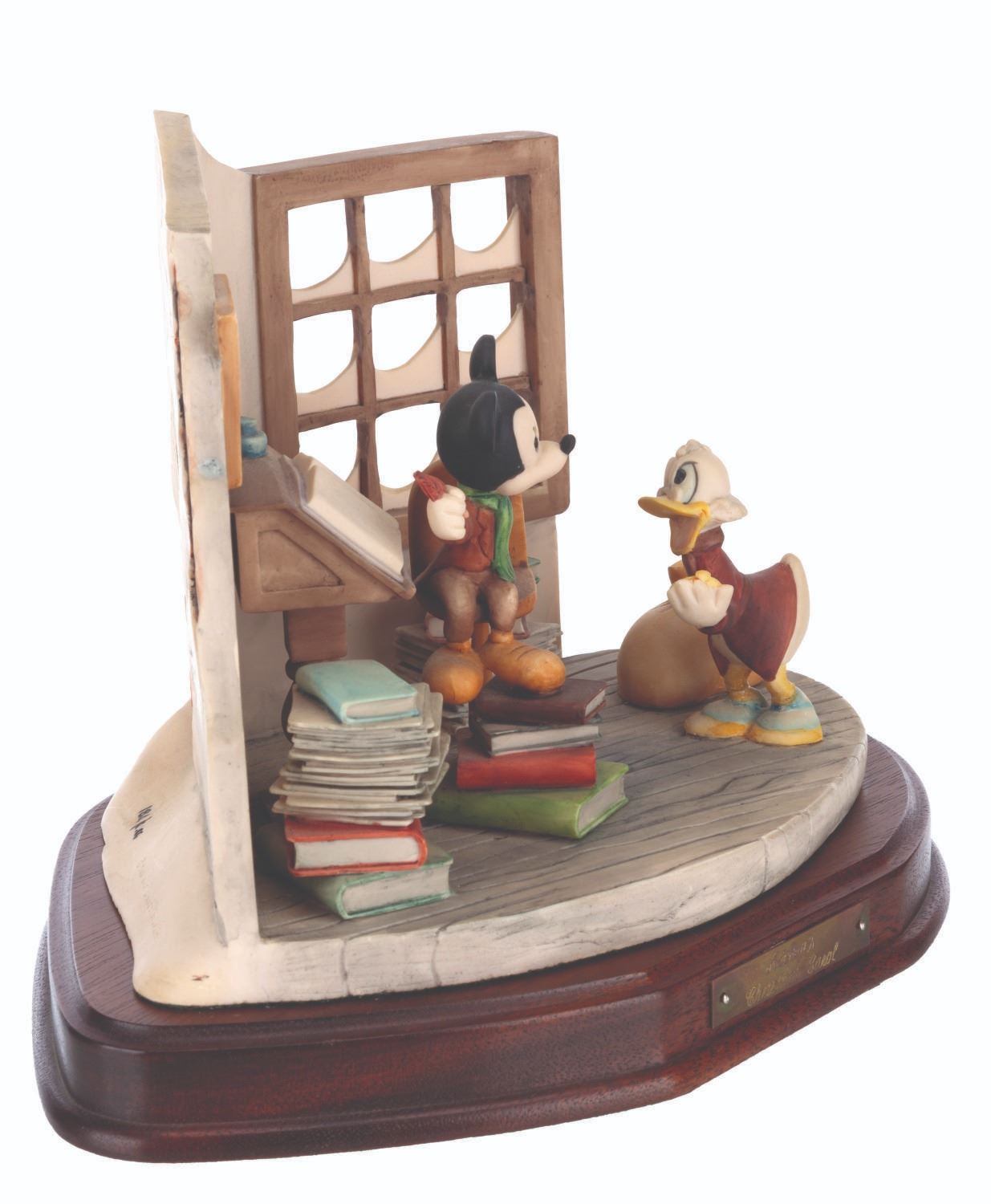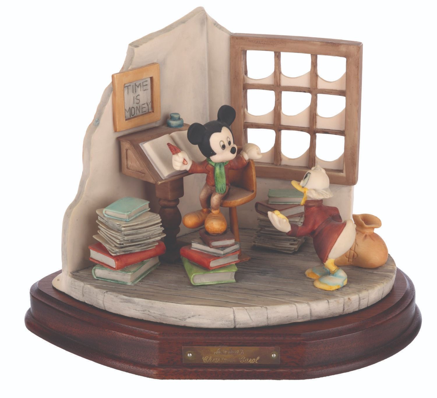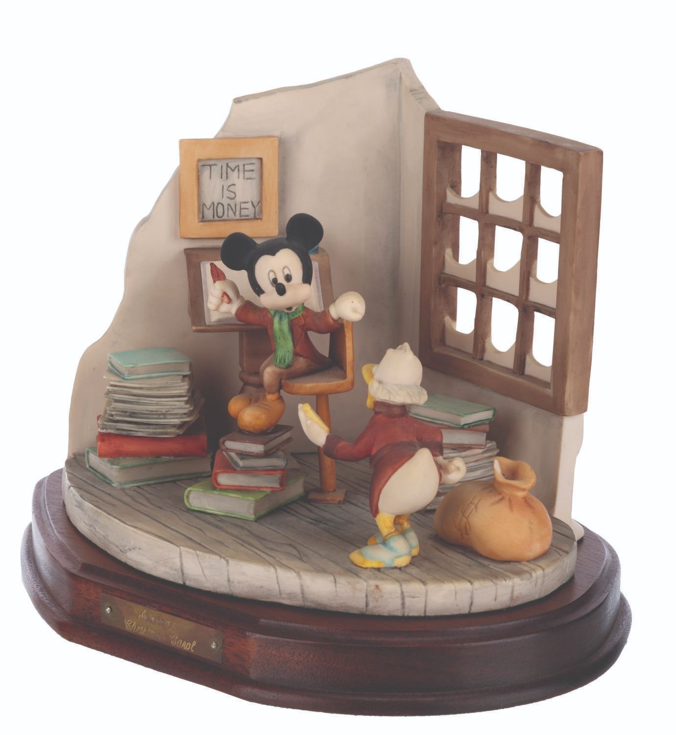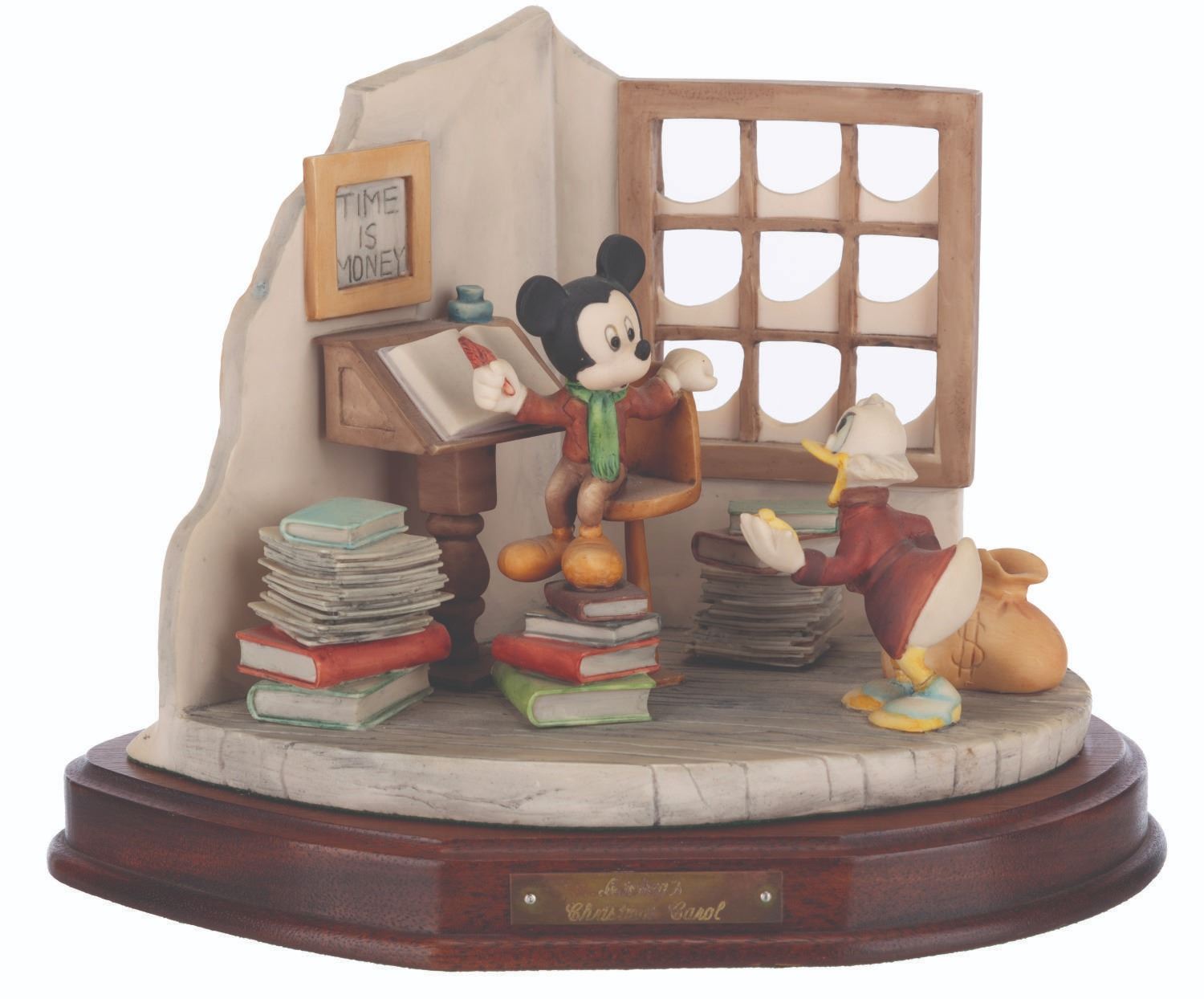 (Schmid, 1983) A ceramic sculpture depicting Mickey Mouse as Bob Cratchit and Scrooge McDuck as Ebenezer Scrooge from Disney’s “Mickey’s Christmas Carol.” Numbered 184/2500, the resin sculpture on a wooden base measures 6.5” x 9” and is in very good condition with light scratches, oxidation on the nameplate, and intentional distress.